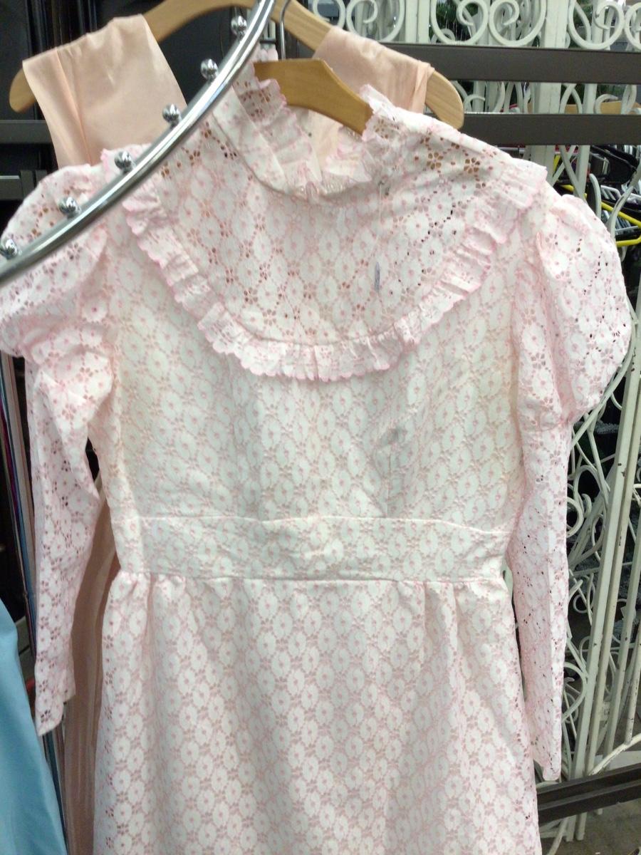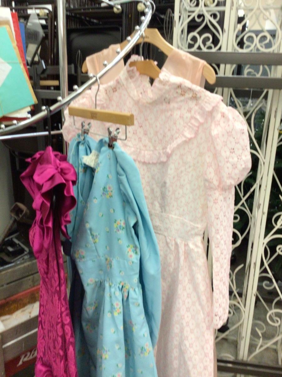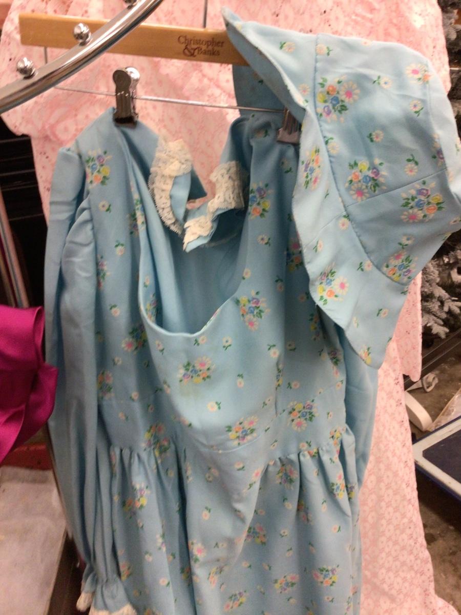 You get four dresses, peach dress (the hem is starting to detach) pink and white dress, blue with flowers and has matching hat, pink pink dress.