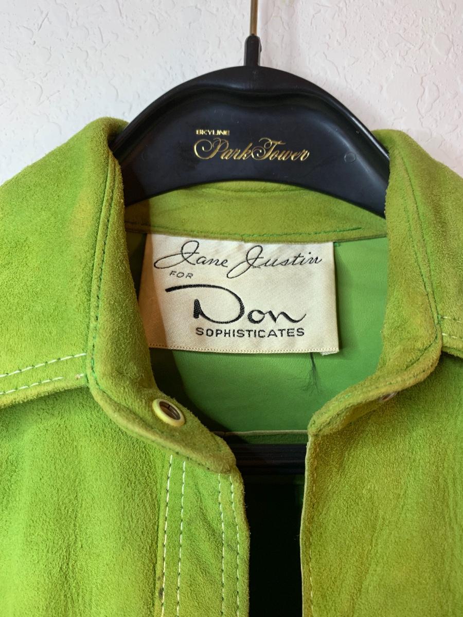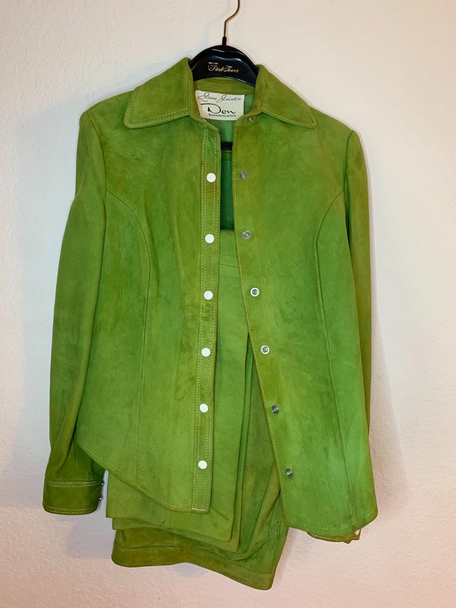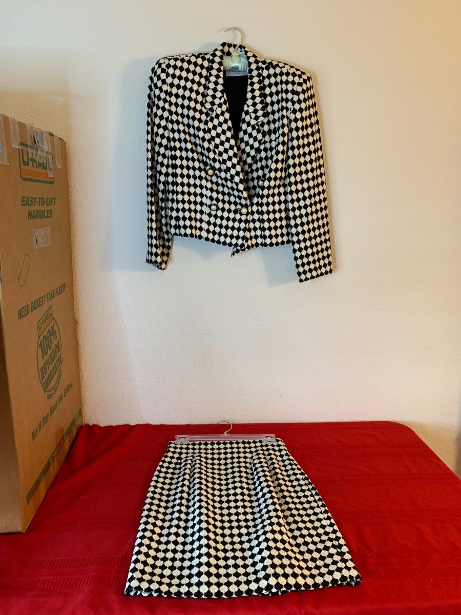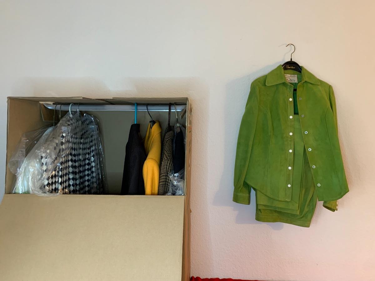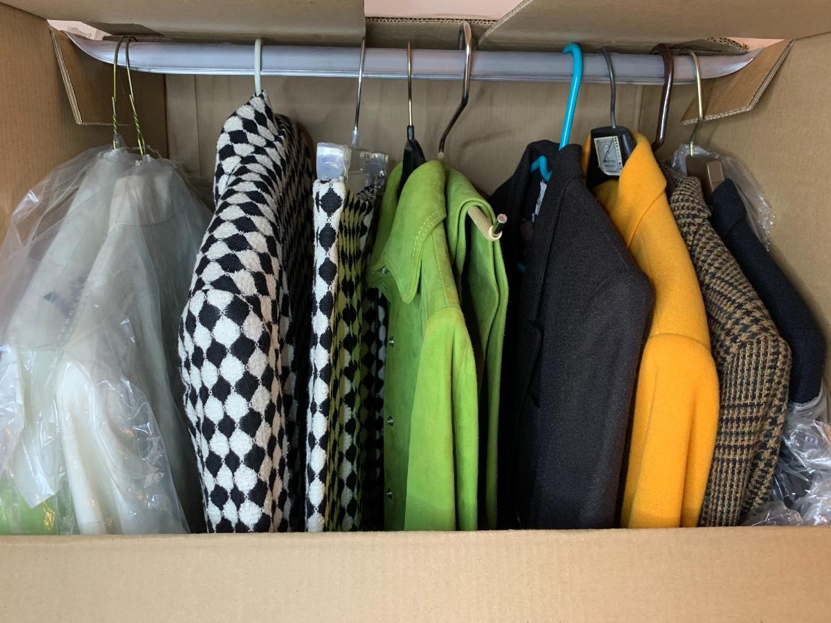 Moving box with hanging rack full of vintage jackets. Includes one green suede shirt and pant set by Jane Justin, 7 other blazers/coats and one skirt. Brands include Stephanie Andrews, Juliard, Savannah, Oleg Cassini and Casual Corner. All in excellent condition, well taken care of.