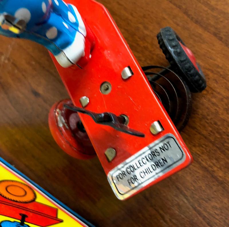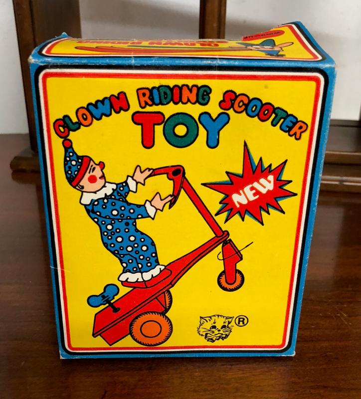 vintage CLOWN RIDING SCOOTER tin litho mechanical toy