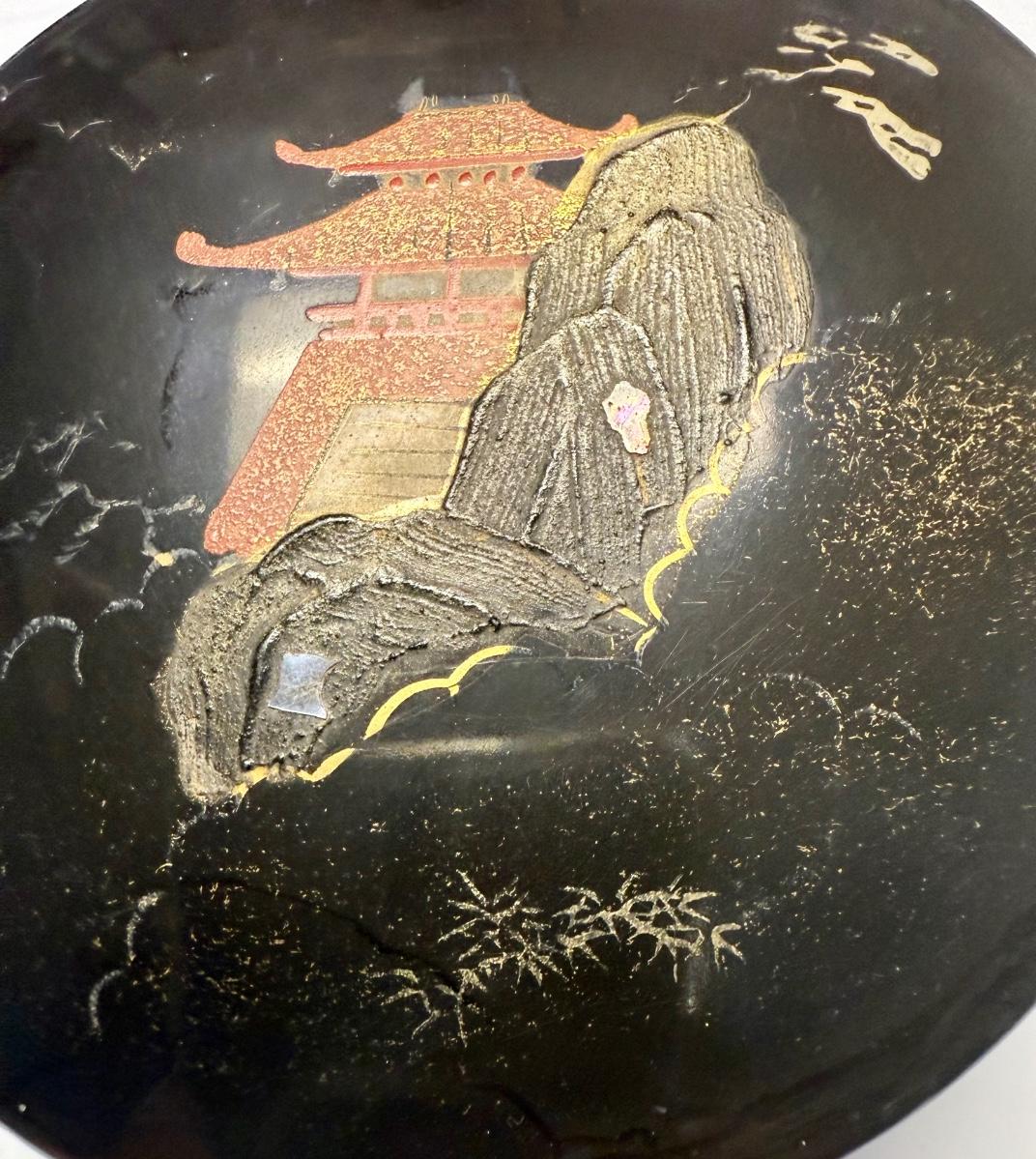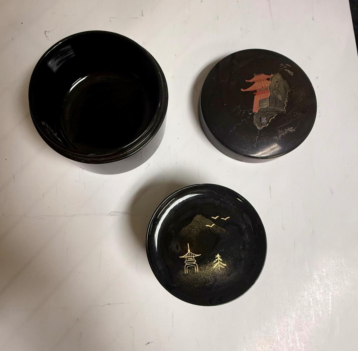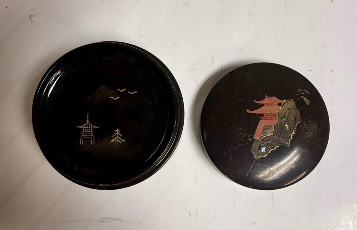 These have beautiful Japanese scenery on the box & coasters. Hand painted in 22k Gold, and some have Abalone.Six 3" round coasters. The round container with lid measures approx. 2.25" tall x 3.75". Good condition.1 coaster has some marks on it, see photos.