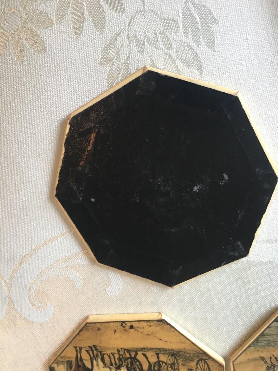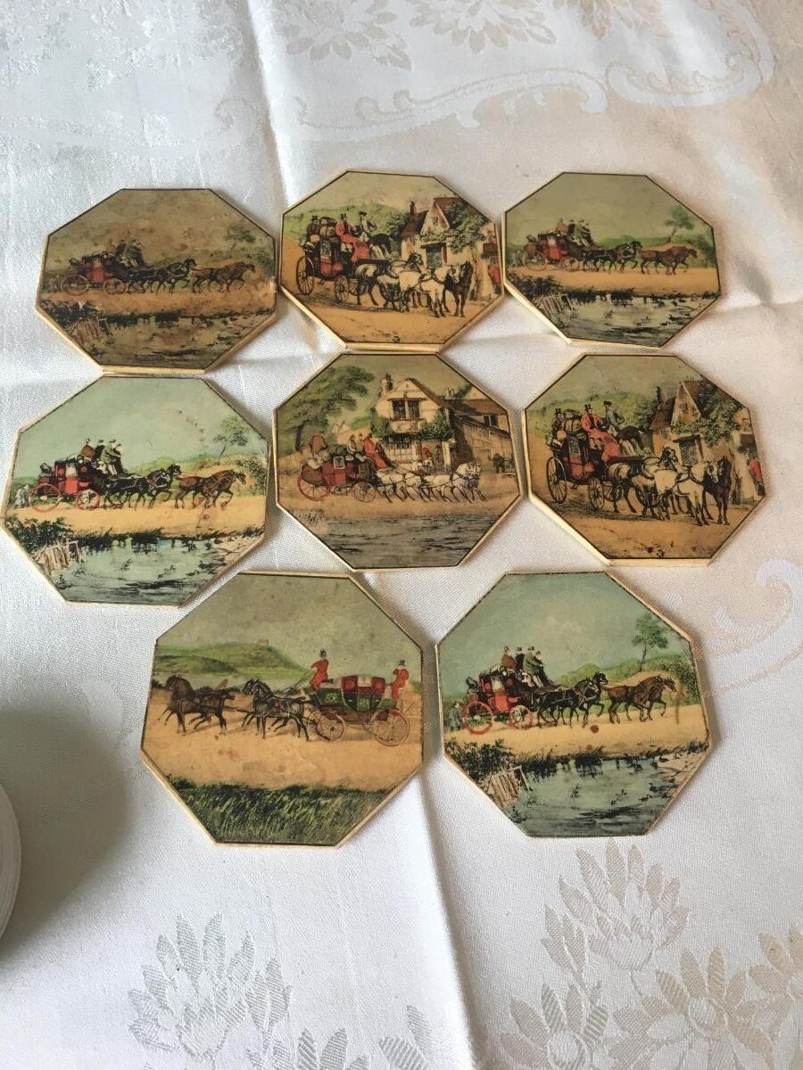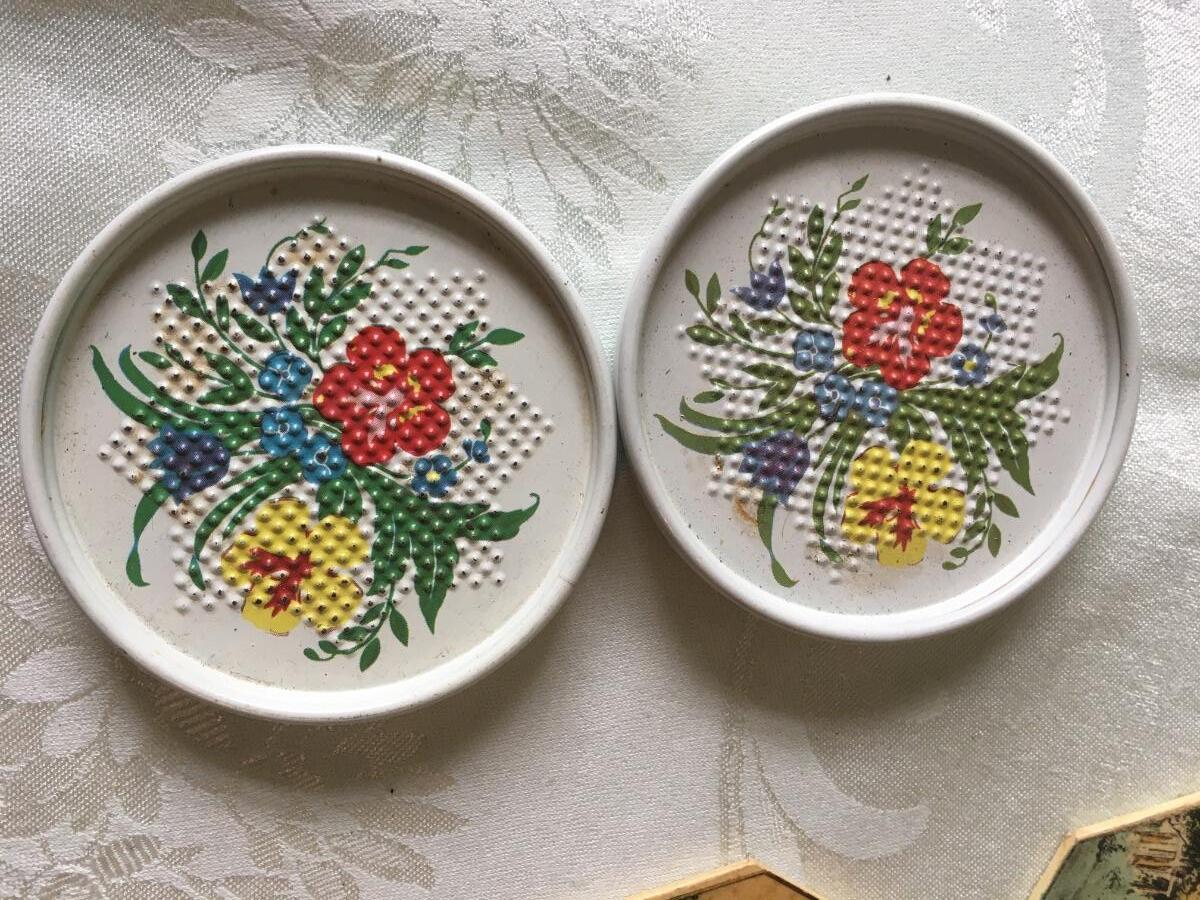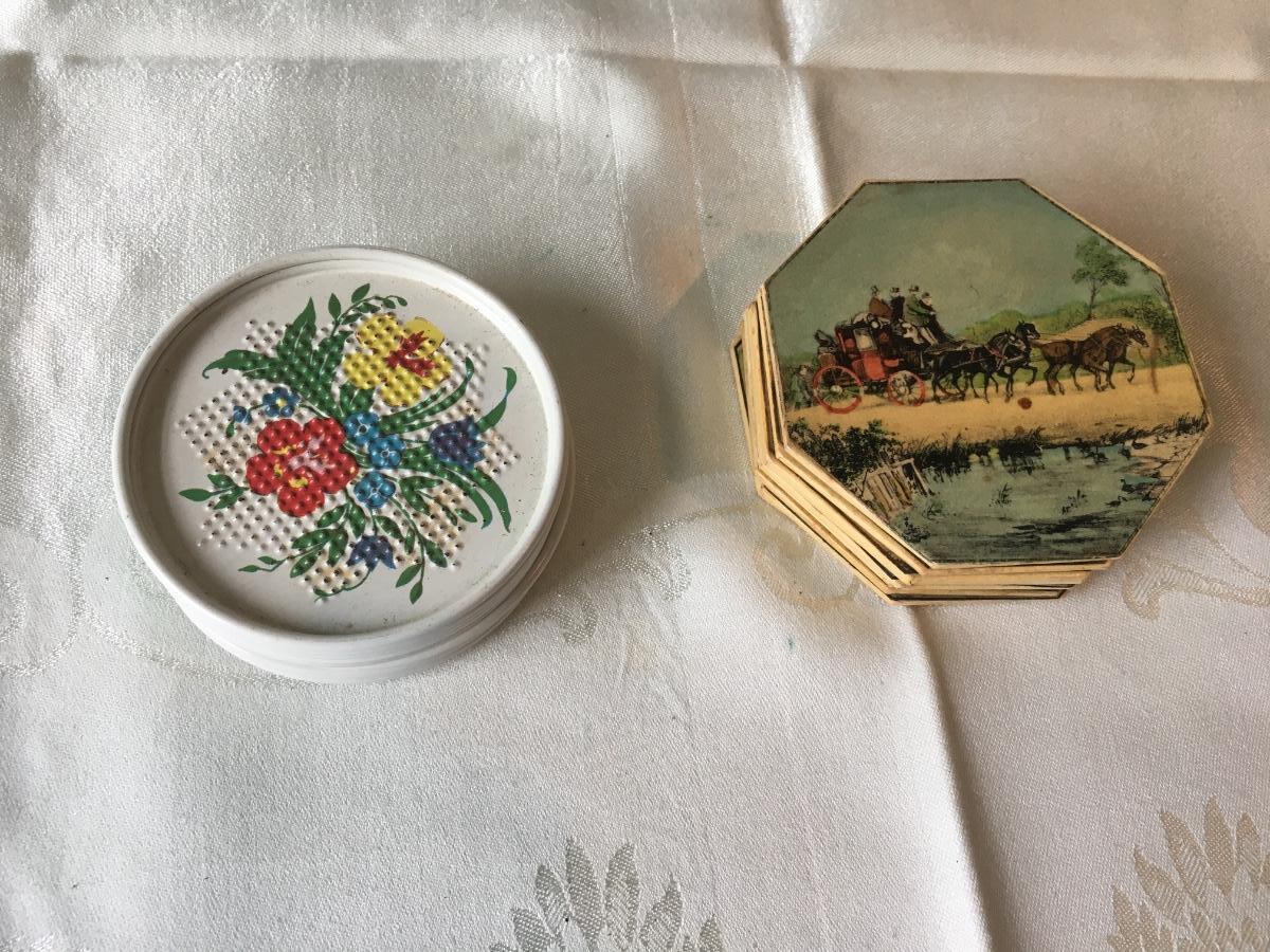 One set of cardboard coasters, one set if metallic floral themed coasters.