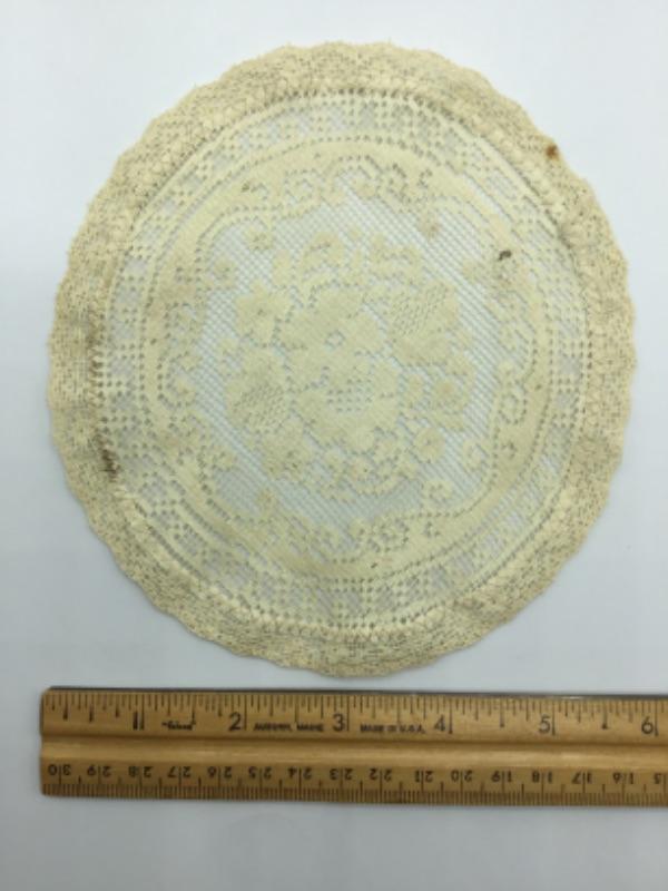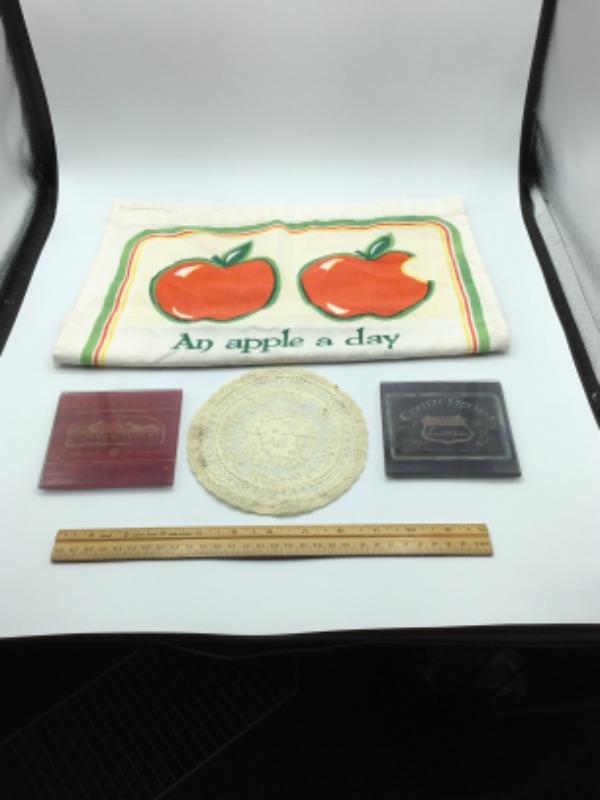 Vintage round doily, apple kitchen dish towel and two glass wine coasters. Doily measures 5 3/4", apple kitchen towel measures 15" x 25", and the coasters measure 4" x 4"