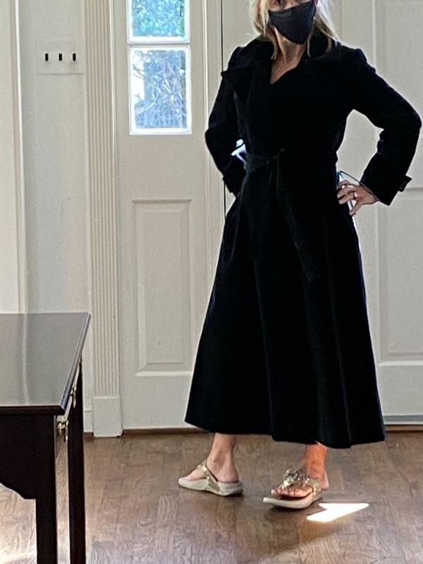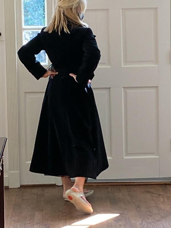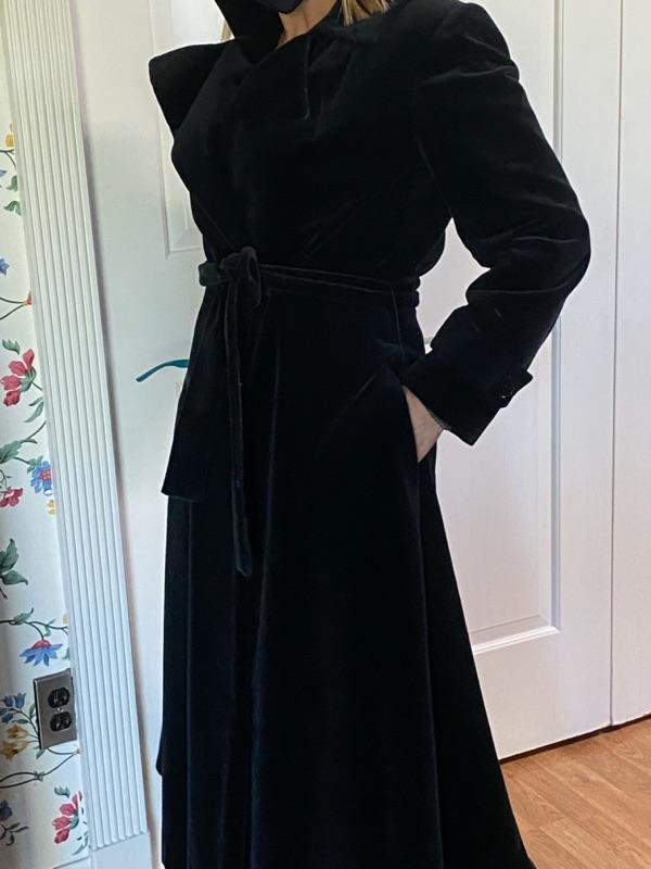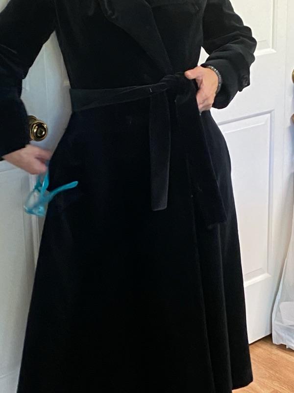 Vintage 1960s black velvet fully lined Gorgeous Swing Coat by well know designer Fairbrooke for Saks Fifth Ave. Equivalent to todays 2/4 measures. 29 inches waist, 15 1/2 inches shoulder to shoulder and, length is 50”. J