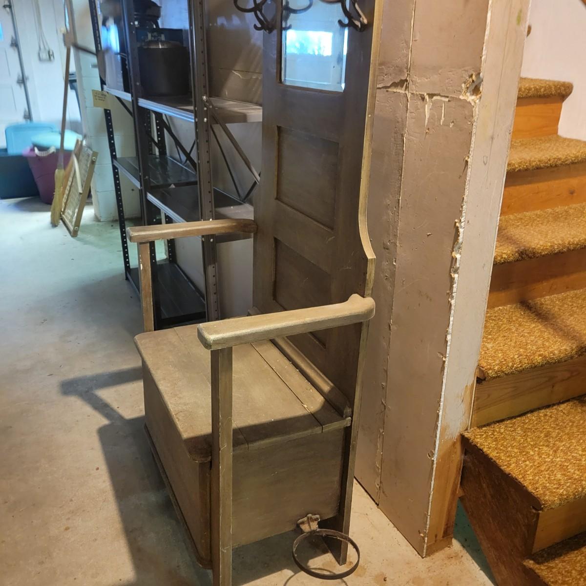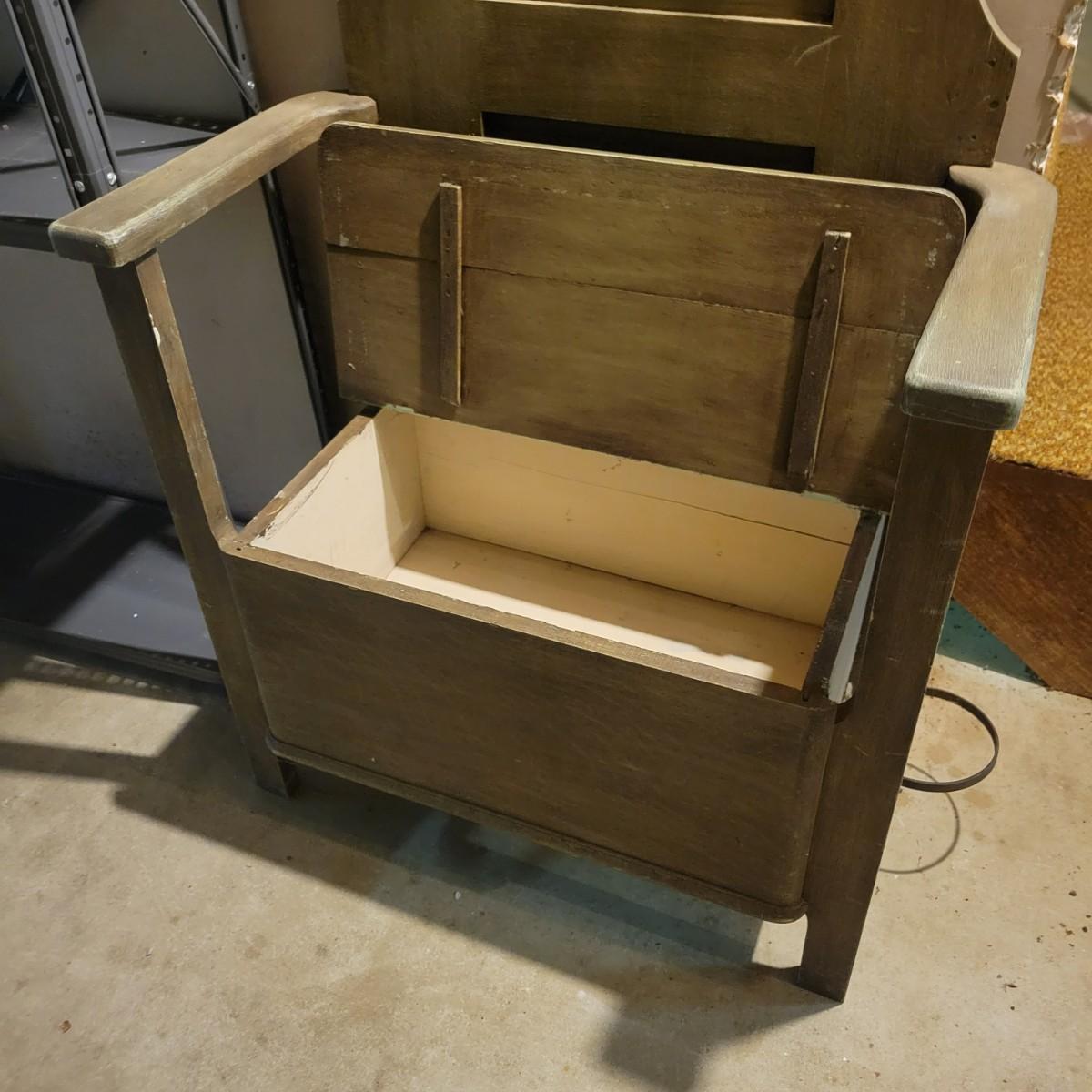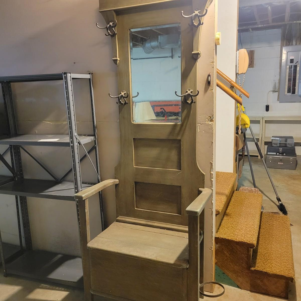 A vintage coat rack/bench in good condition, but there is some minor blemishes from use. This piece features four metal hangers, a beveled mirror and a bench thats lid opens for additional storage. Coat rack is made of wood with a gray stain and a metal ring for an umbrella stand on its right side. Measures approximately 30.5" x 16" x 83" Local pickup only