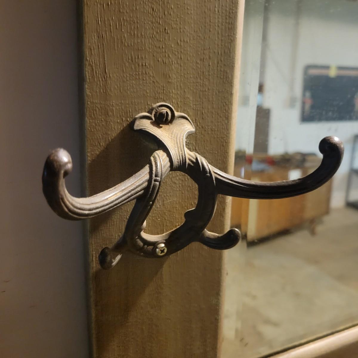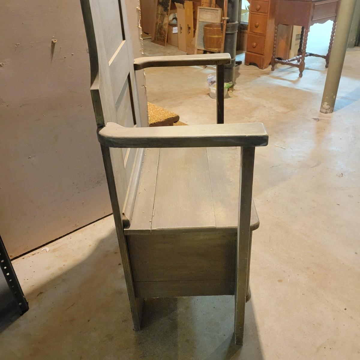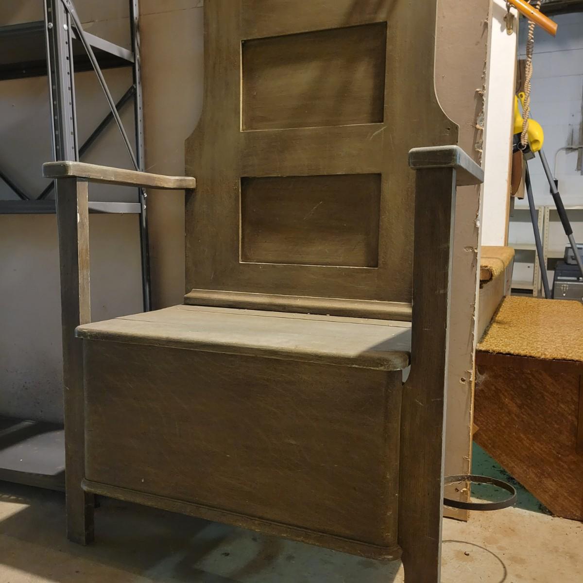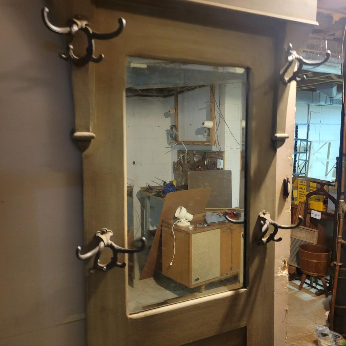A vintage coat rack/bench in good condition, but there is some minor blemishes from use. This piece features four metal hangers, a beveled mirror and a bench thats lid opens for additional storage. Coat rack is made of wood with a gray stain and a metal ring for an umbrella stand on its right side. Measures approximately 30.5" x 16" x 83" Local pickup only