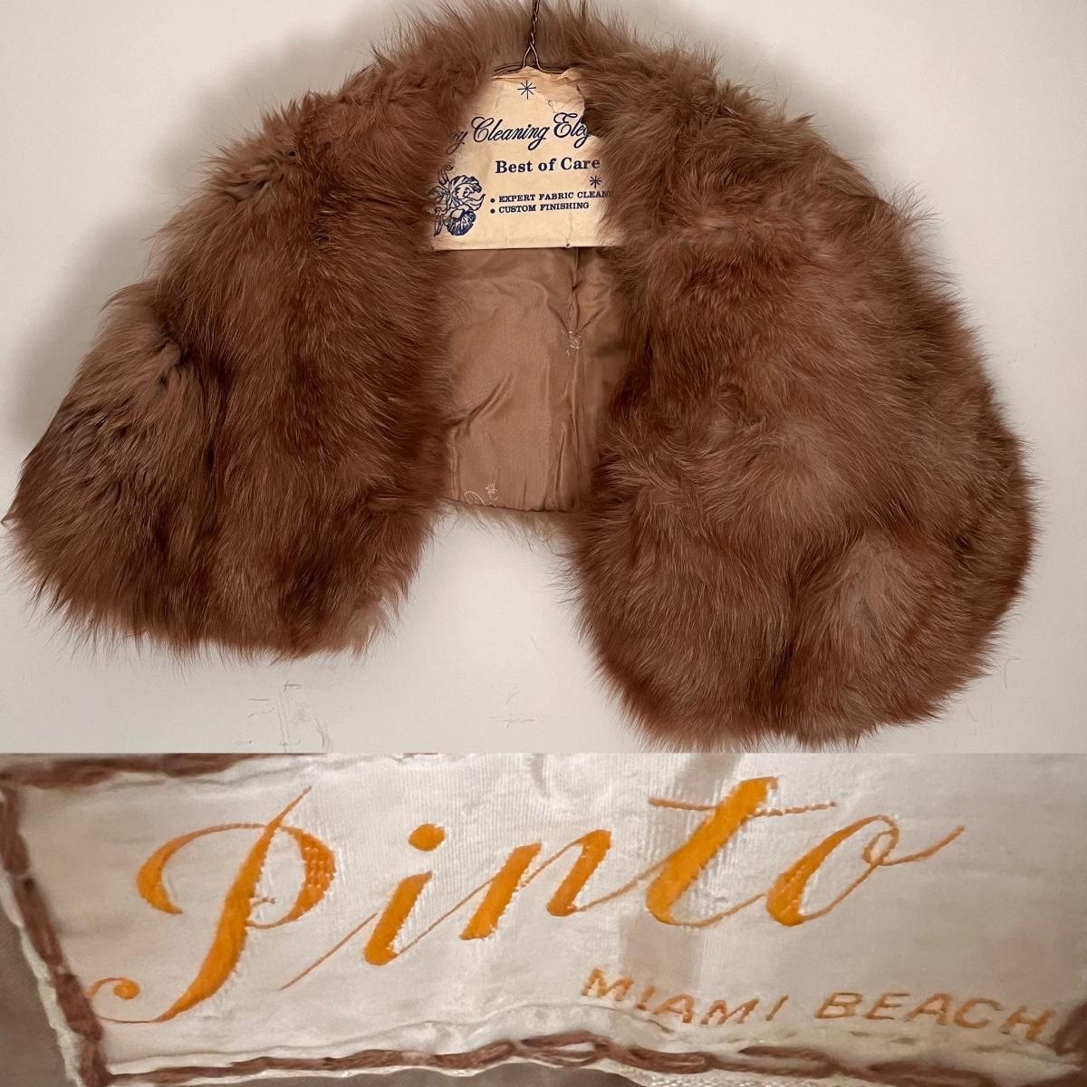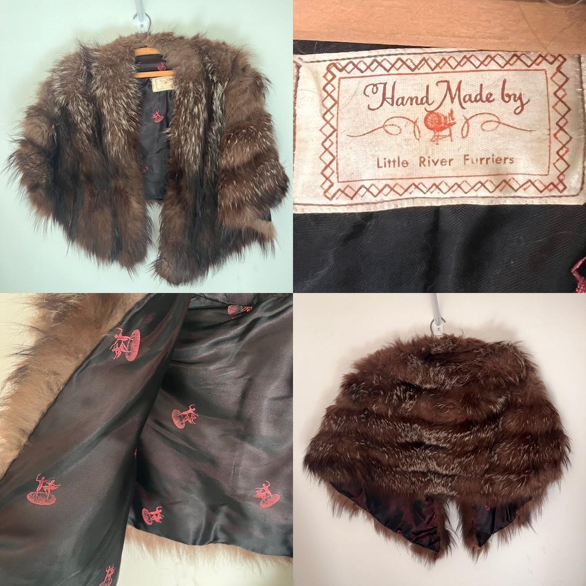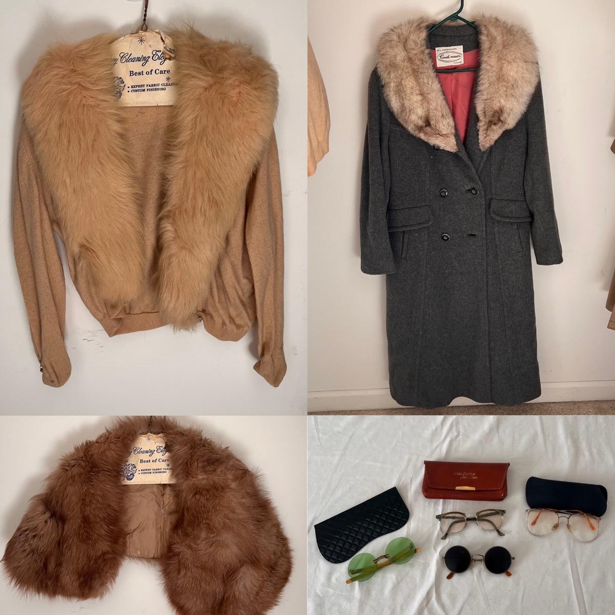 Lot includes four fur (cannot confirm if it’s faux or real) coats and four pairs of unique glasses. The first, darker brown fur shawl appears to be hand made by Little River Furriers. The second shawl is a lighter brown and made by Pinto Miami Beach. The third sweater with a fur collar has a tag that reads Connaught, 100% imported cashmere. The last coat shown is grey and has several different labels - see pictures included. There are no clear sizes on these coats, but they appear to be size large. Lastly, the glasses appear to be stamped by different brands including Cosmopolitan and Renauld. Shipping available.
