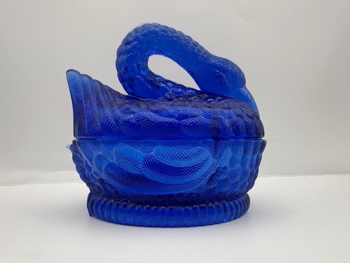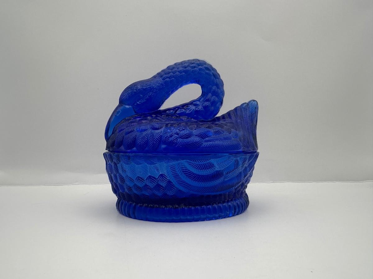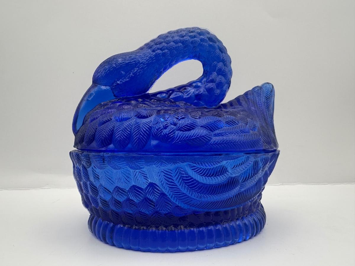 Vintage Cobalt Blue Glass Swan on Nest Covered Candy Dish