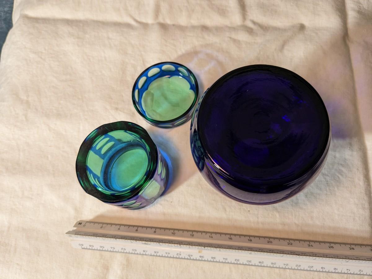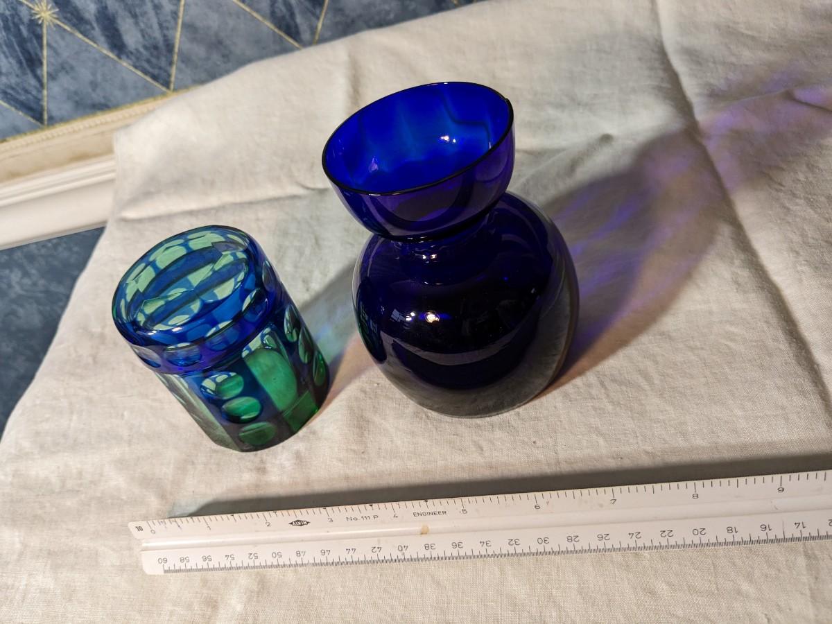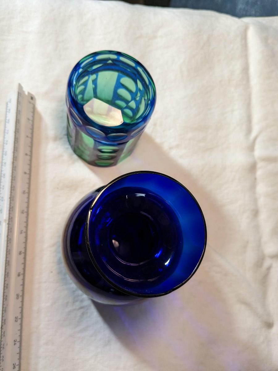 Vintage Cobalt Blue Vase, Bohemian Blue/Green Cup with Lid