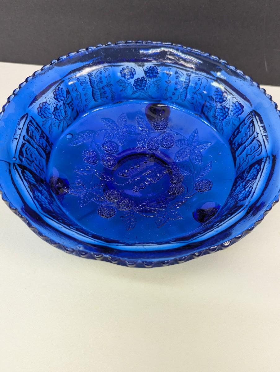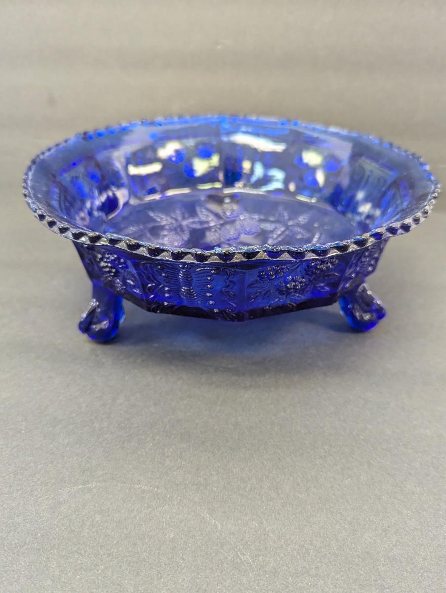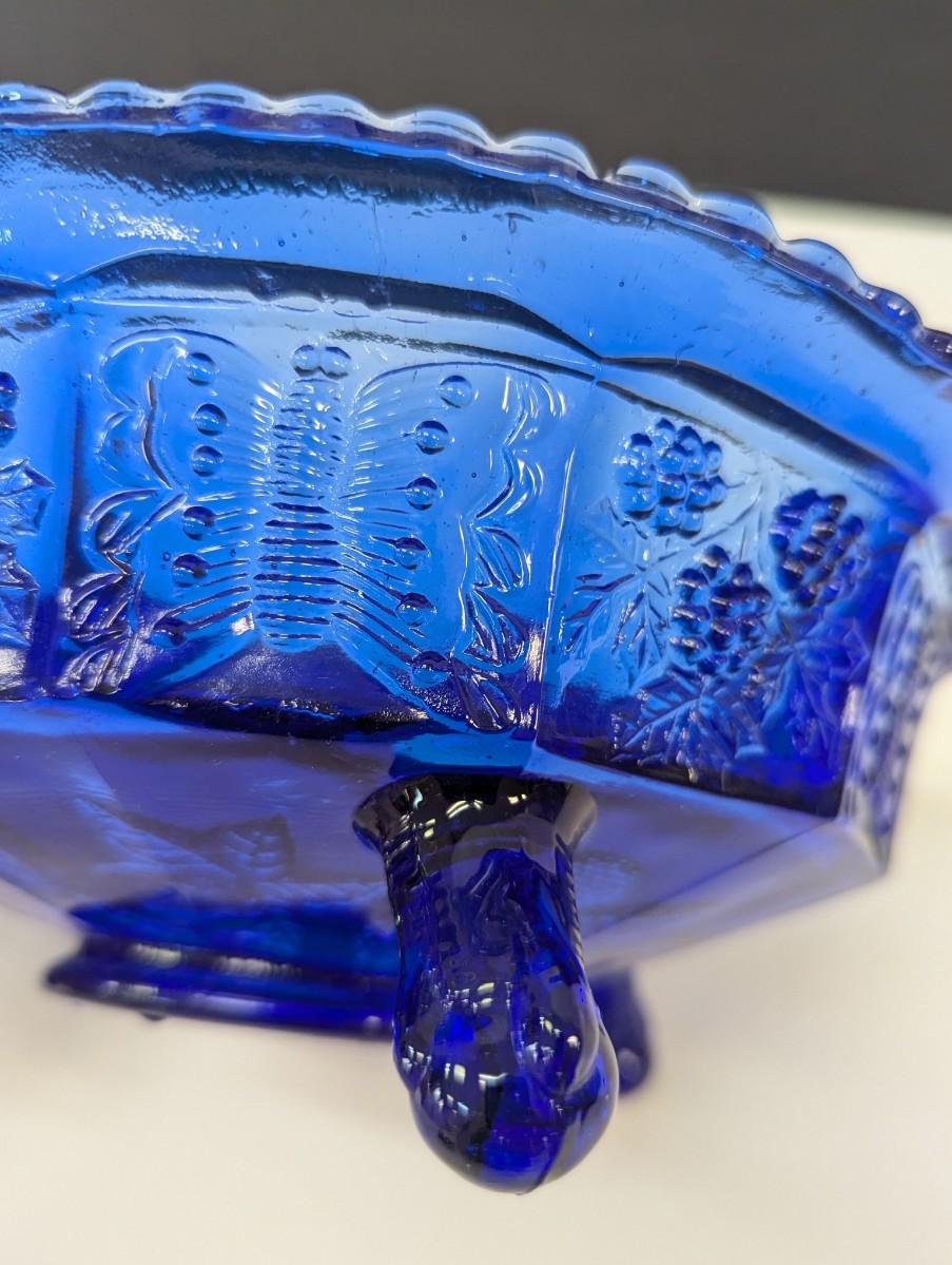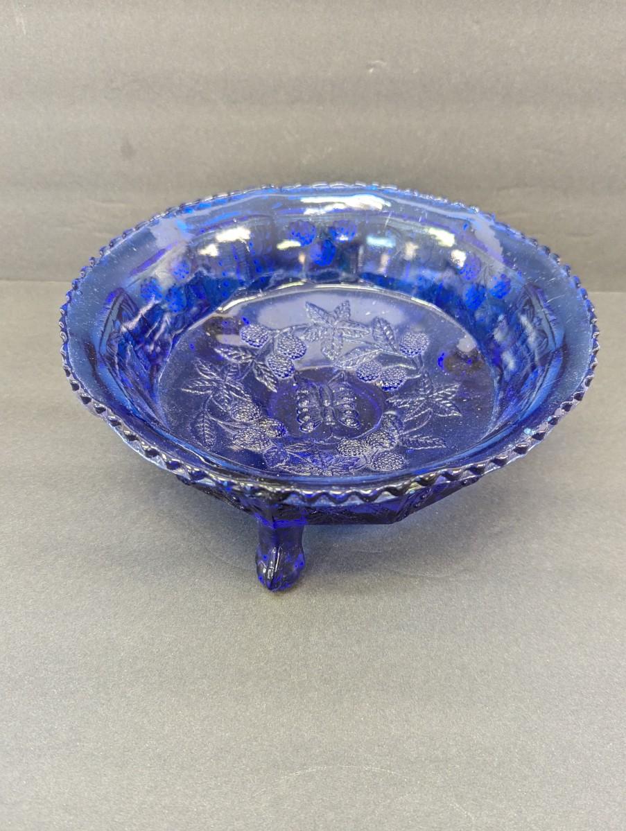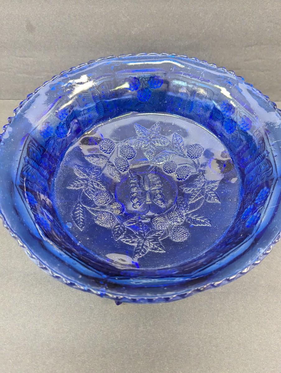 9" Vintage Cobalt Footed Bowl With Raised Butterflies & Berries