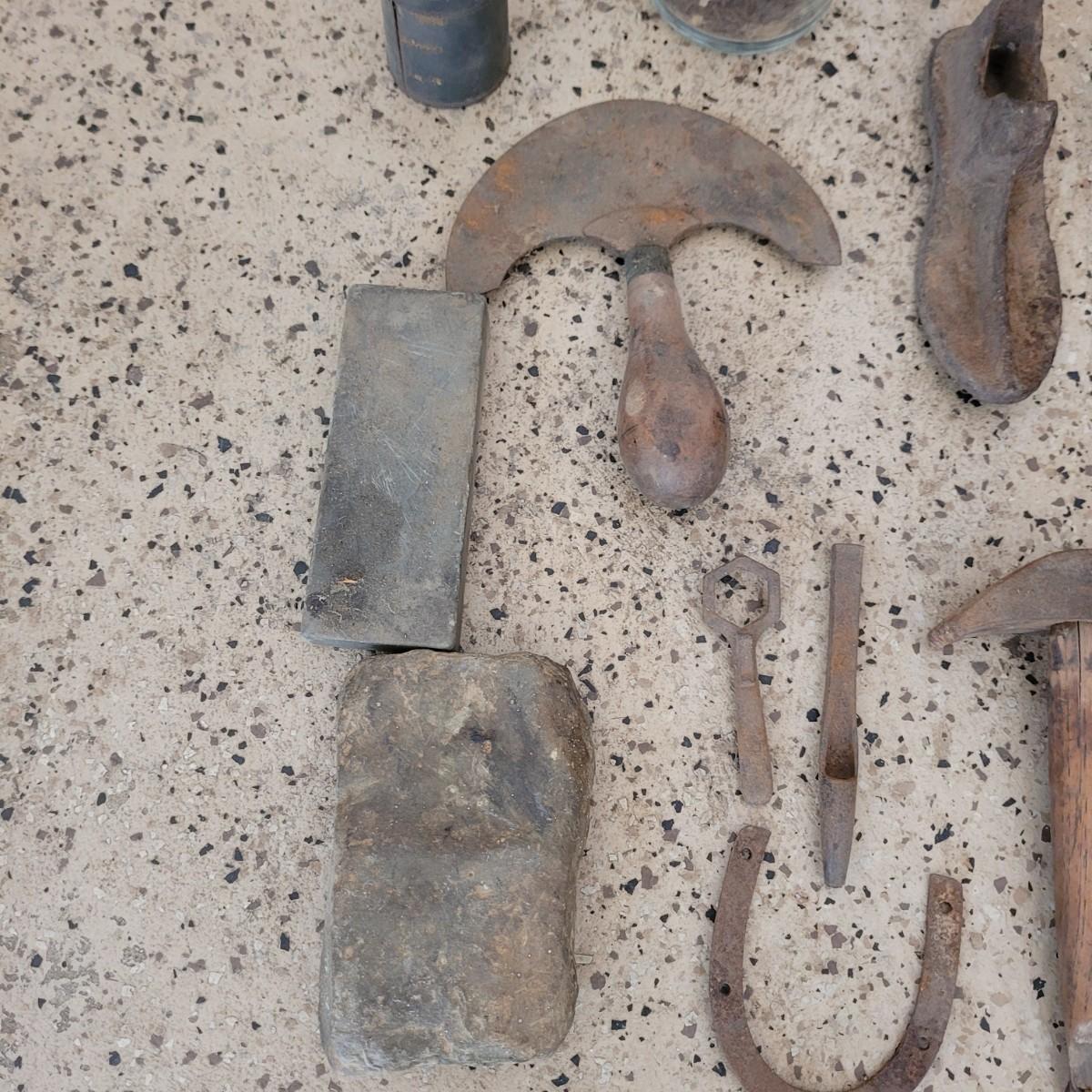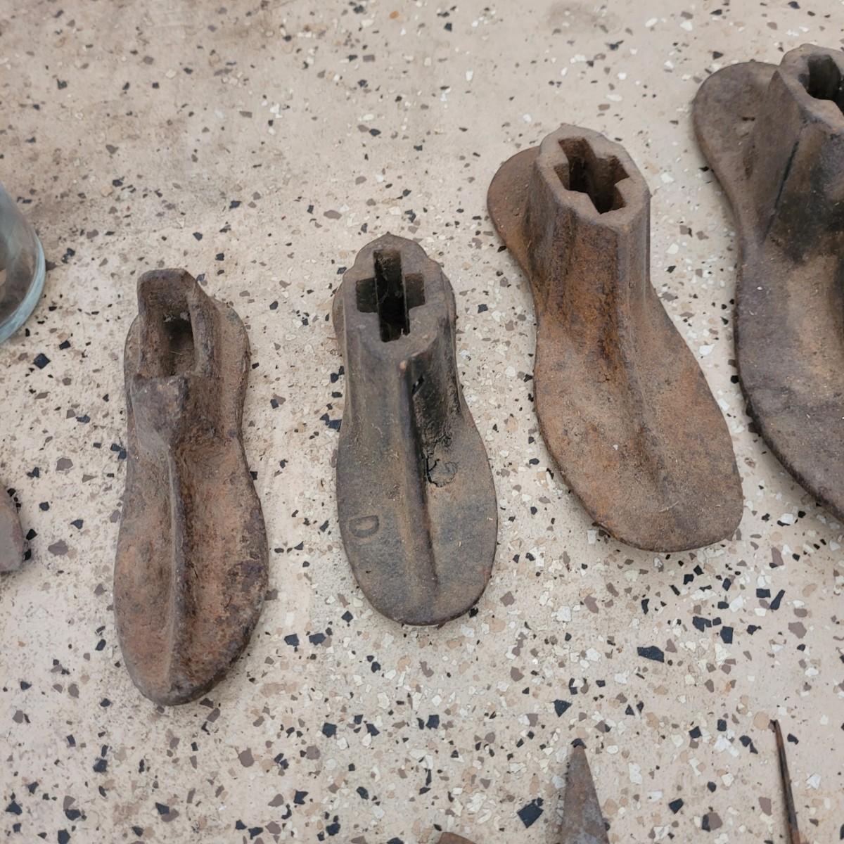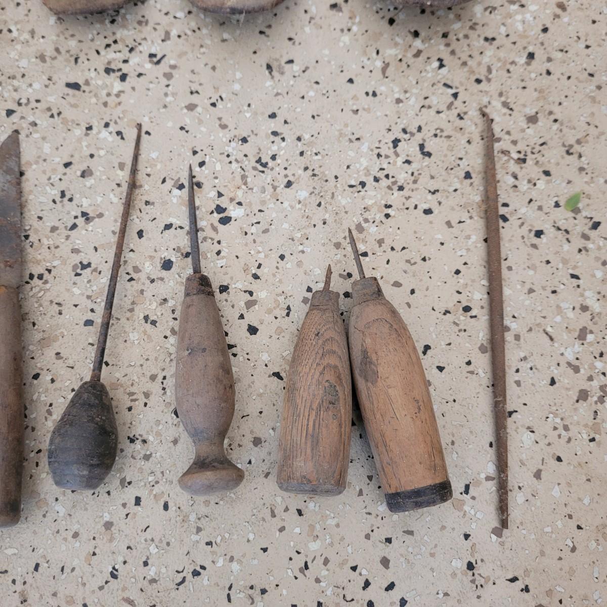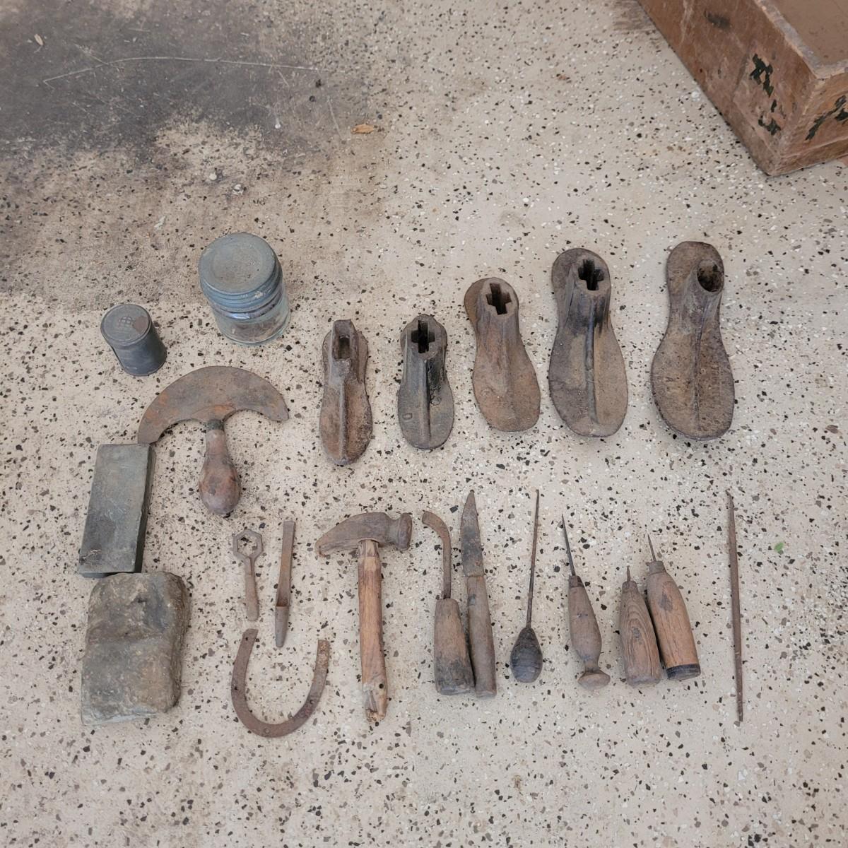 This assortment of cobbler tools includes cast iron shoe lasts, knives, woodcarving tools and more. The largest form measures approximately 9.5" in length. Shipping available.