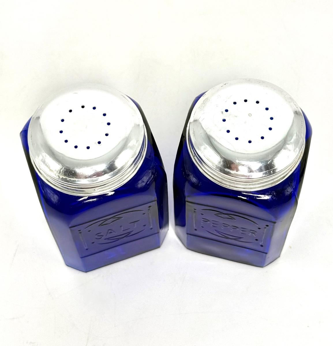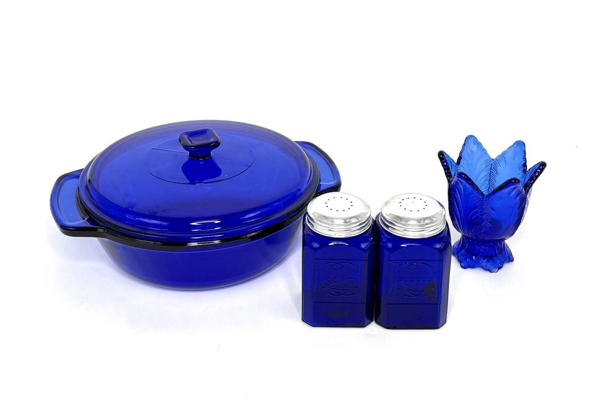 Vintage Cobalt Blue Glass Lot - Casserole, Salt & Pepper Shakers, Bud Vase