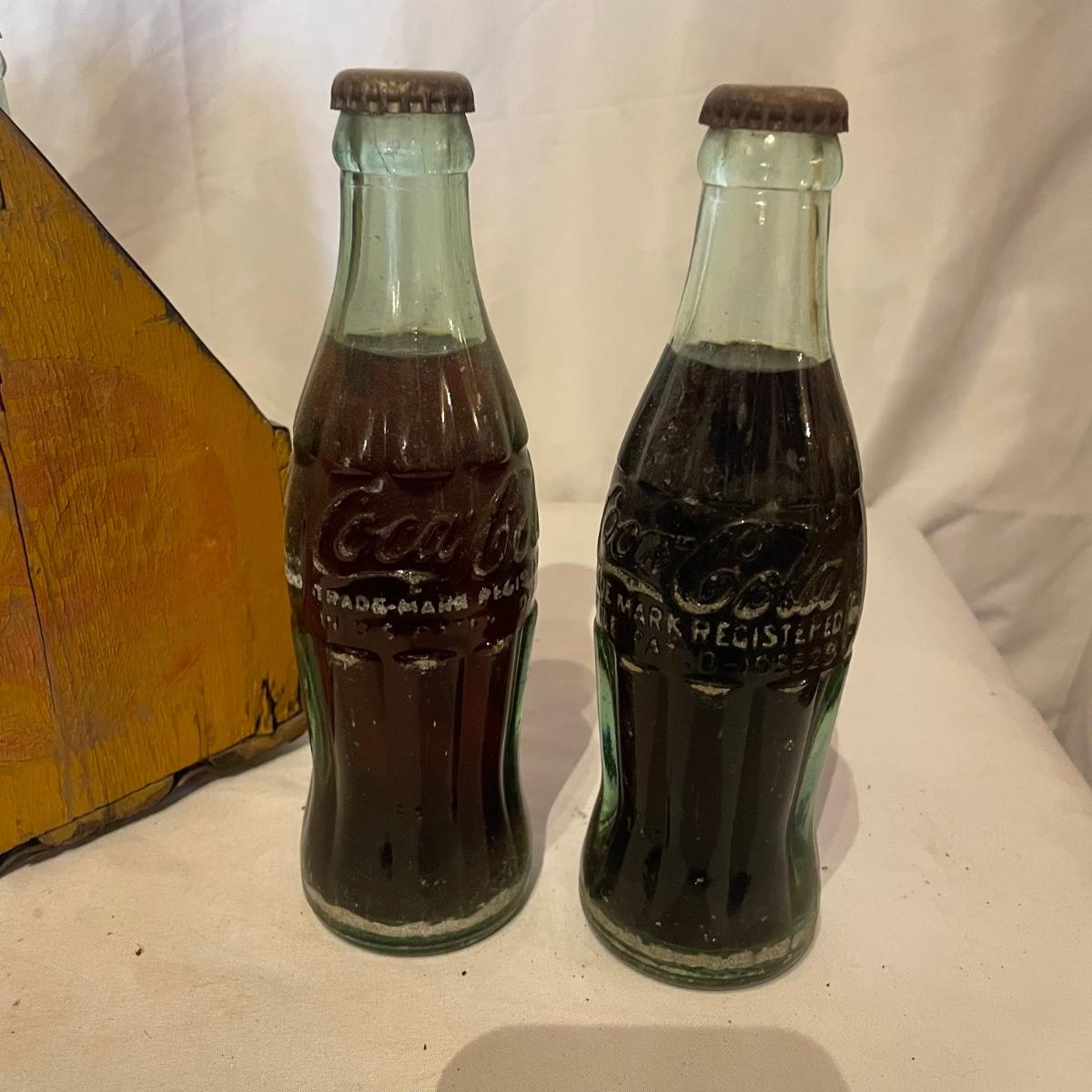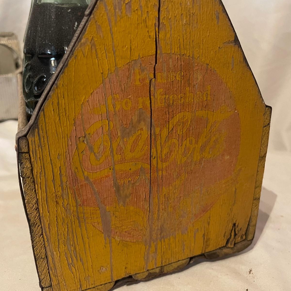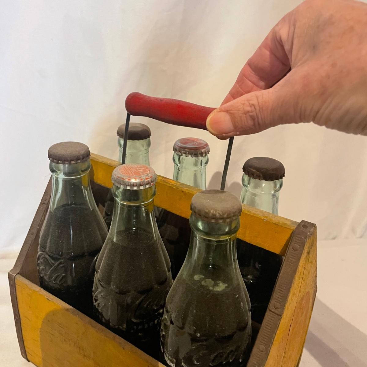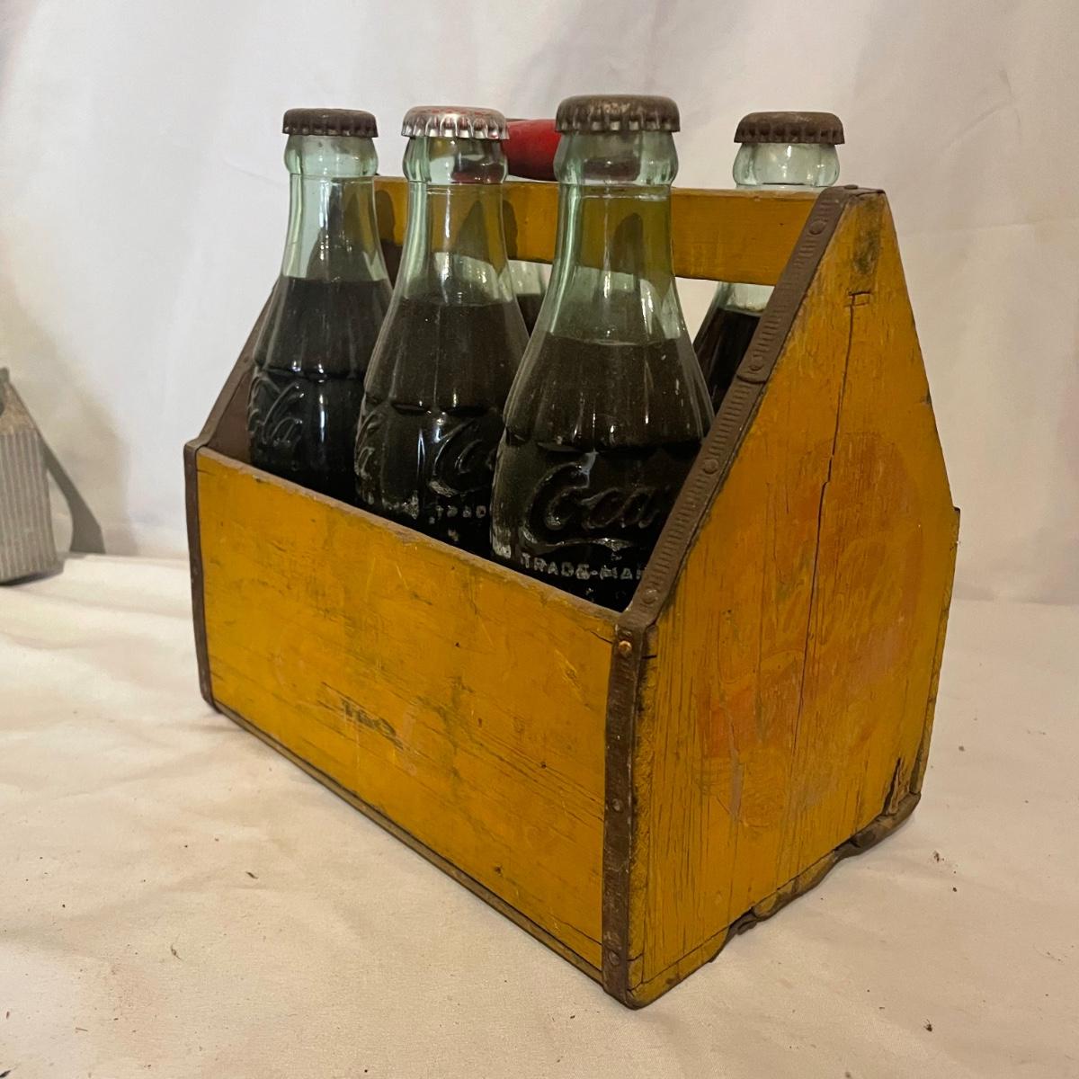 This Coca Cola vintage six bottle carrier is wood with a metal and wood handle. The paint is quite faded. All the bottles are sealed and full of what appears to be their original contents, Coca-Cola Classic.