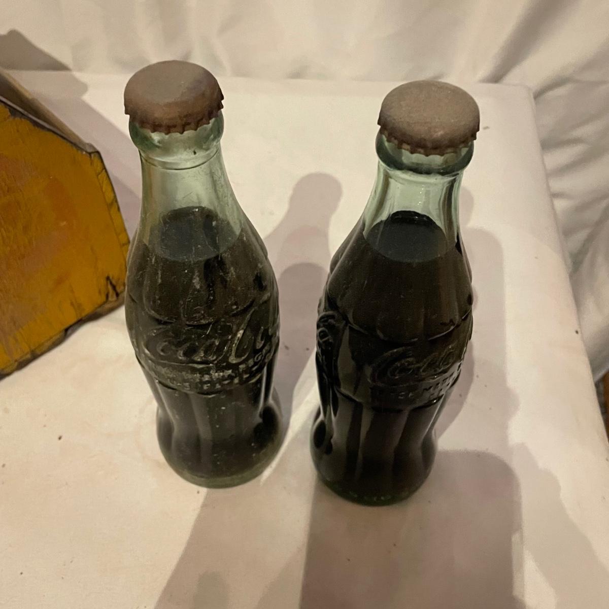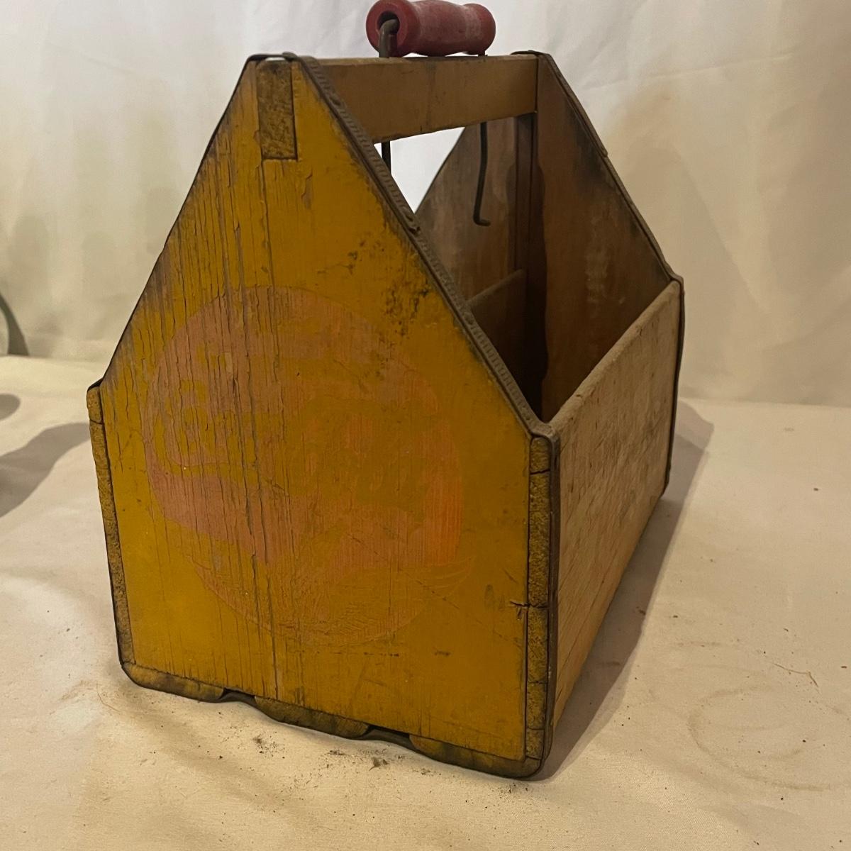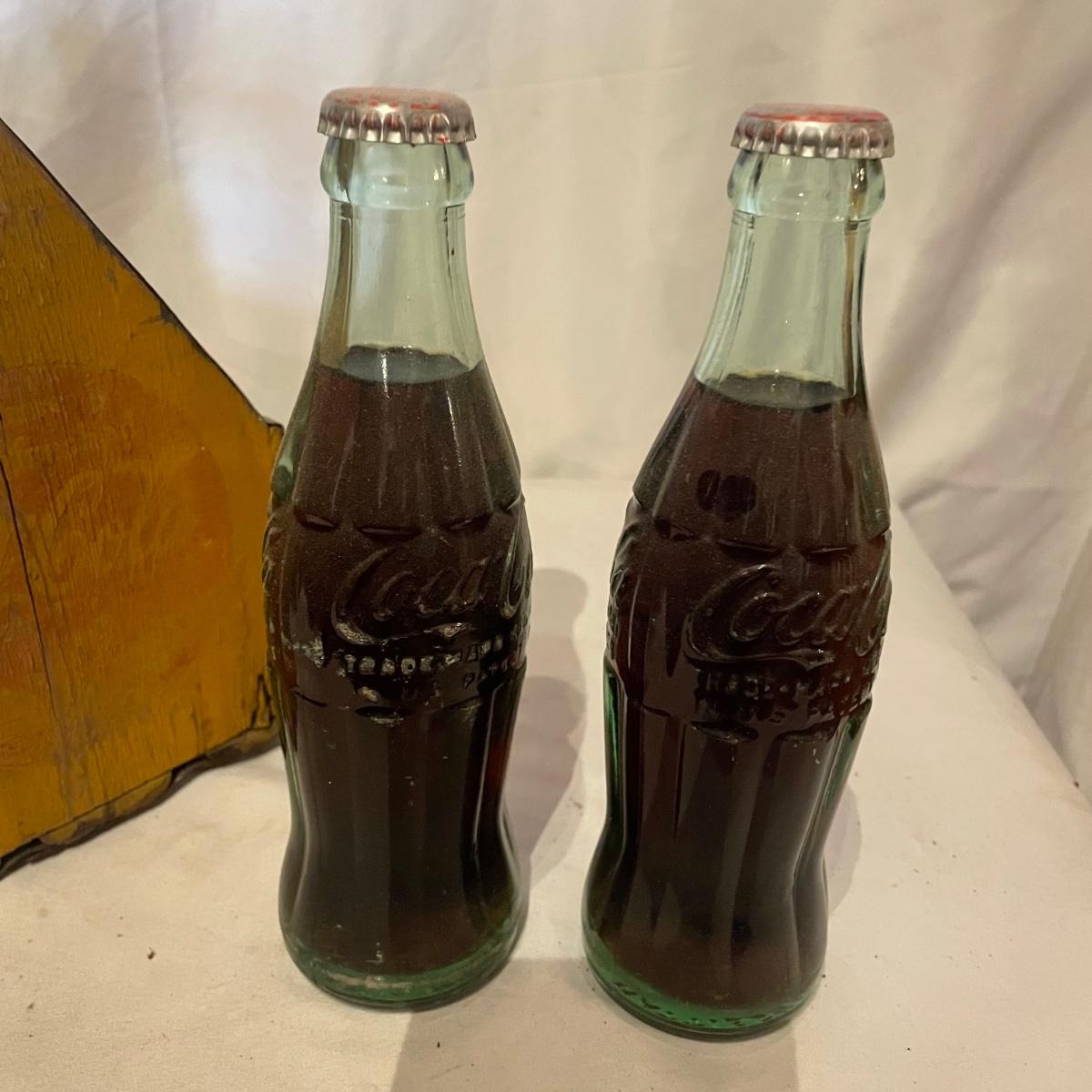 This Coca Cola vintage six bottle carrier is wood with a metal and wood handle. The paint is quite faded. All the bottles are sealed and full of what appears to be their original contents, Coca-Cola Classic.