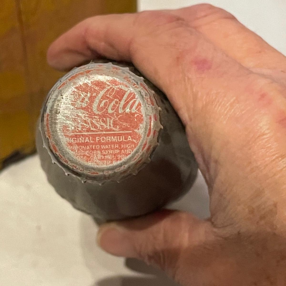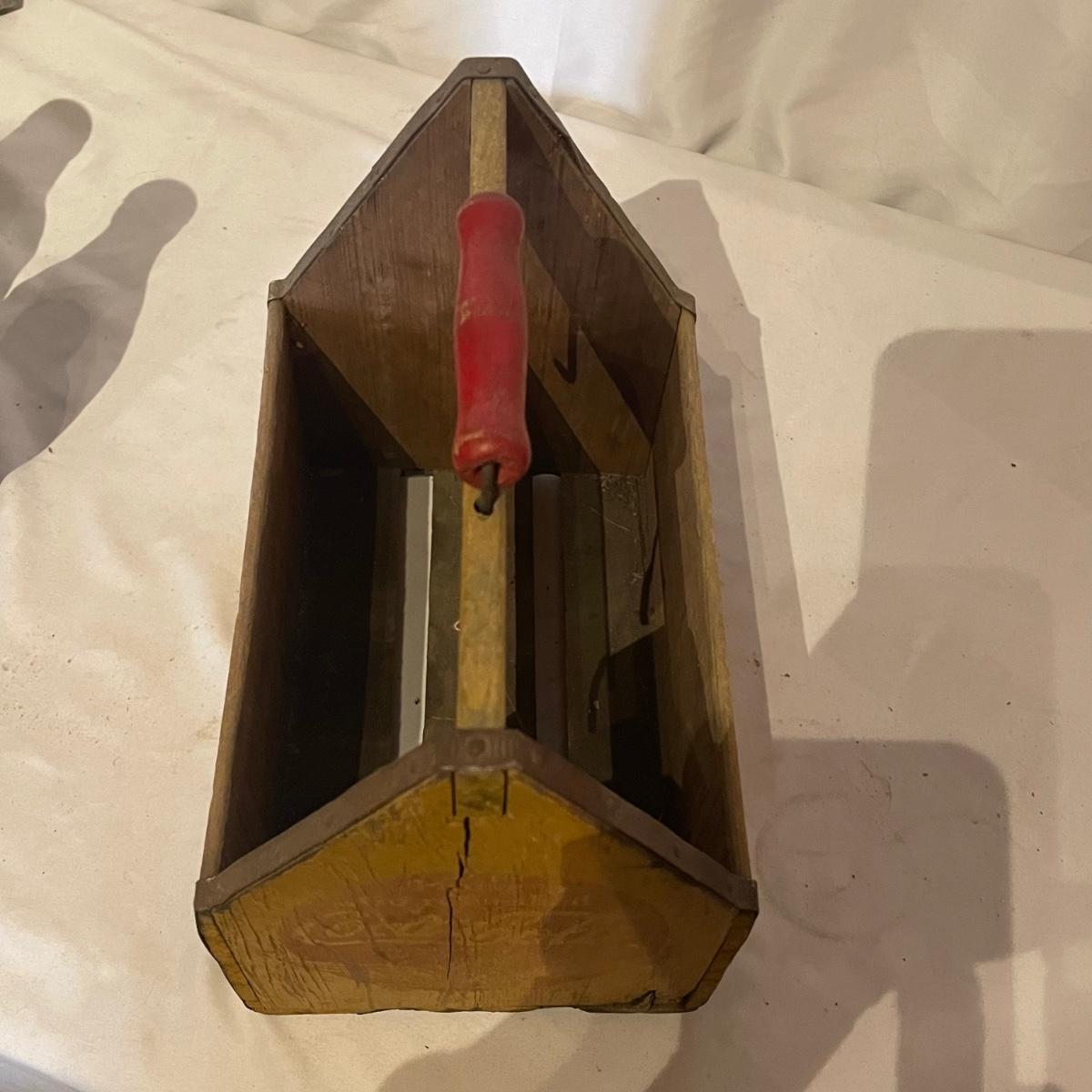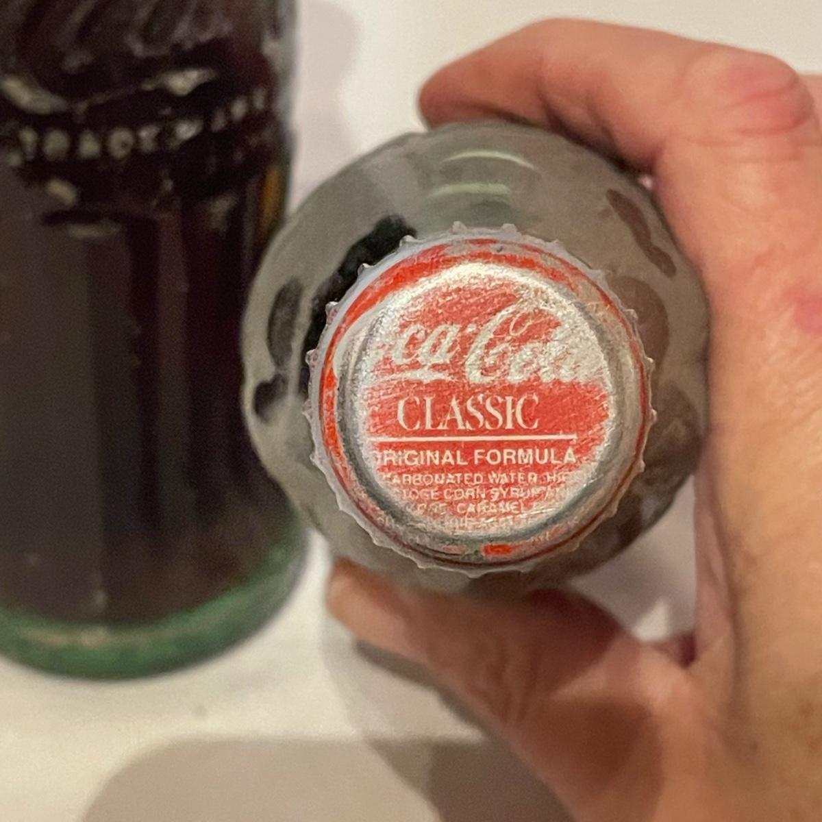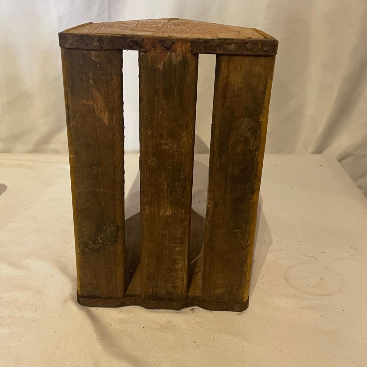 This Coca Cola vintage six bottle carrier is wood with a metal and wood handle. The paint is quite faded. All the bottles are sealed and full of what appears to be their original contents, Coca-Cola Classic.