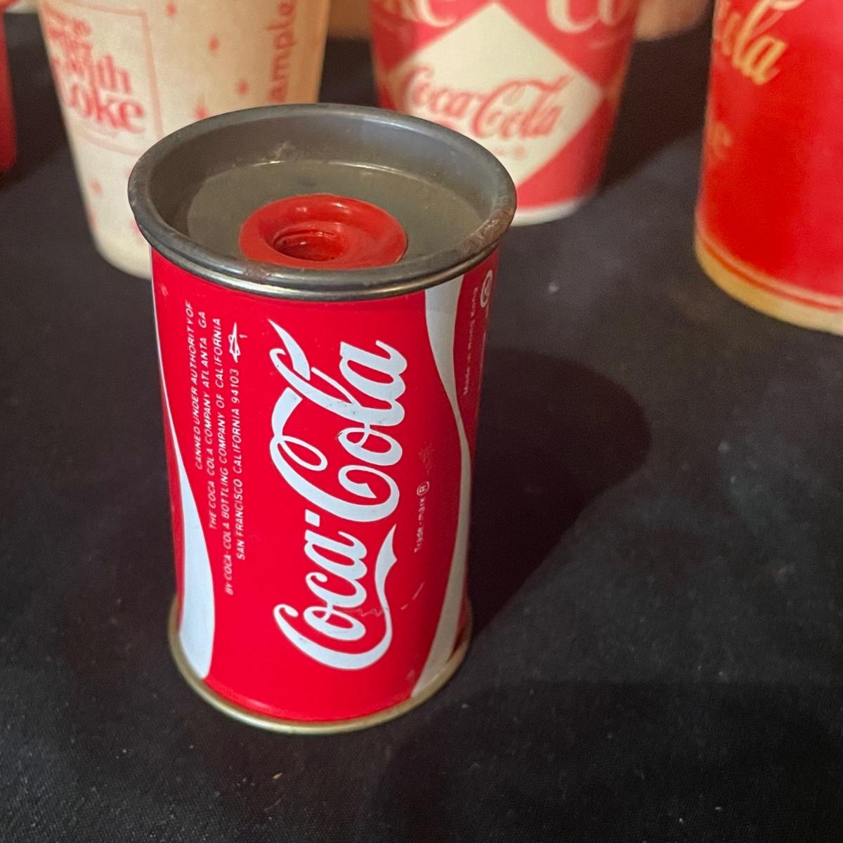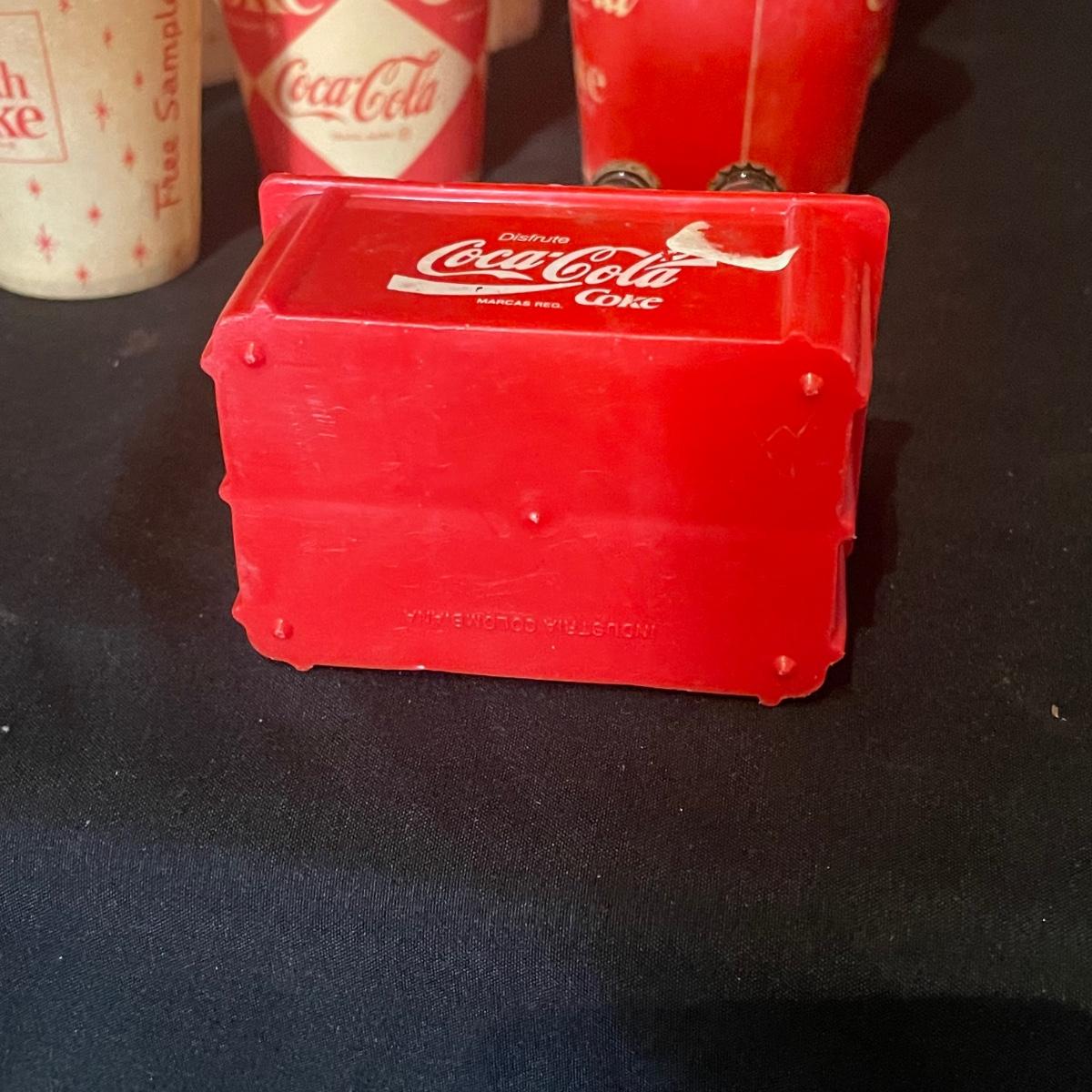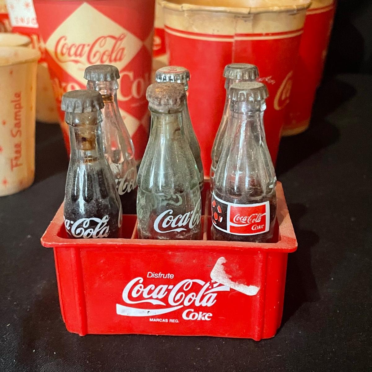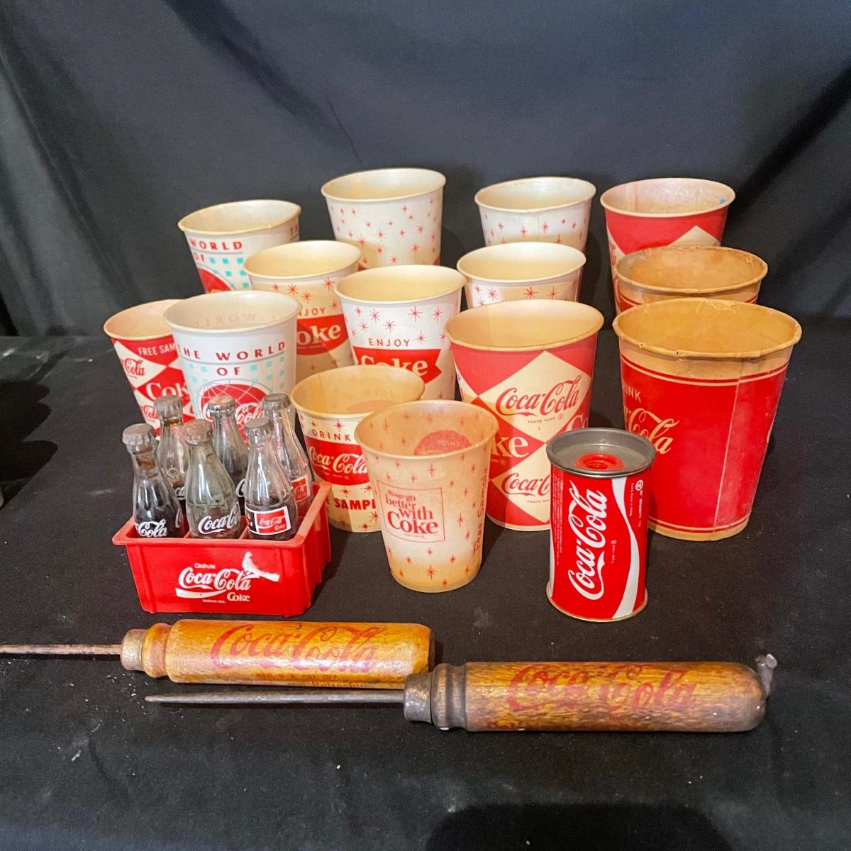 Fourteen paper cups in this collection of Coca Cola memorabilia along with two ice pics that have wooden handles, a tin pencil sharpener and a miniature red plastic crate with six Coke bottles (all have some liquid).