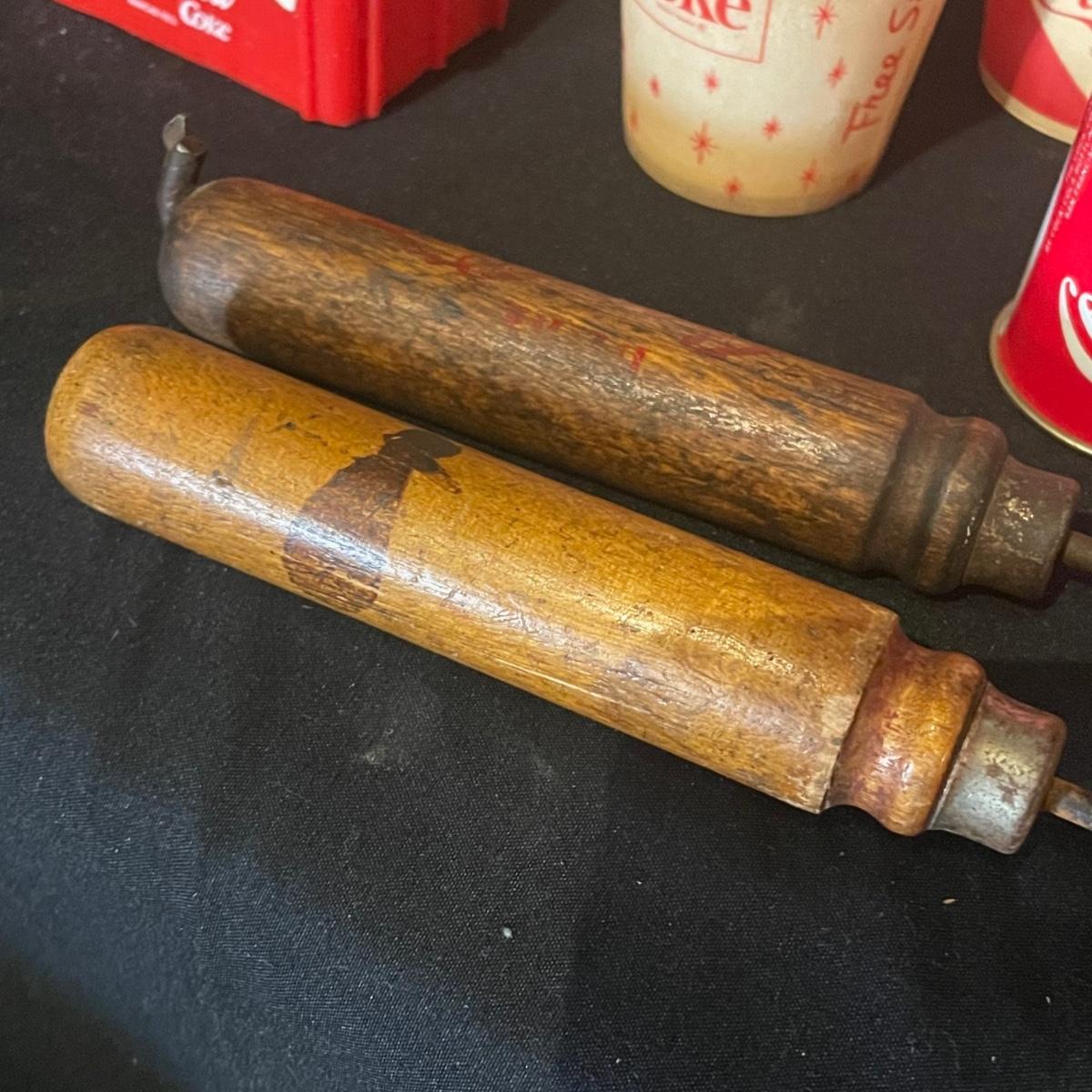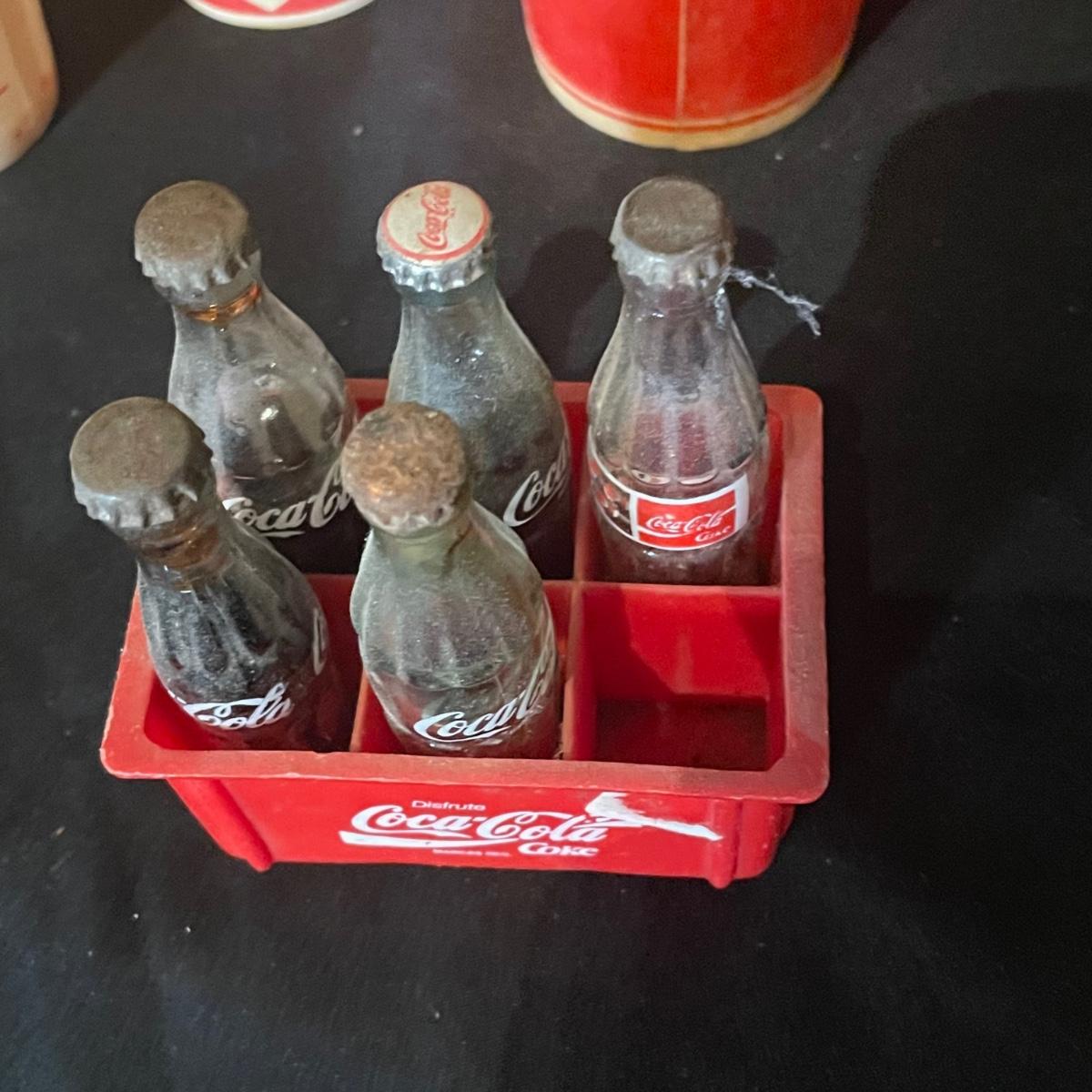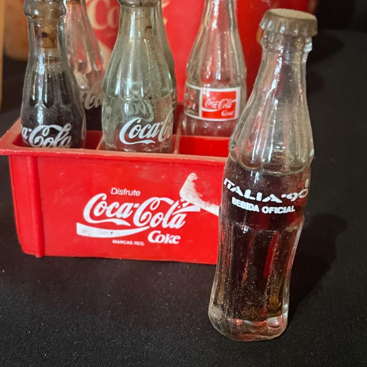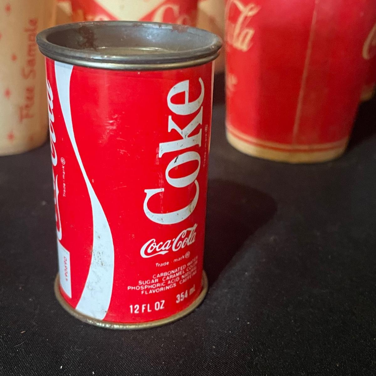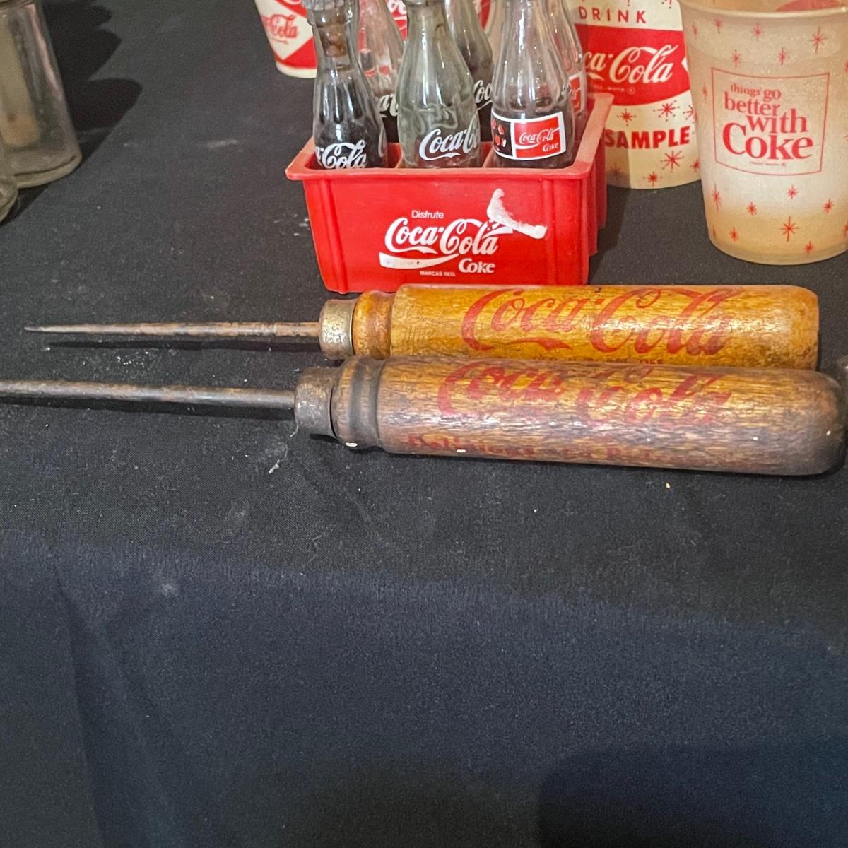Fourteen paper cups in this collection of Coca Cola memorabilia along with two ice pics that have wooden handles, a tin pencil sharpener and a miniature red plastic crate with six Coke bottles (all have some liquid).