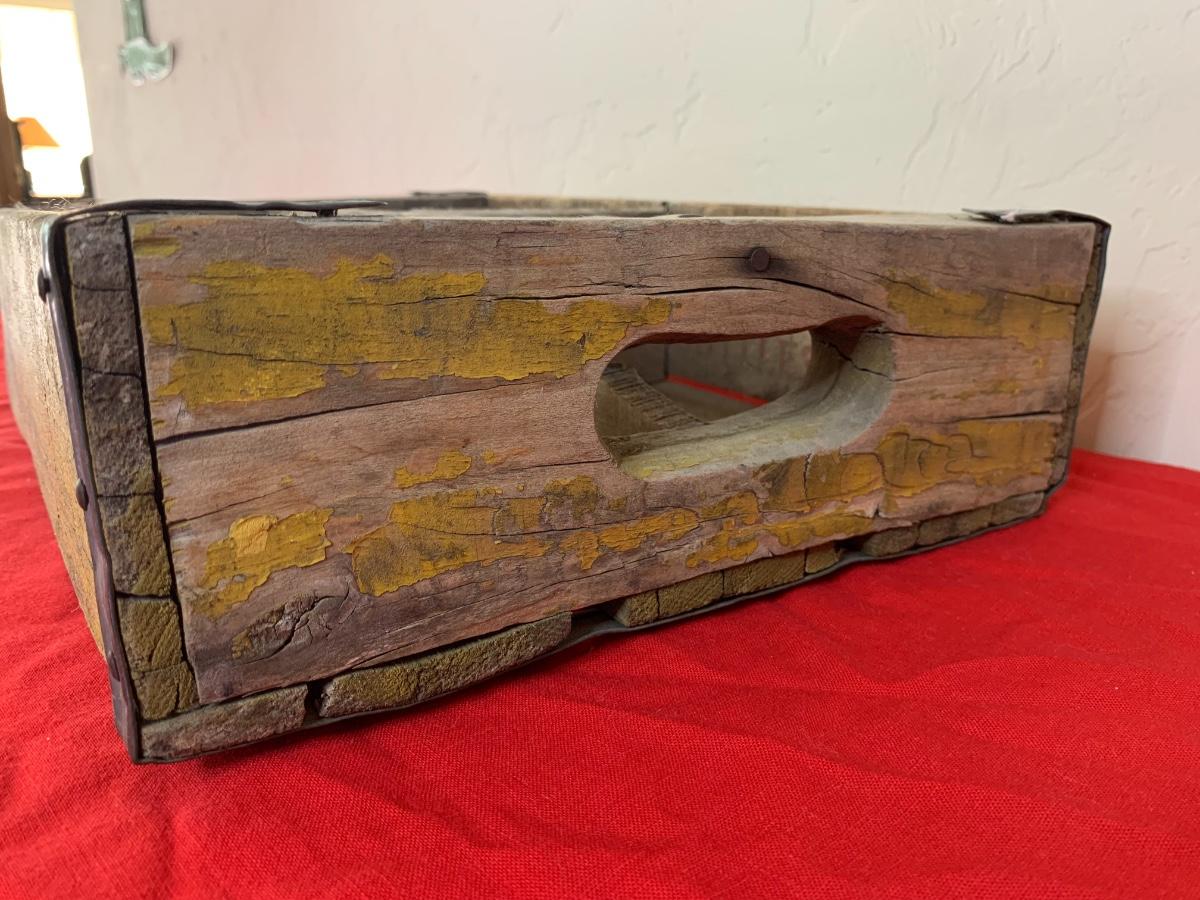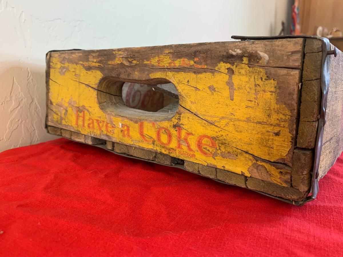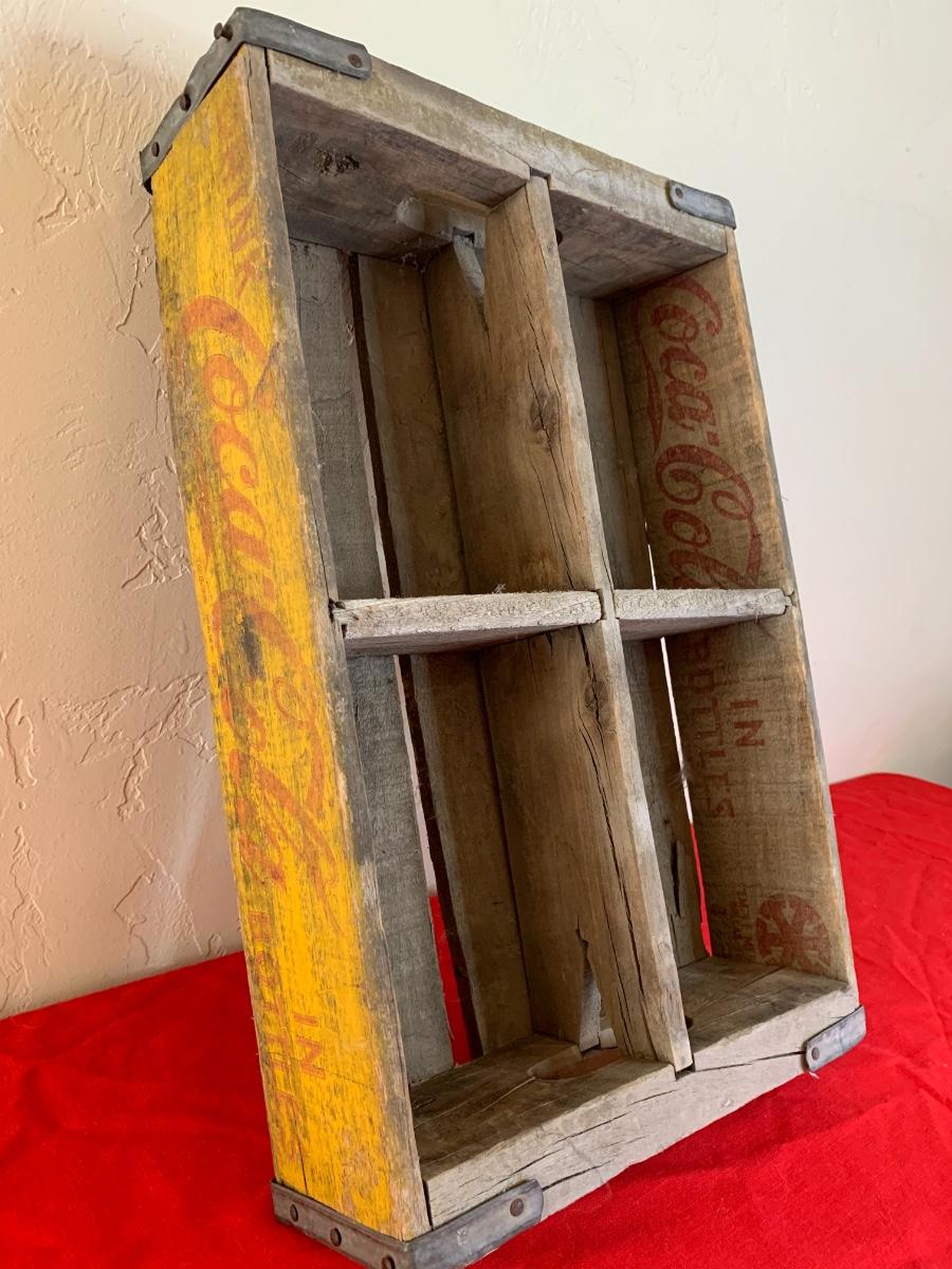 You are bidding on a cool old Coca-Cola wood crate with yellow and red paint. Dusty but sturdy and good vintage condition.