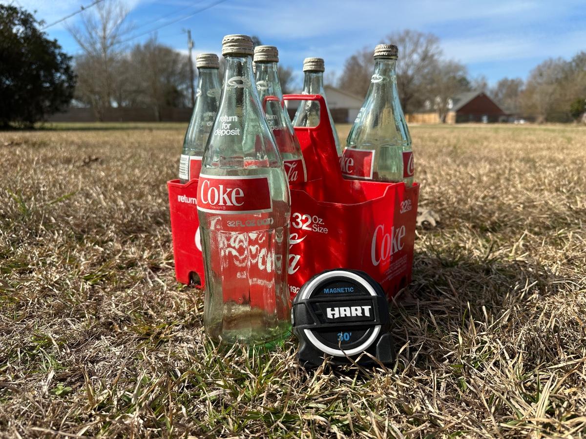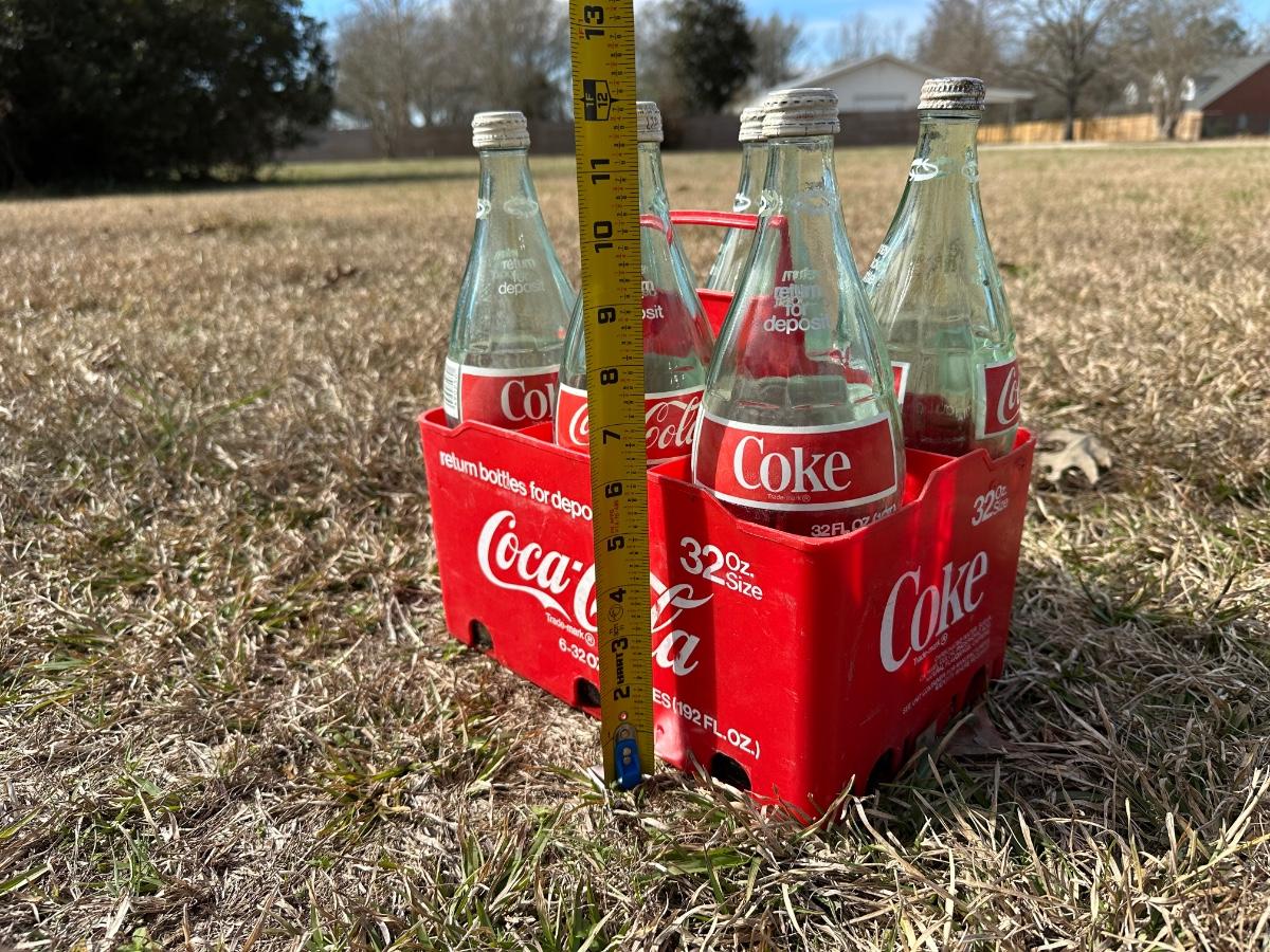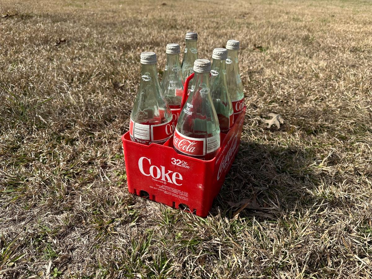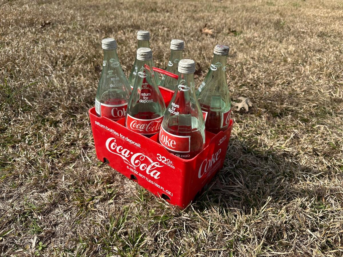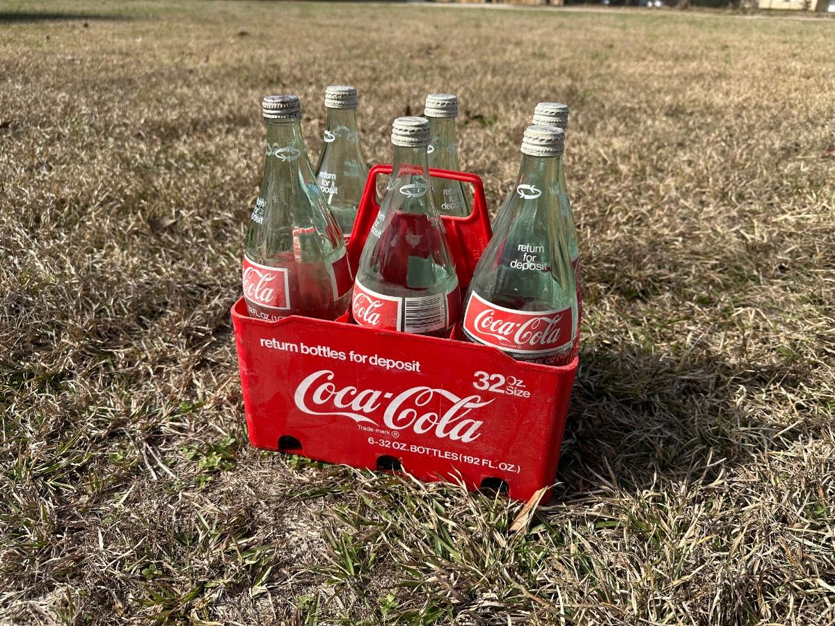 Vintage Coca-Cola plastic bottle carrier holding six original 32 oz glass Coke bottles. Classic return-for-deposit setup commonly used in the 1970s - 1980’s