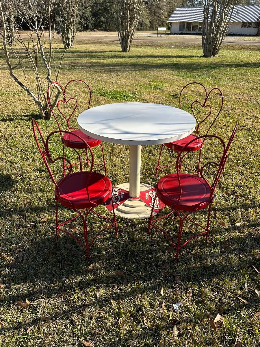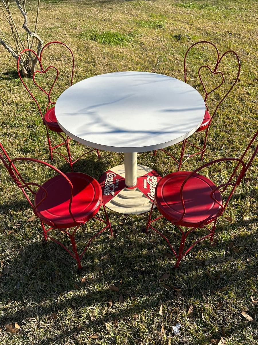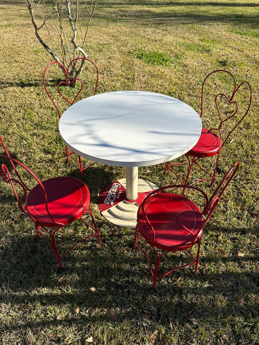 Vintage Coca-Cola Café Table w/ 4 Red Heart-Back Chairs – Retro Diner Set