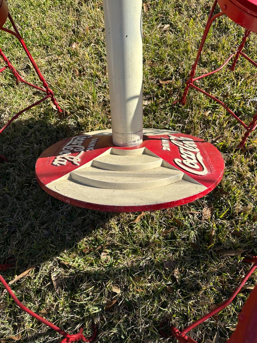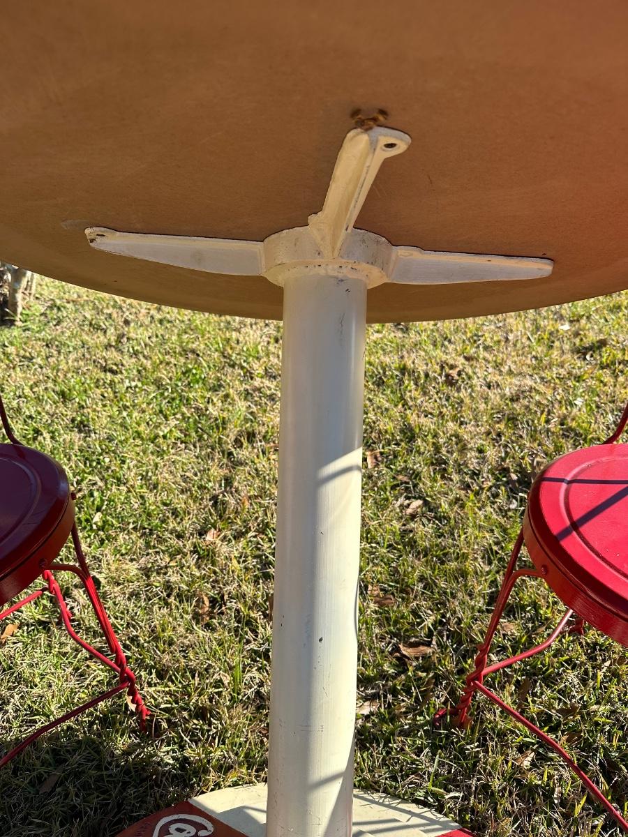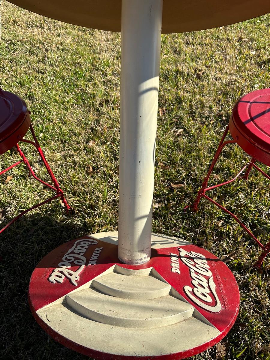 Classic Coca-Cola themed café/diner set featuring a round pedestal table with original Drink Coca-Cola cast base and four matching red metal chairs with heart-shaped backs. Heavy, sturdy construction with great vintage appeal. Perfect for patio, game room, diner décor, or Coke collection.