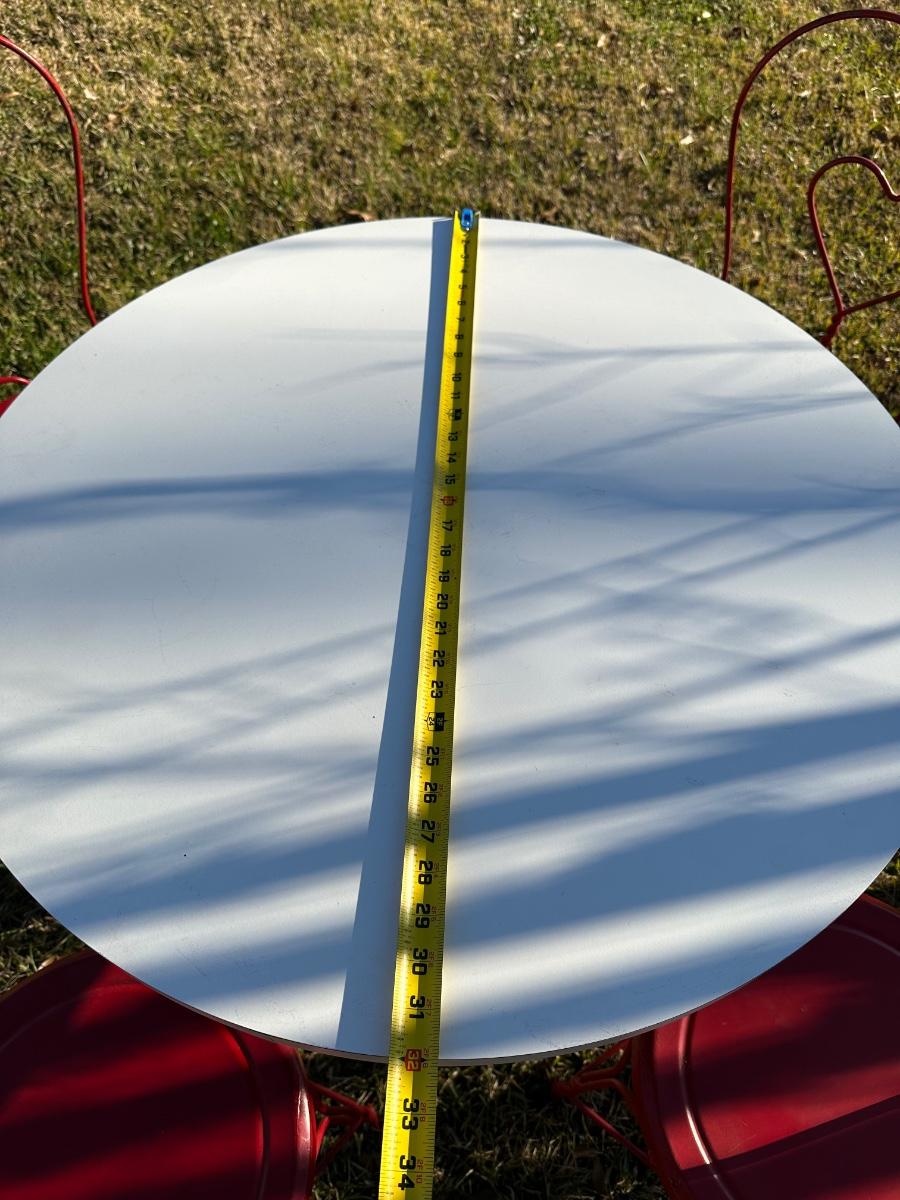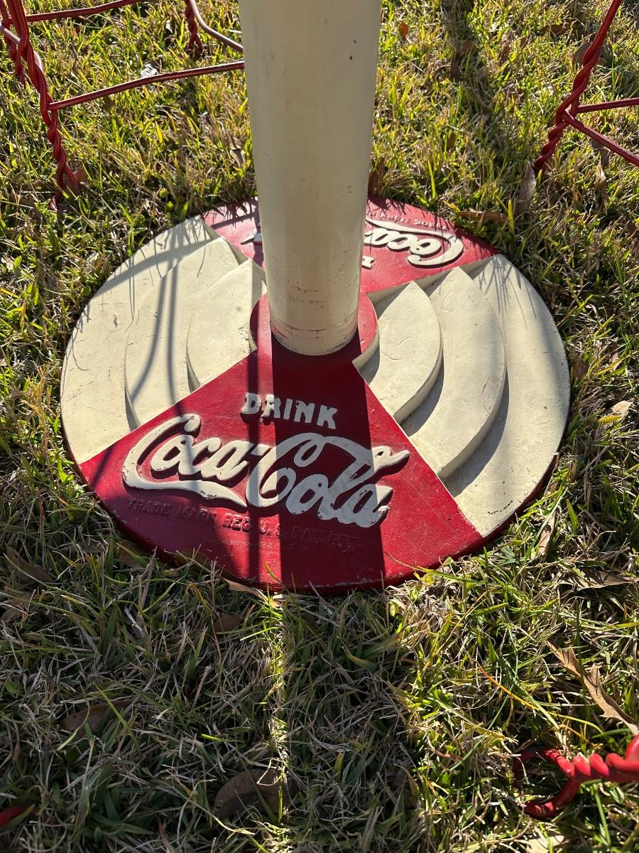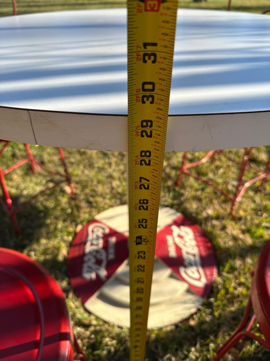 Classic Coca-Cola themed café/diner set featuring a round pedestal table with original Drink Coca-Cola cast base and four matching red metal chairs with heart-shaped backs. Heavy, sturdy construction with great vintage appeal. Perfect for patio, game room, diner décor, or Coke collection.