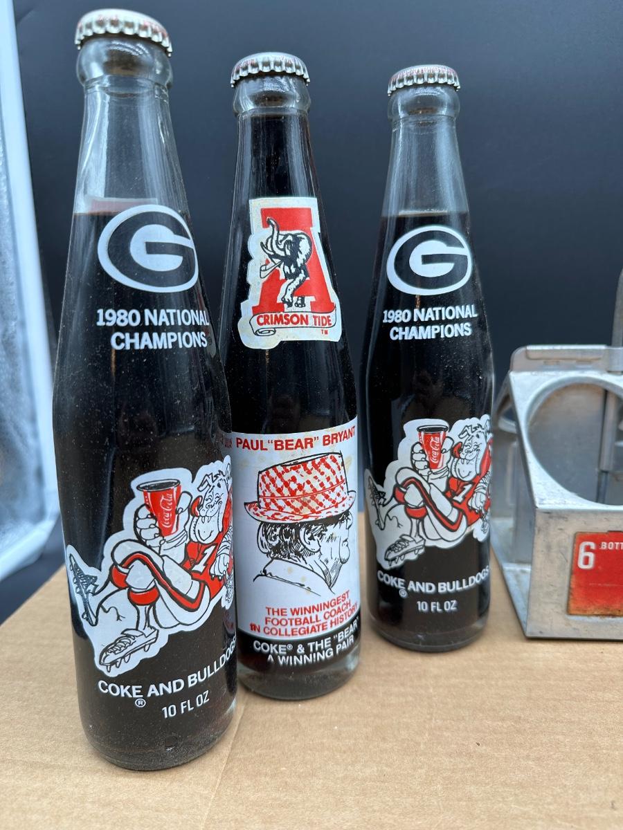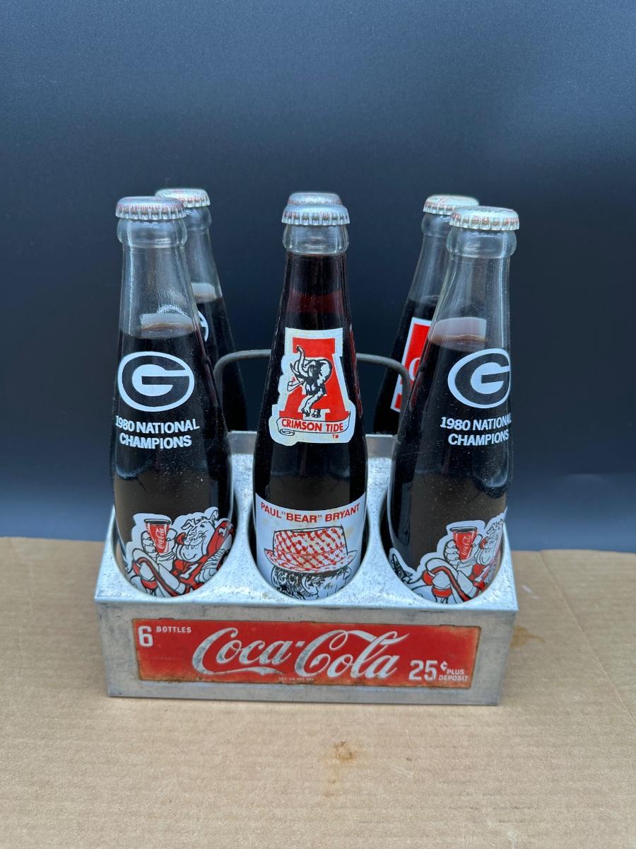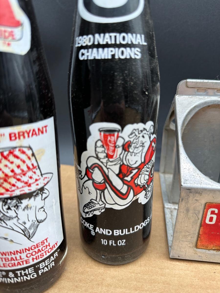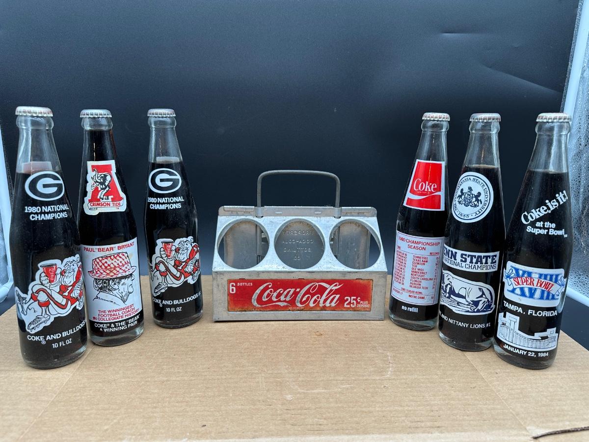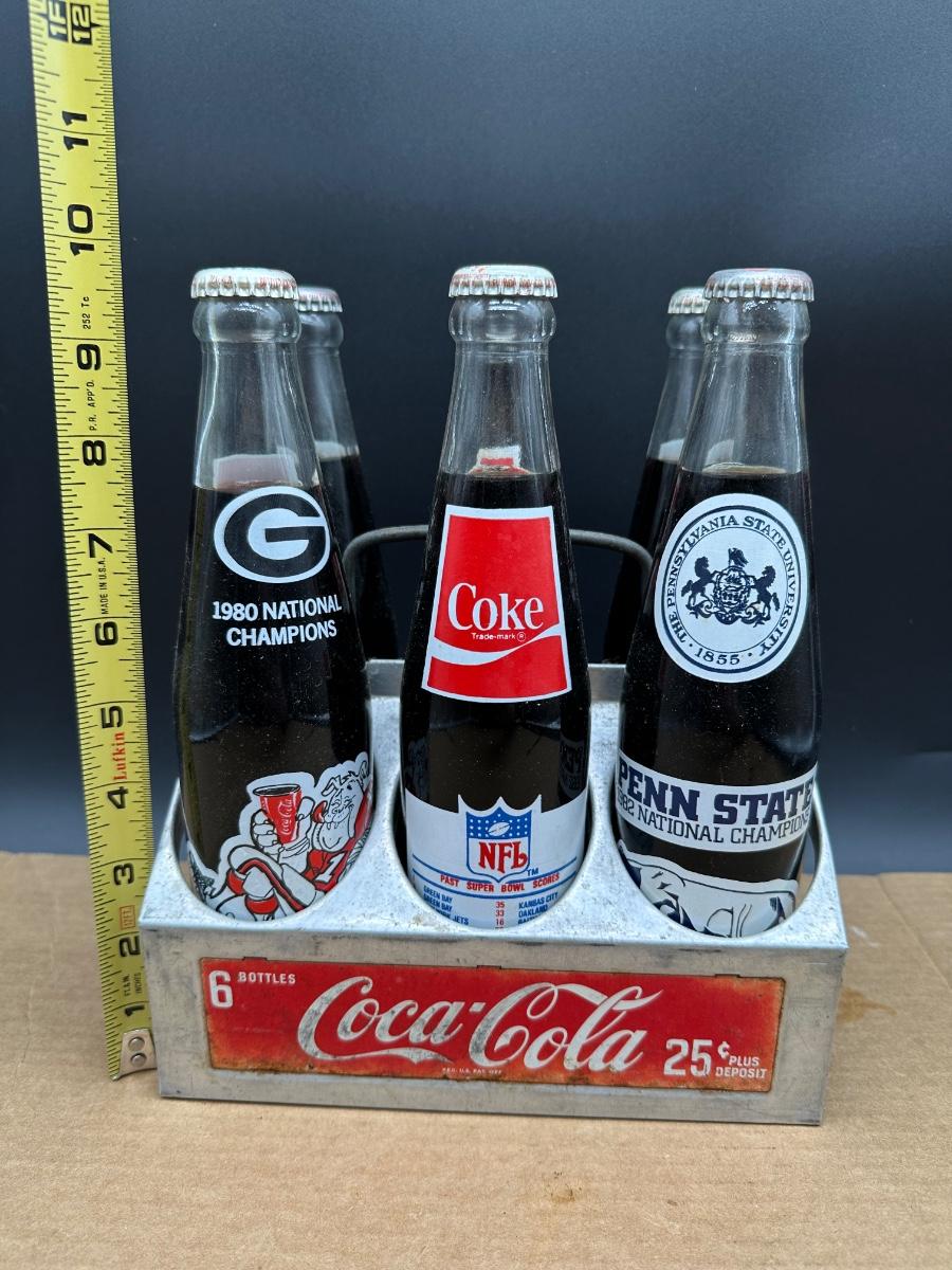 Vintage Coca-Cola commemorative glass bottle lot featuring college football national champions and Super Bowl memorabilia, complete with original metal 6-bottle Coca-Cola carrier.