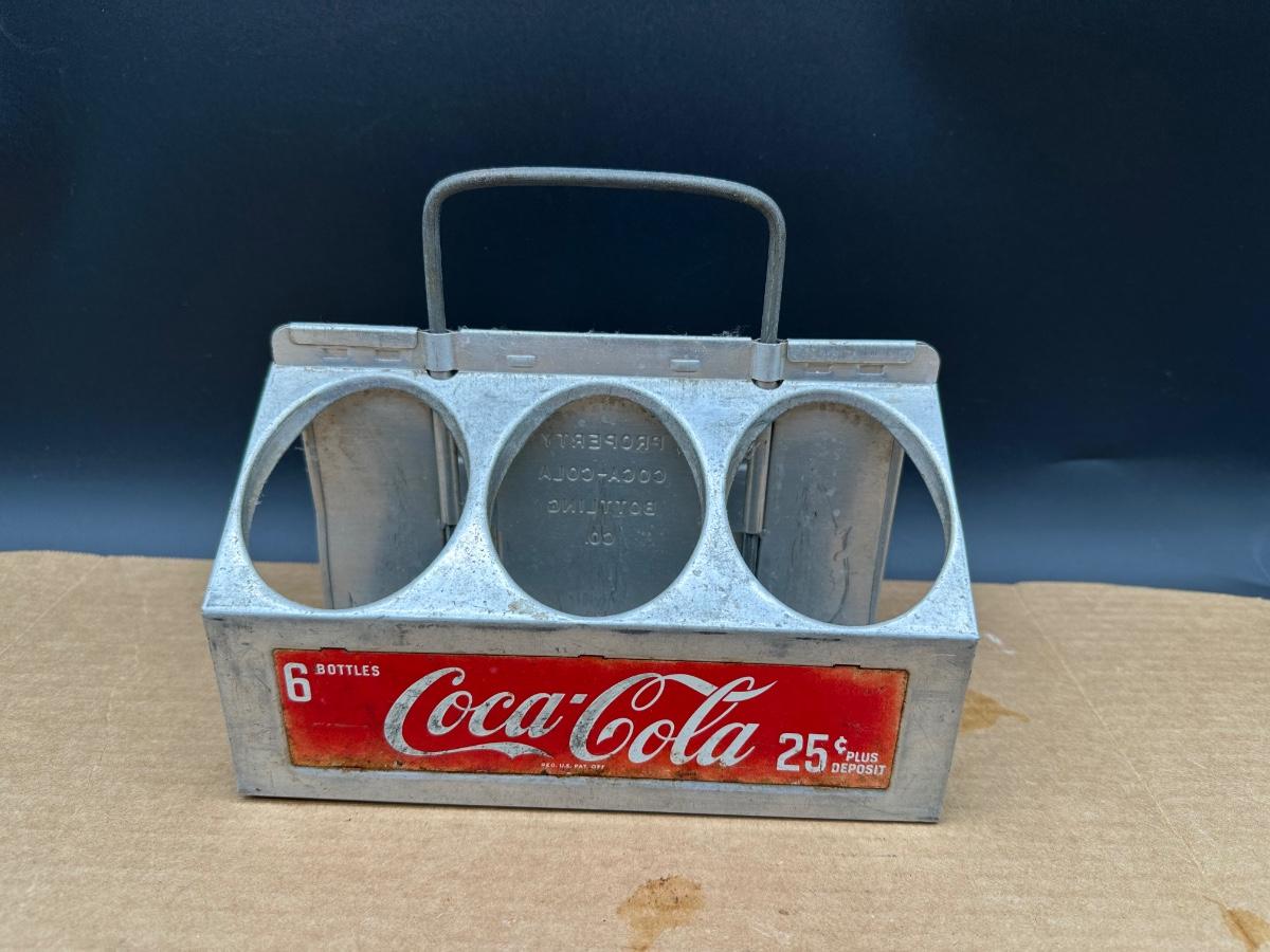 Original aluminum Coca-Cola carrier marked “6 Bottles – Coca-Cola – 25¢ Plus Deposit.”