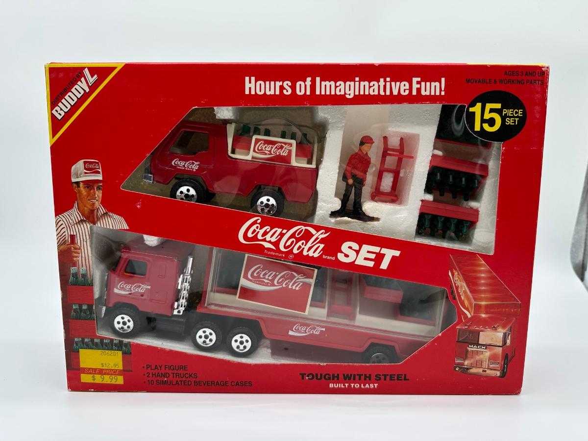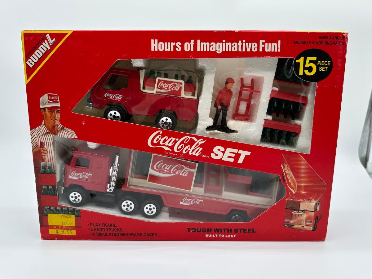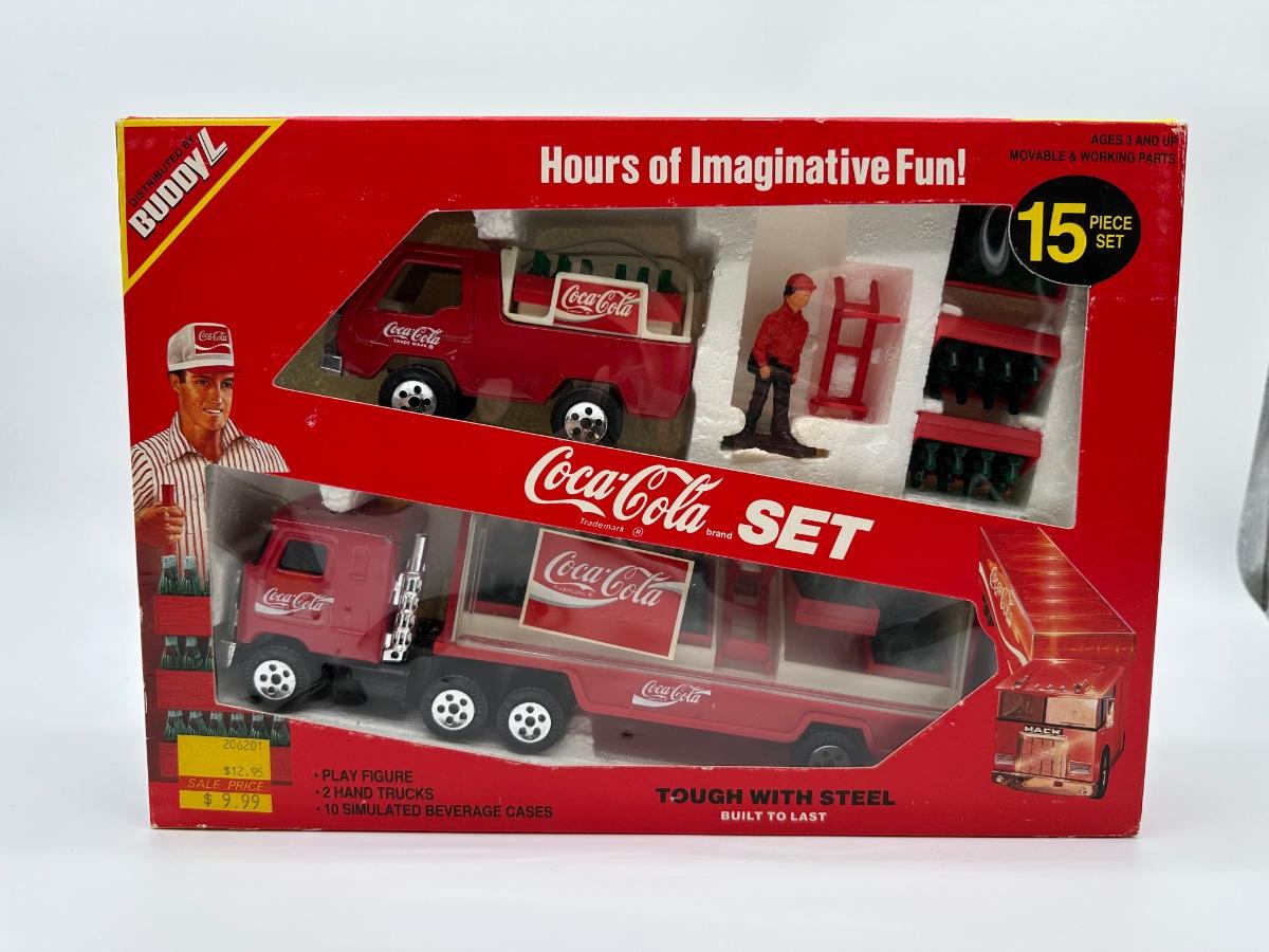 Vintage Coca-Cola branded Buddy L playset featuring classic Coke delivery vehicles and accessories. Set includes multiple Coca-Cola trucks, delivery figure, hand trucks, and beverage crates (15-piece set). Bright original graphics, movable parts, and sturdy construction. Comes with original display box showing wear consistent with age. A great display or collector piece for Coca-Cola, Buddy L, or vintage toy collectors.
