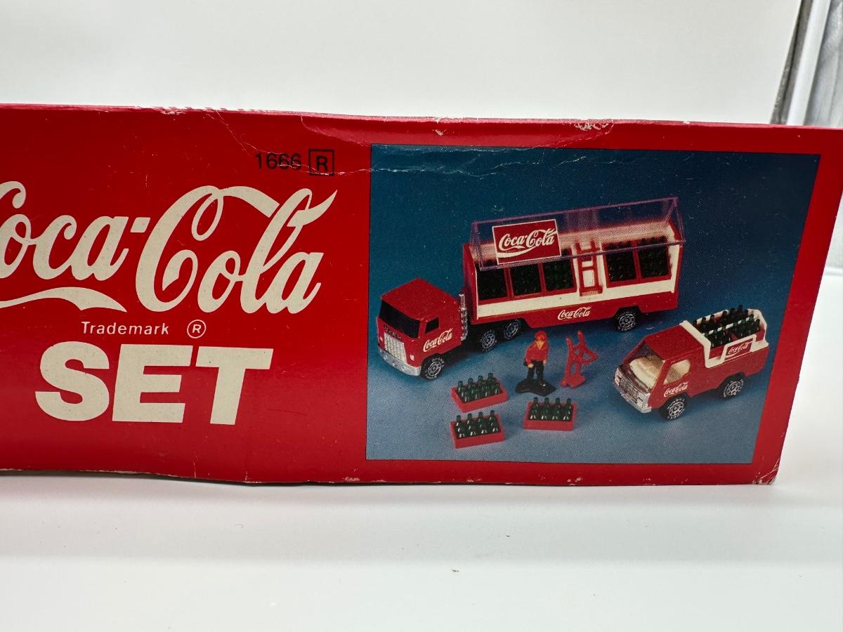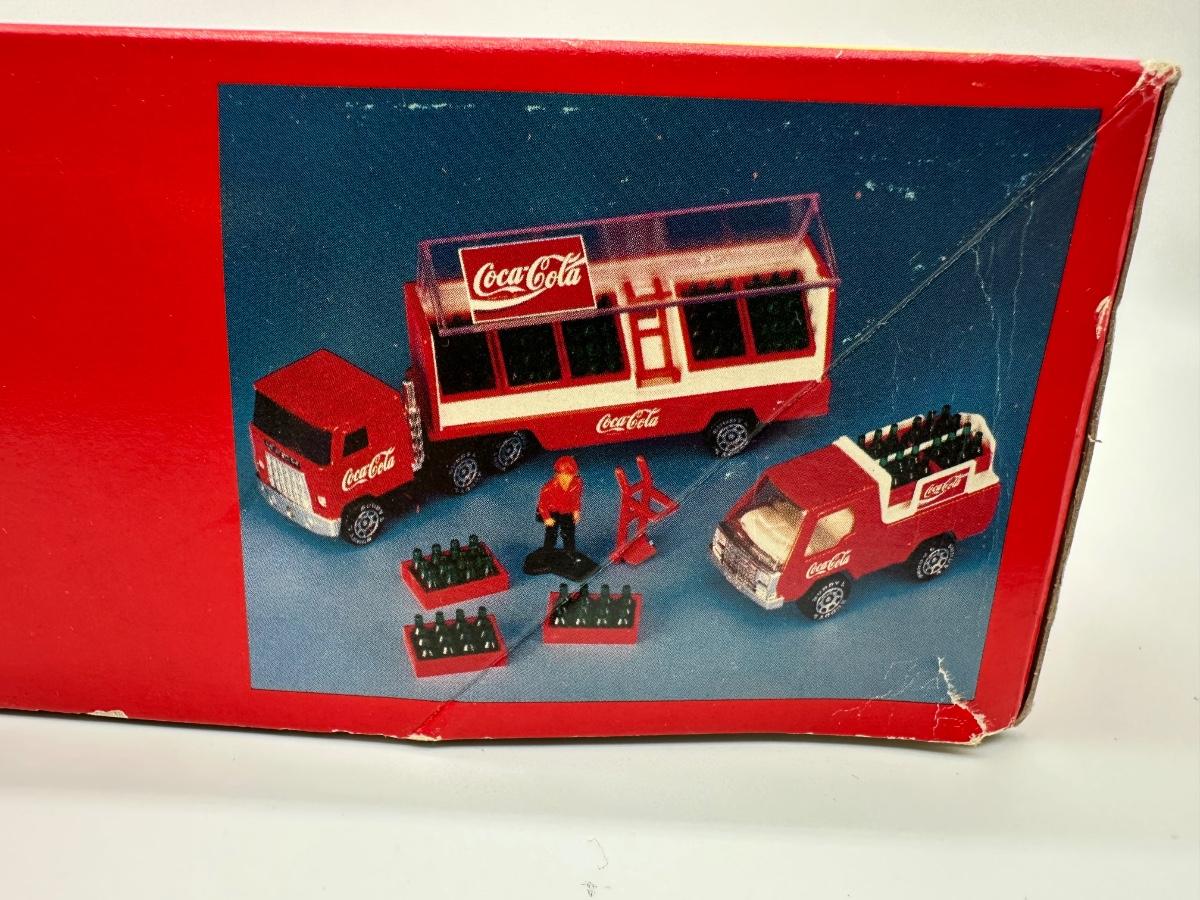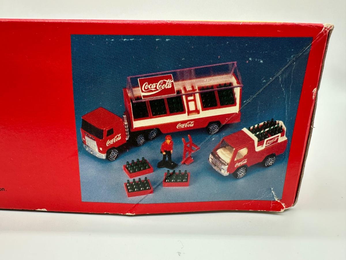 Vintage Coca-Cola branded Buddy L playset featuring classic Coke delivery vehicles and accessories. Set includes multiple Coca-Cola trucks, delivery figure, hand trucks, and beverage crates (15-piece set). Bright original graphics, movable parts, and sturdy construction. Comes with original display box showing wear consistent with age. A great display or collector piece for Coca-Cola, Buddy L, or vintage toy collectors.