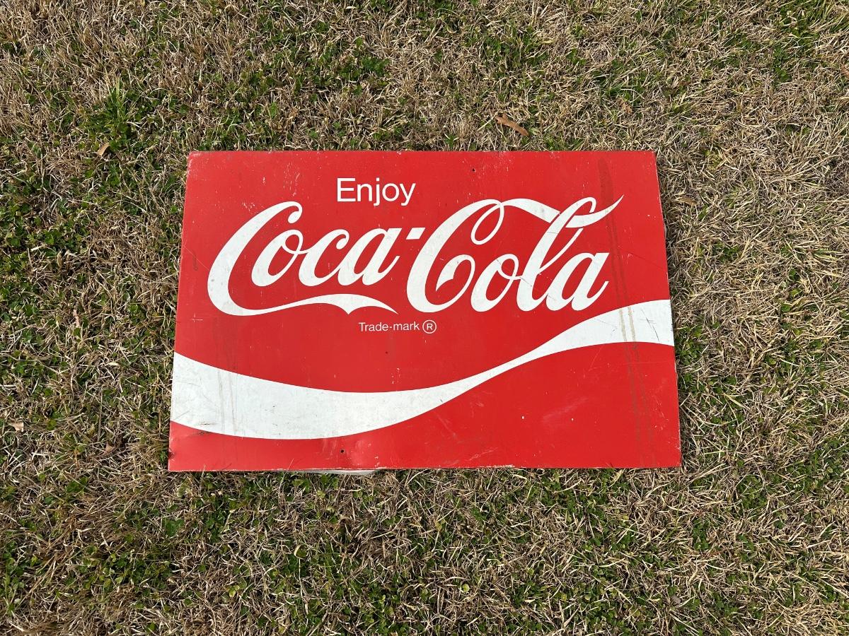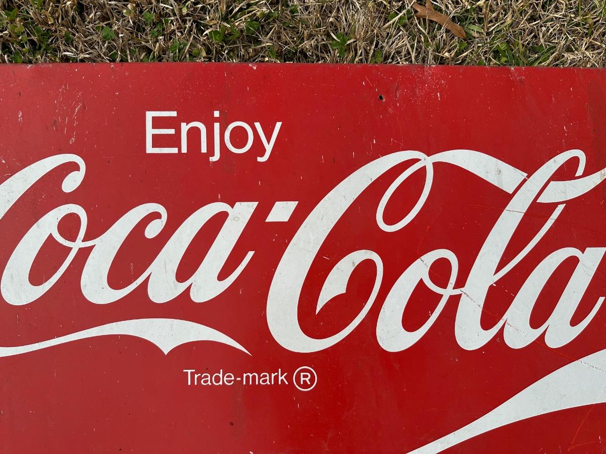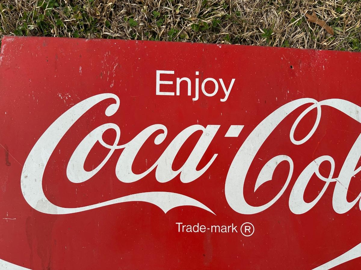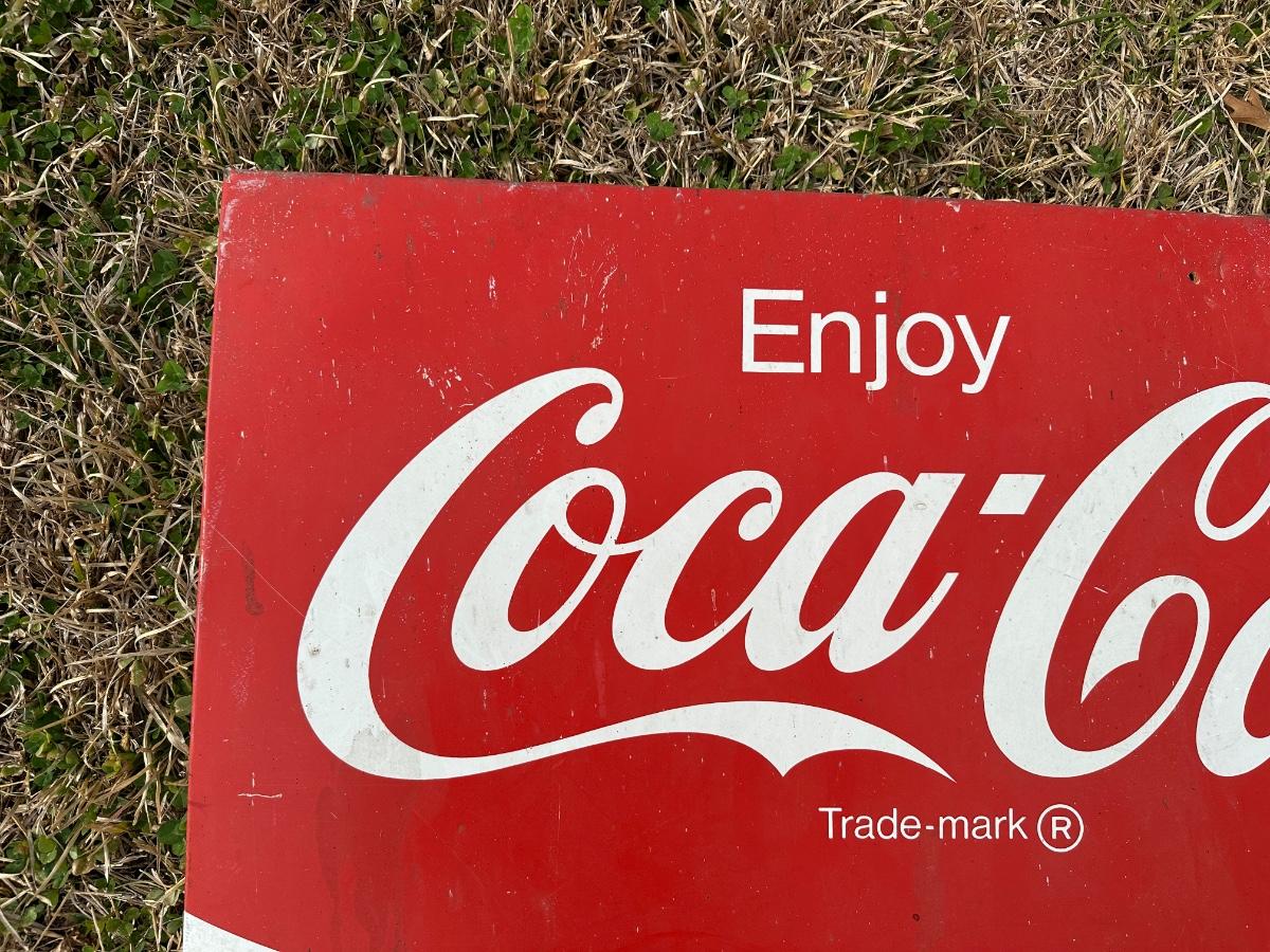 Original vintage Coca-Cola advertising sign featuring the classic “Enjoy Coca-Cola” script logo and wave design.