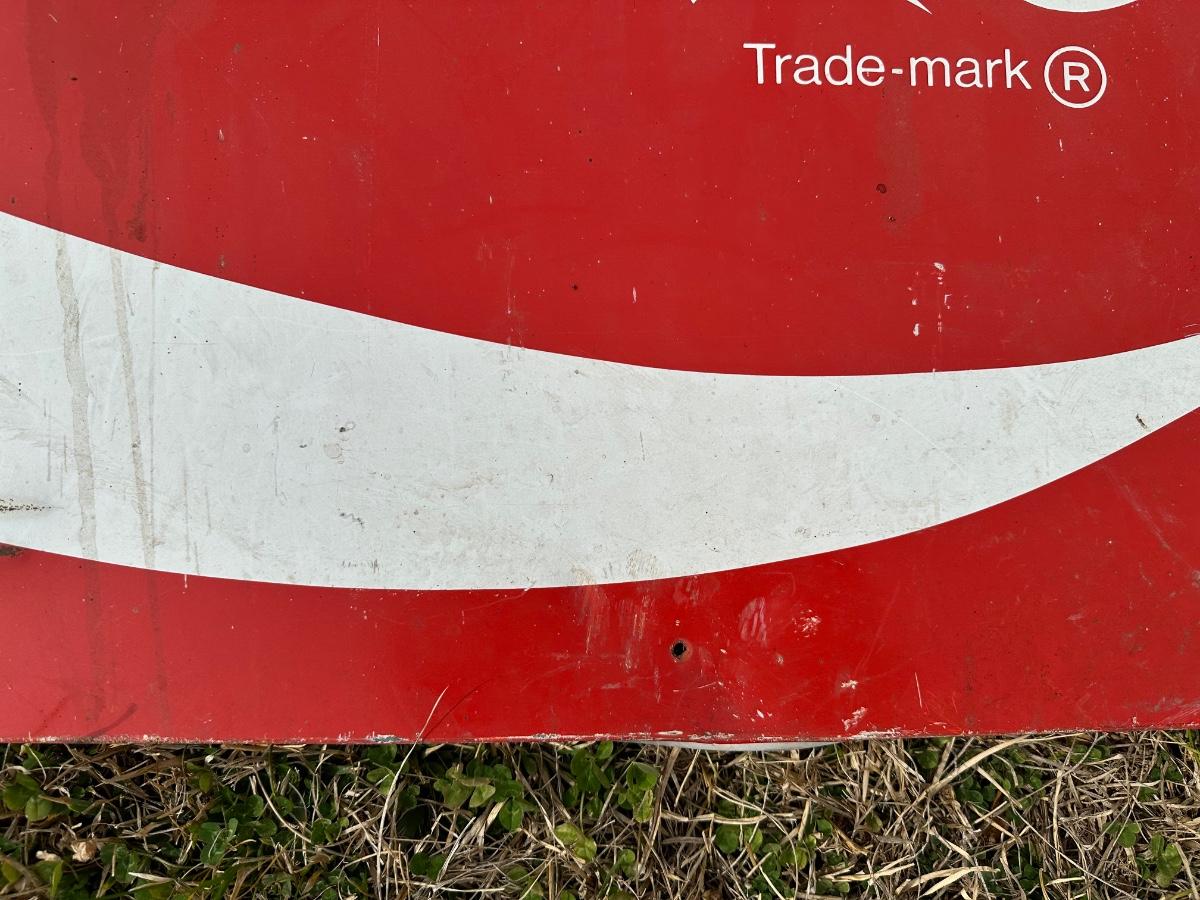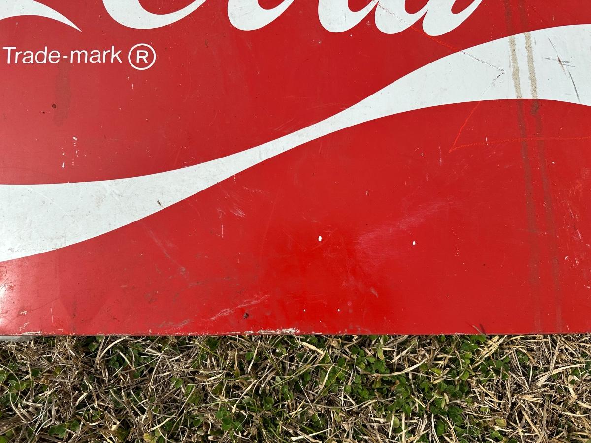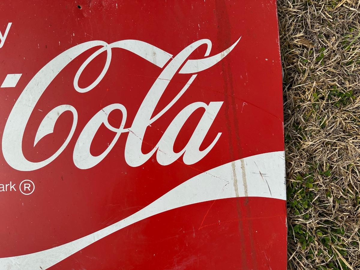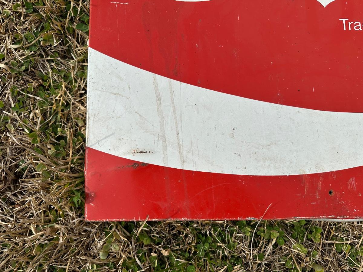 Original vintage Coca-Cola advertising sign featuring the classic “Enjoy Coca-Cola” script logo and wave design.