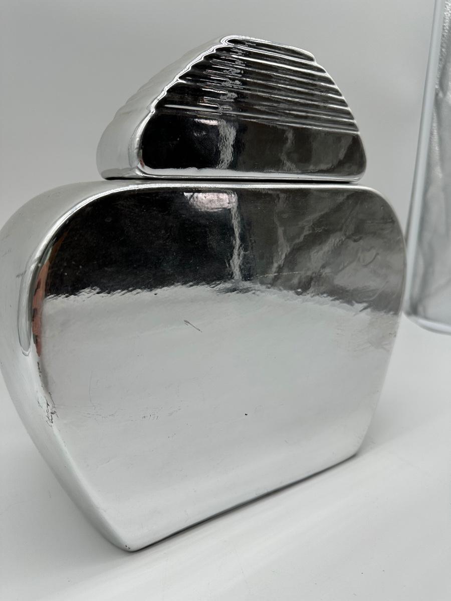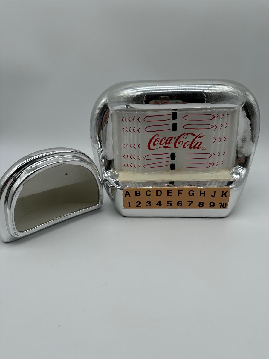 Vintage Coca-Cola chrome-finish jukebox-style countertop display featuring classic Coke branding and decorative faux selection panel. Designed as a nostalgic tabletop piece with a removable lid, commonly used as a cookie jar, candy dish, coin holder, or bar décor accent. Strong mid-century diner and soda fountain appeal.