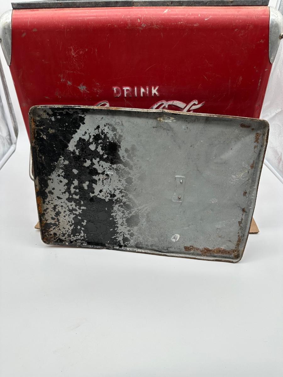Original vintage Coca-Cola metal ice chest with classic “Drink Coca-Cola” script. Heavy-gauge steel construction with metal carry handle, side bail handle, drain plug, and original removable interior liner. Nice authentic patina throughout—great display piece for garage, bar, man cave, or collection. Solid and complete.