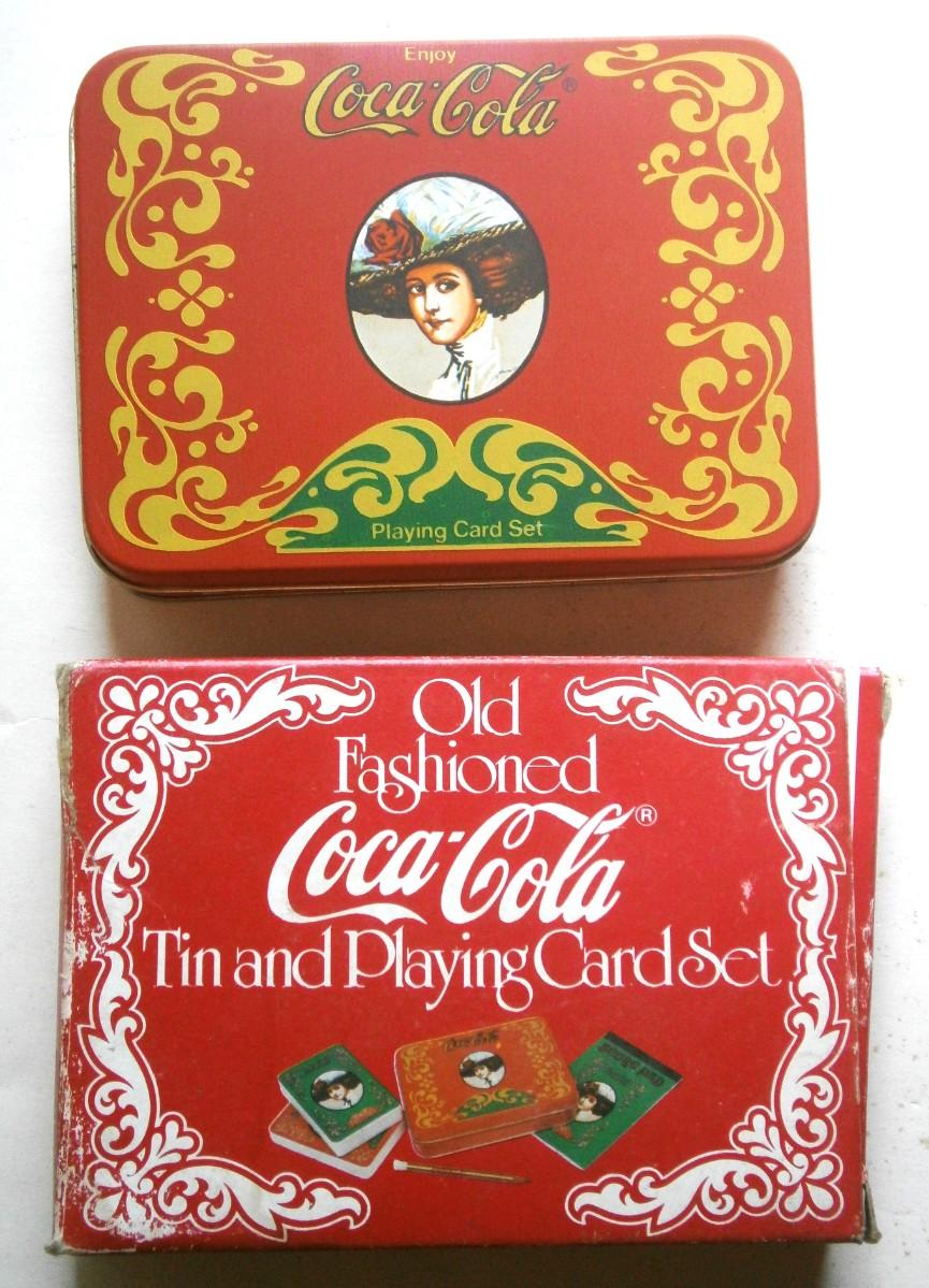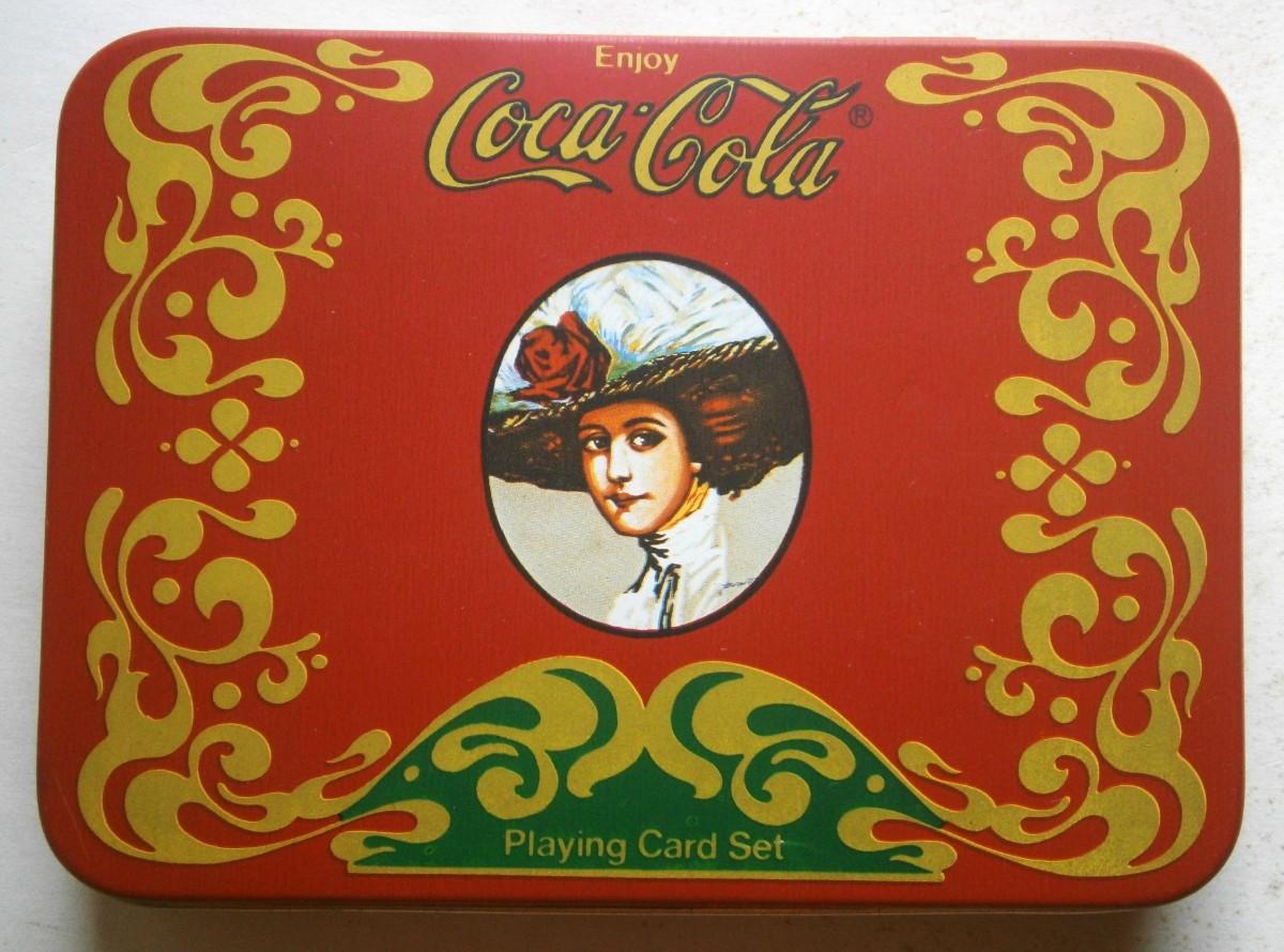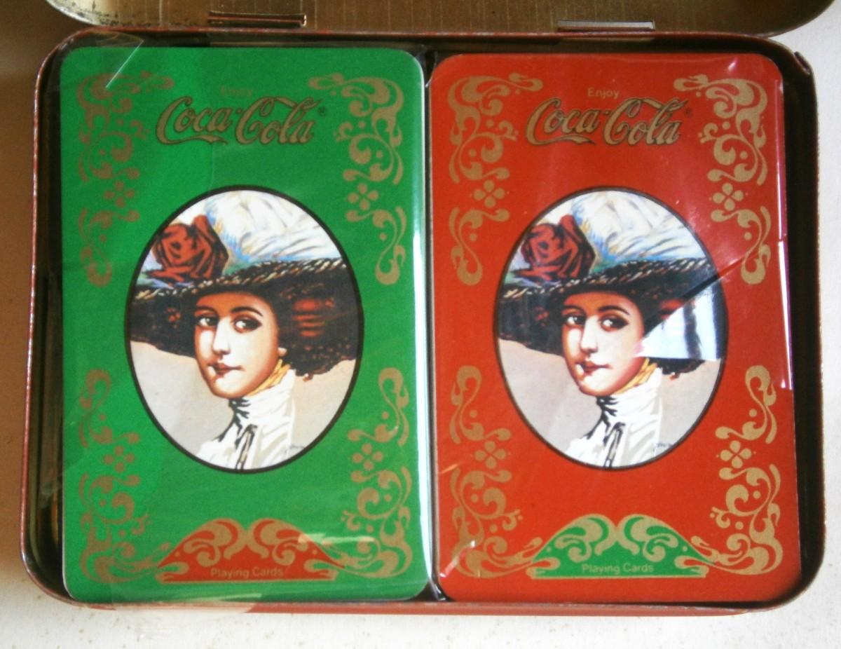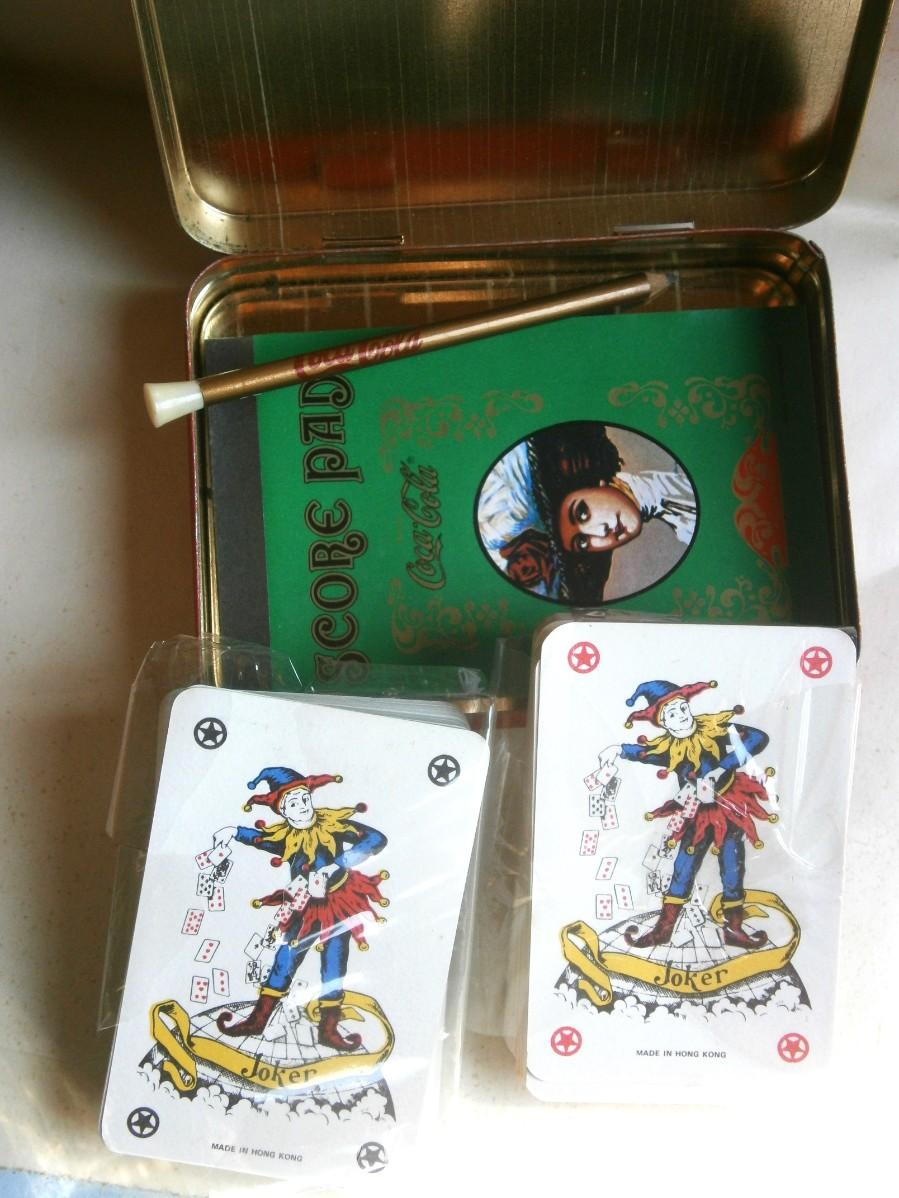 Vintage Coca-Cola Playing Cards in Original Tin Box, also the original Cardboard box, includes pencil and score pad, 5 1/8 x 3 3/4 in.