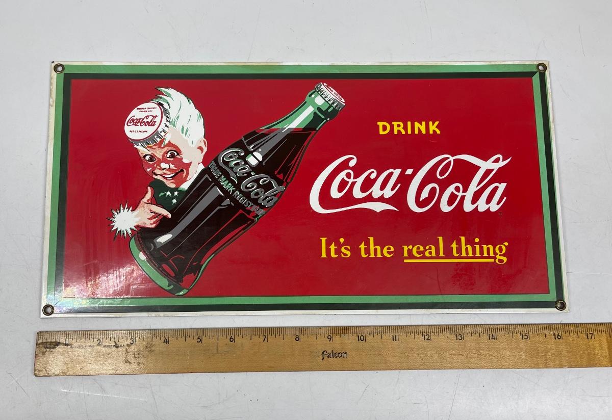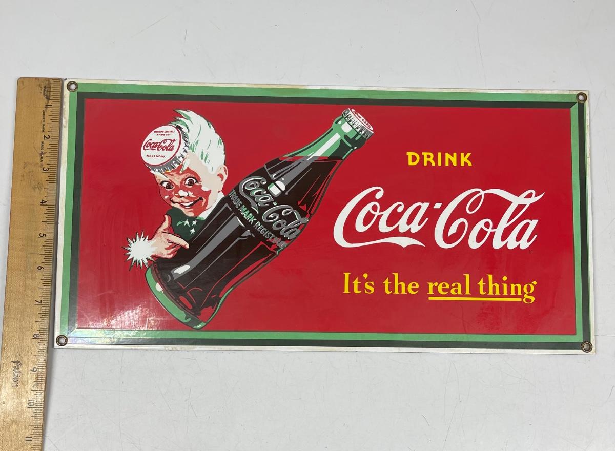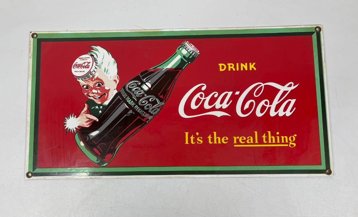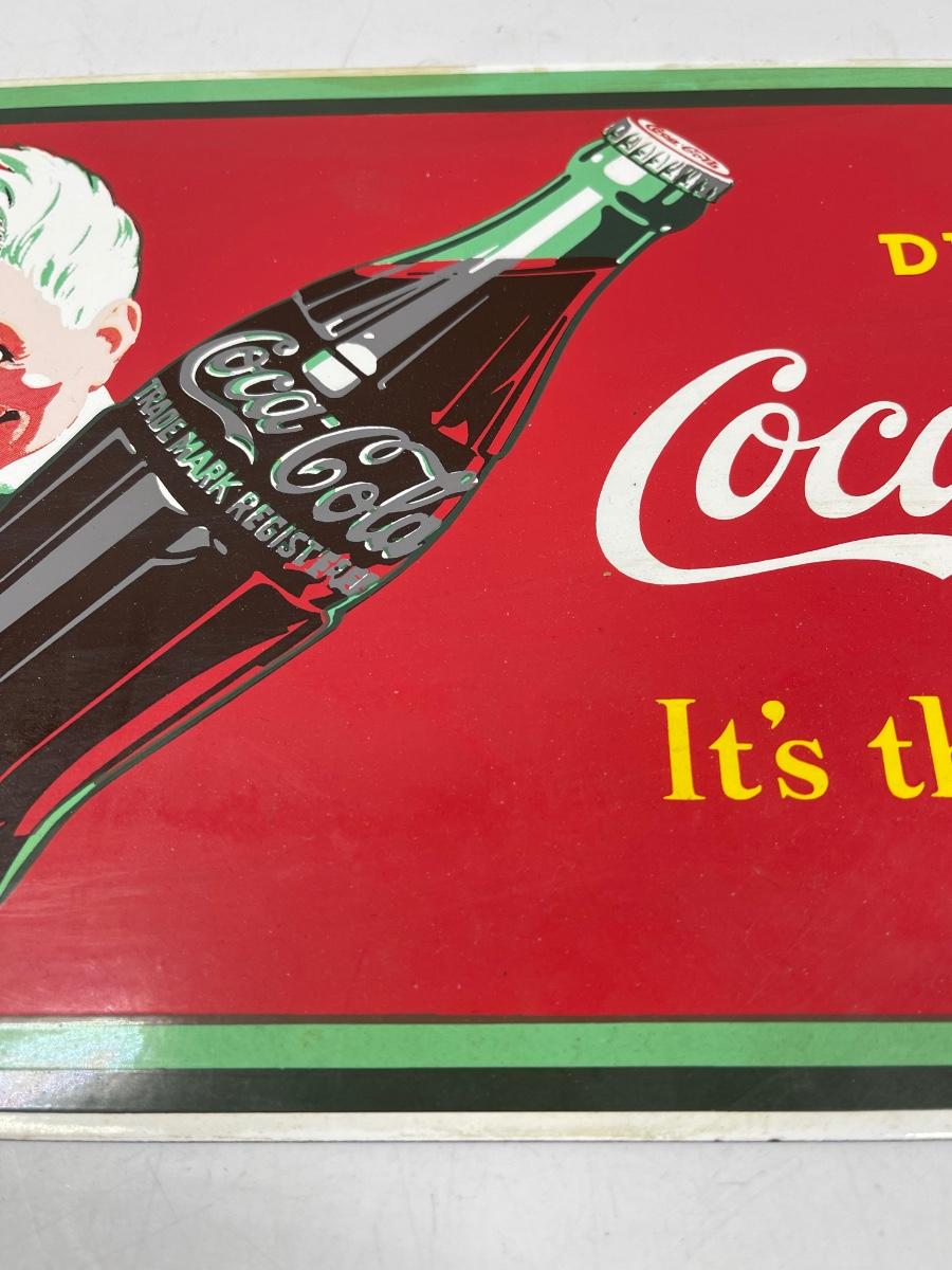 Vintage Coca-Cola Sign with Sprite Boy Holding Coke Bottle Painted Steel Rectangular Advertisement