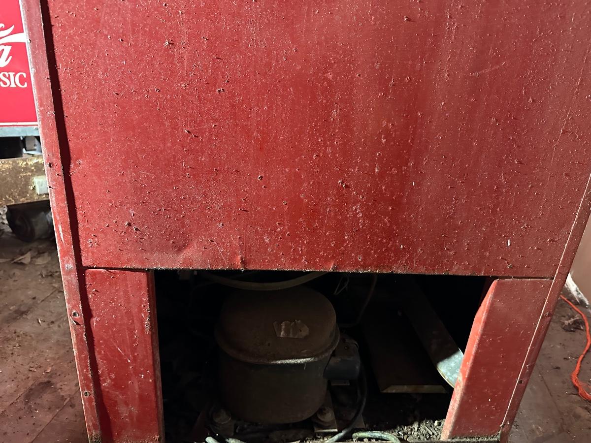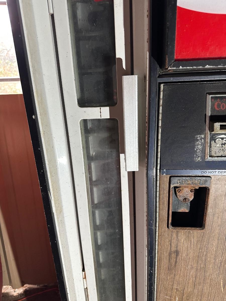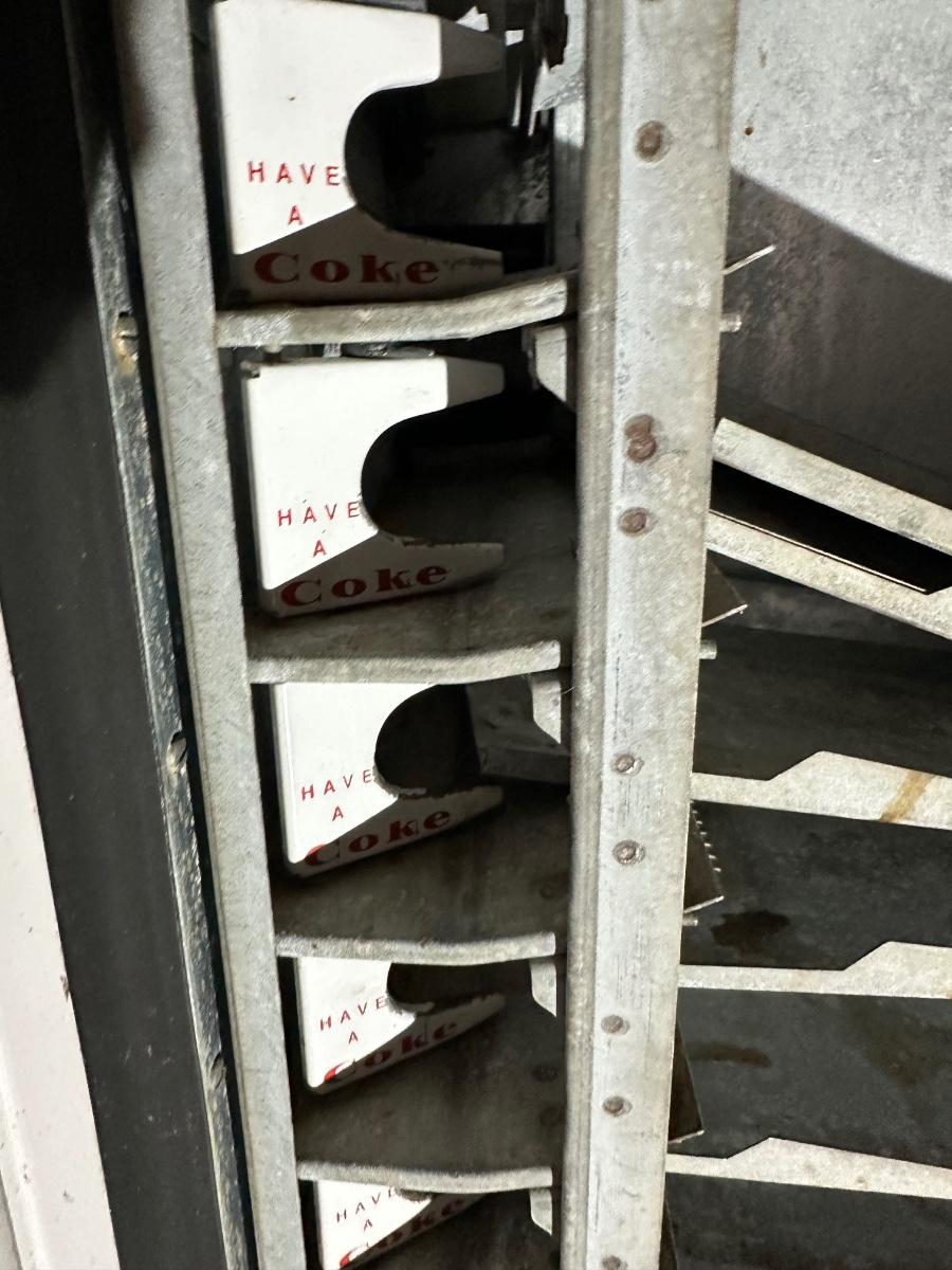 Authentic vintage Coca-Cola upright vending machine manufactured by Cavalier Corporation (Chattanooga, Tennessee). Classic red-and-white “Enjoy Coca-Cola” and “Here’s the Real Thing” graphics with original bottle racks and internal metal components present