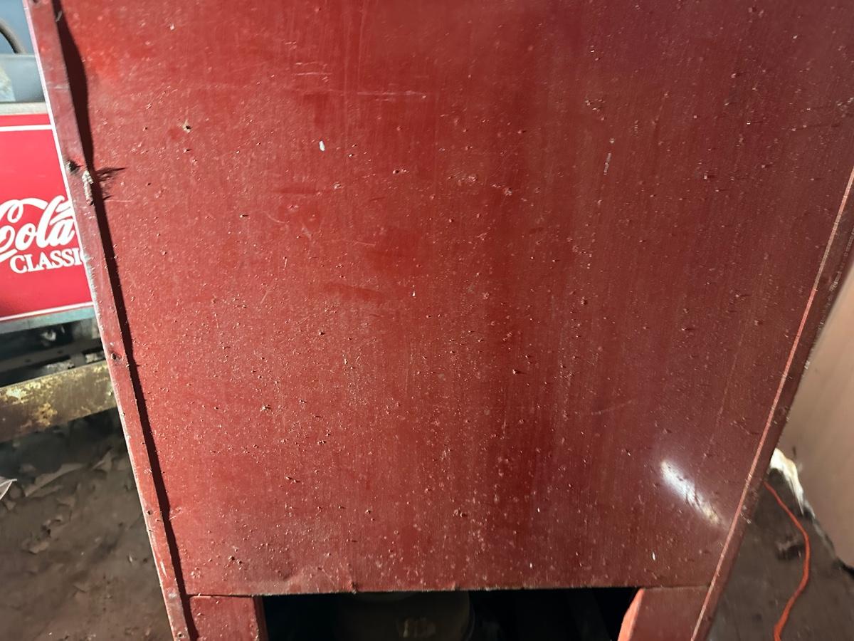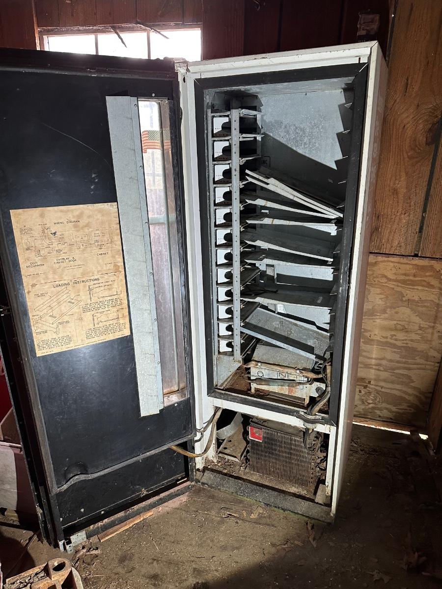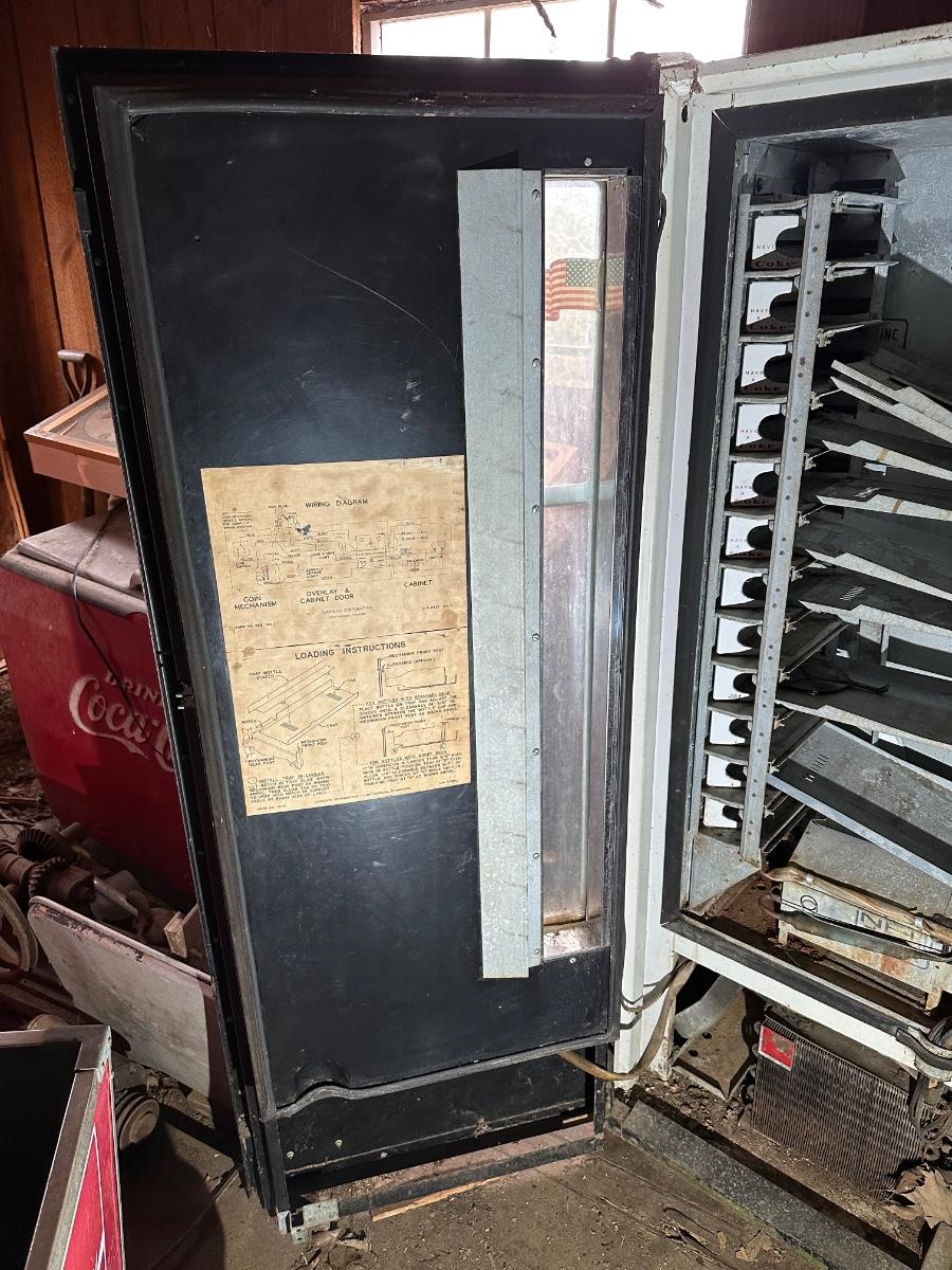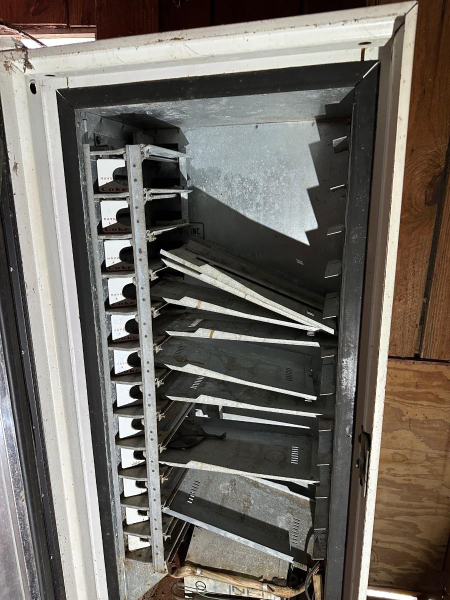 Authentic vintage Coca-Cola upright vending machine manufactured by Cavalier Corporation (Chattanooga, Tennessee). Classic red-and-white “Enjoy Coca-Cola” and “Here’s the Real Thing” graphics with original bottle racks and internal metal components present