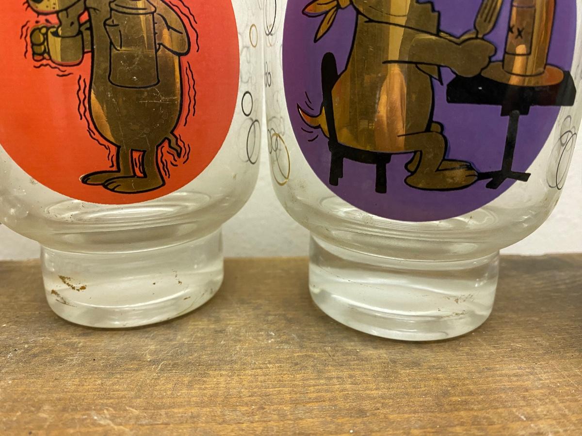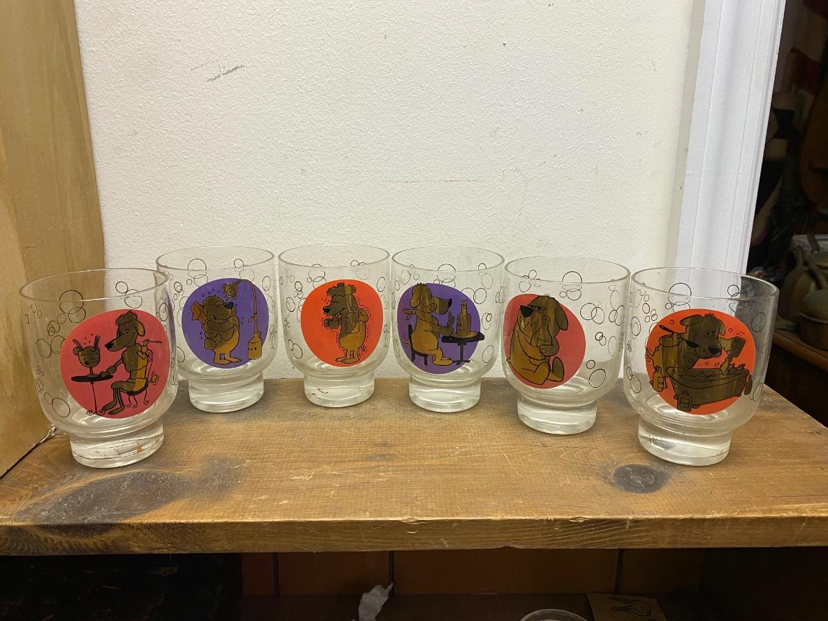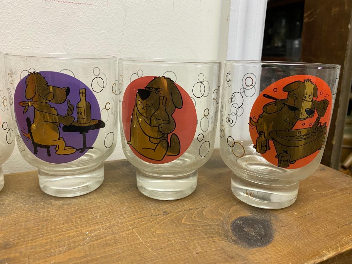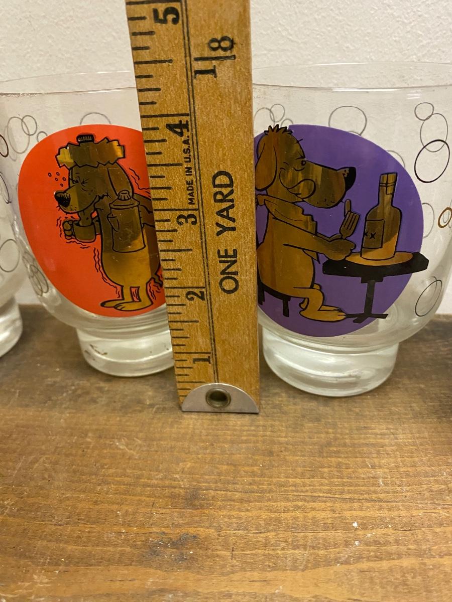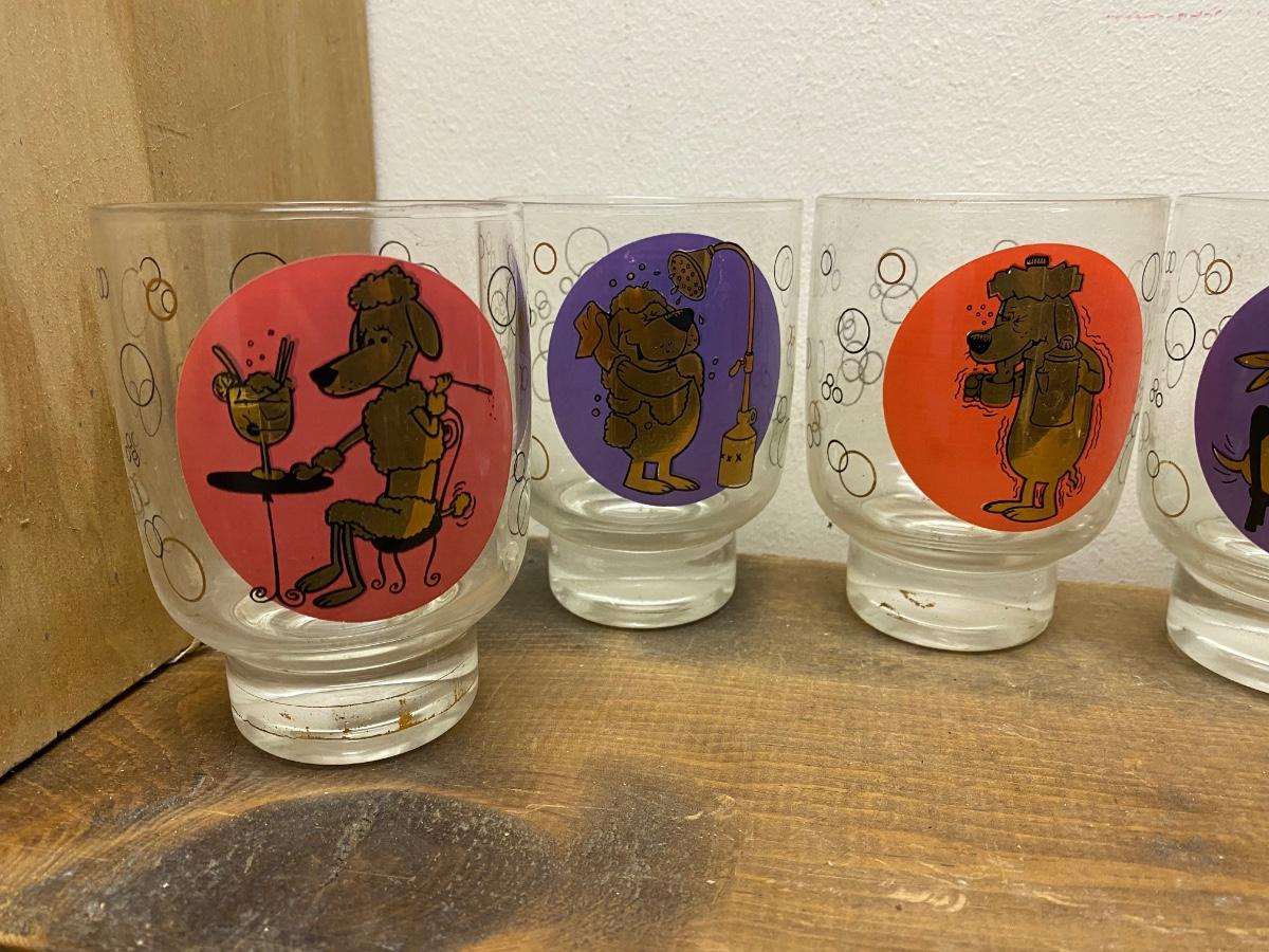 Set of 6 vintage tumblers with dogs in various drinking situations. Excellent condition. 4.5" high