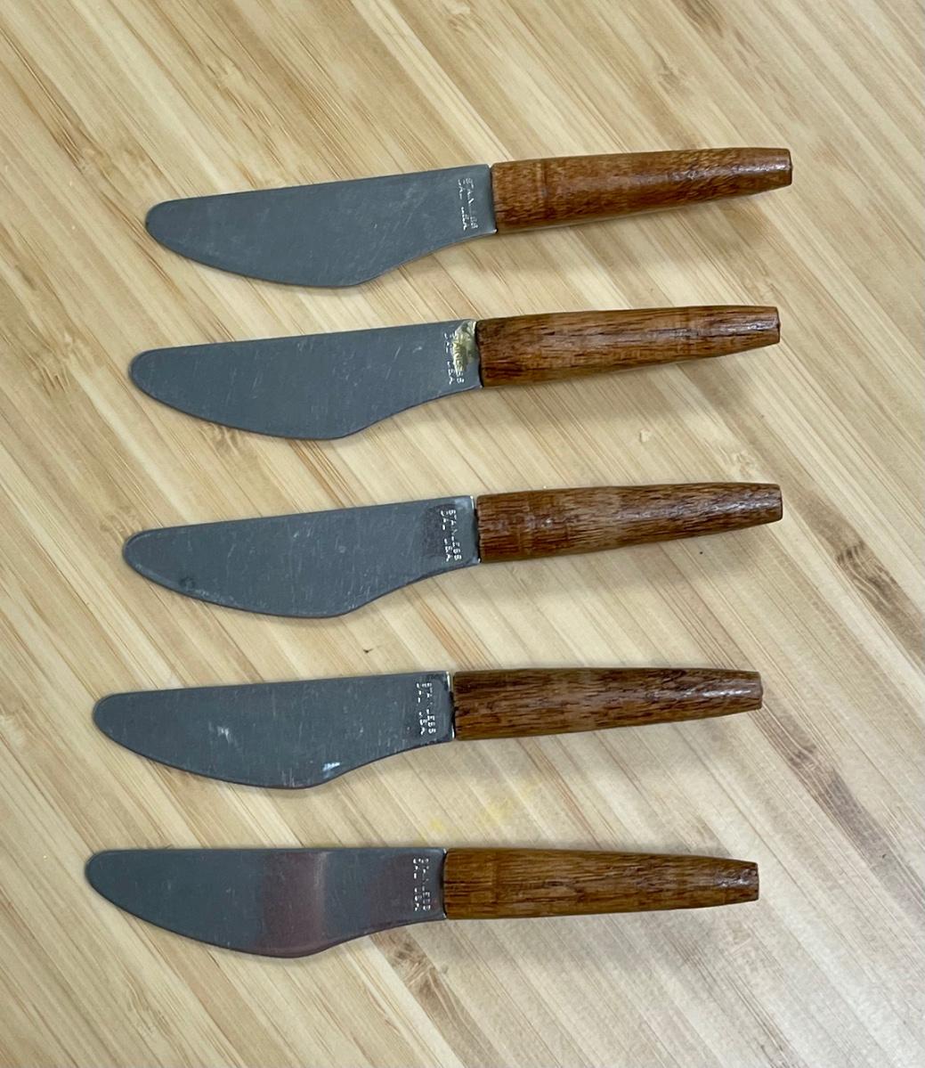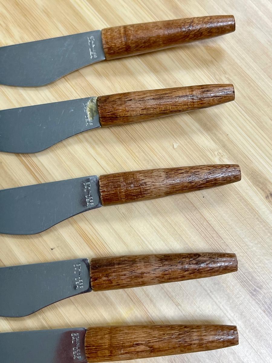 Cute set of 4” knives with 2” blades, marked stainless DAL. Great for serving appetizers. Nice addition to any Charcuterie platter. Good condition.