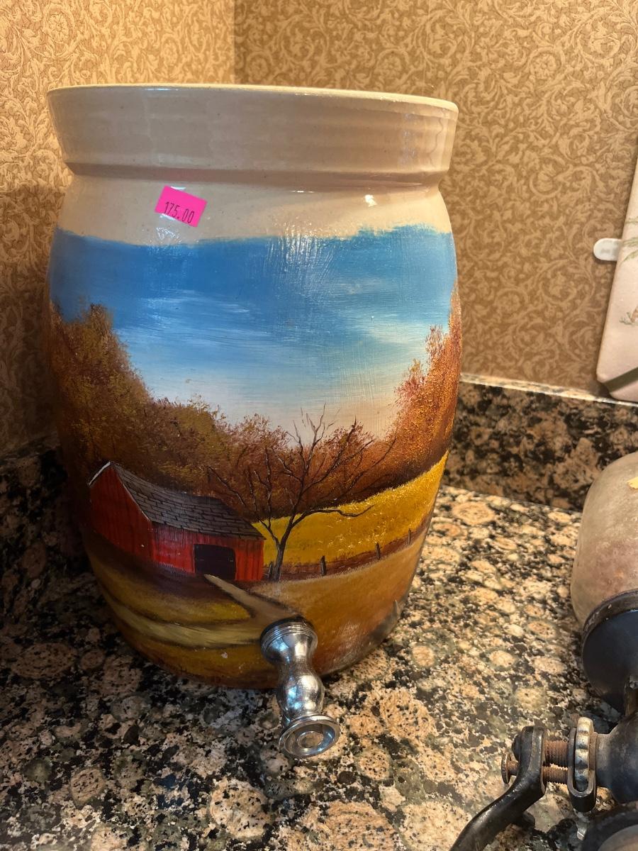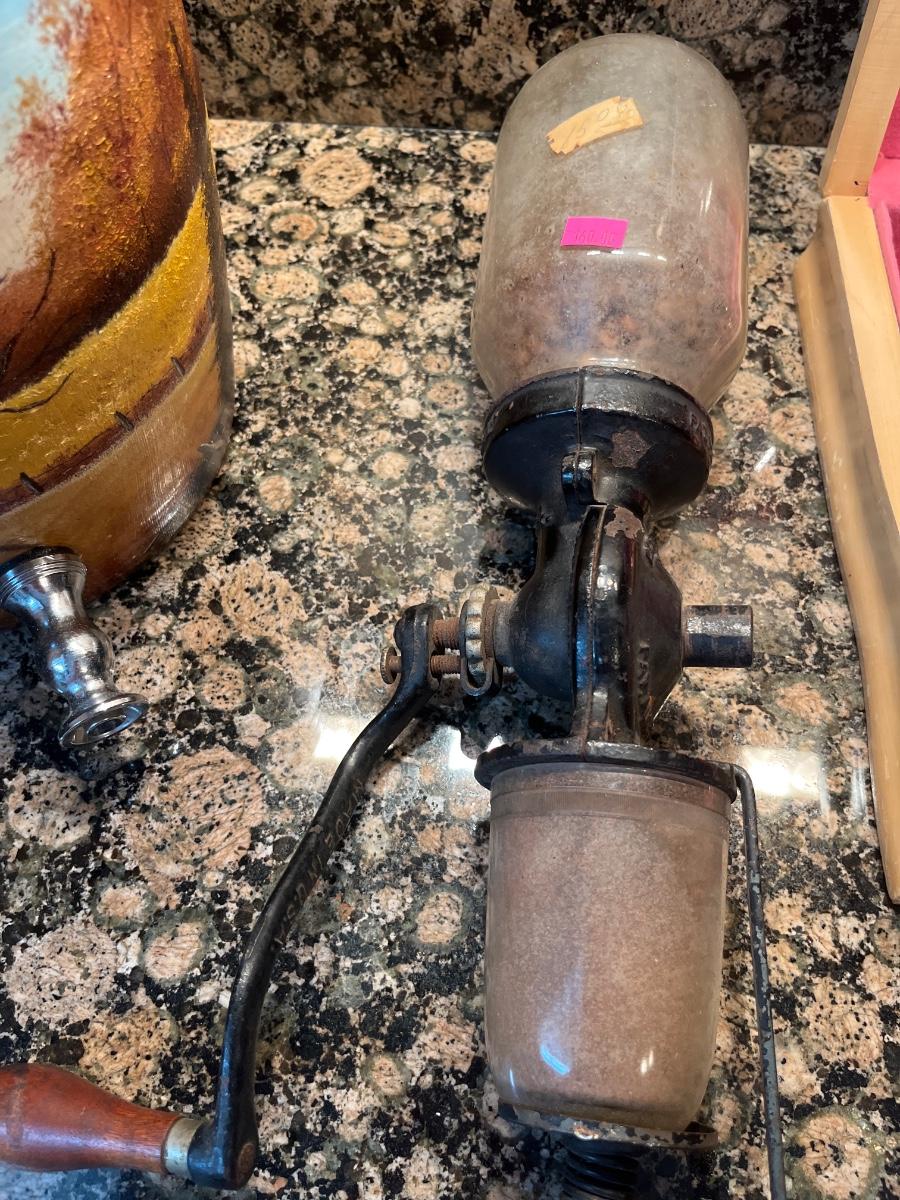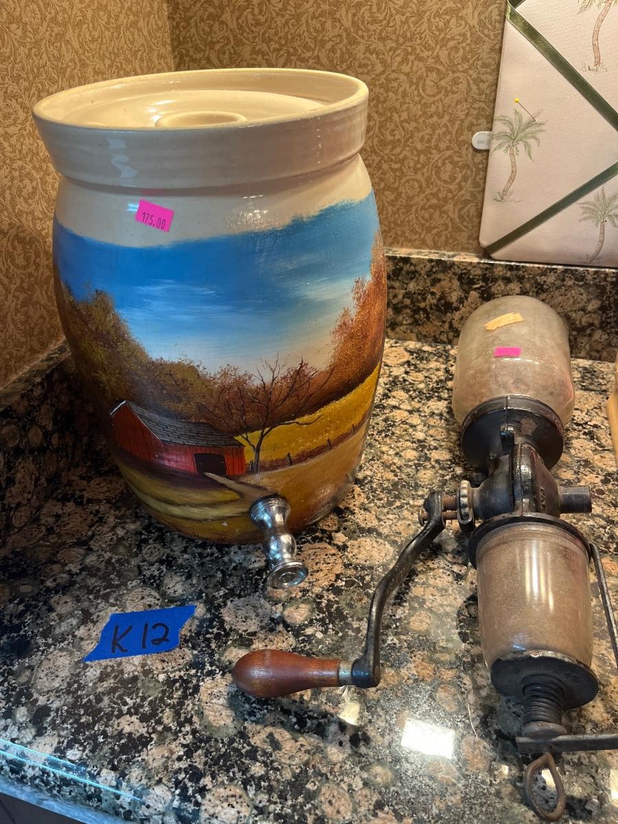 Vintage Coffee Grinder and Crock Dispenser with scenery.