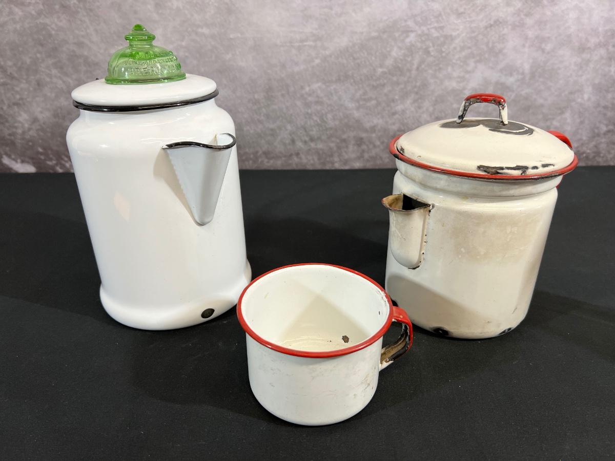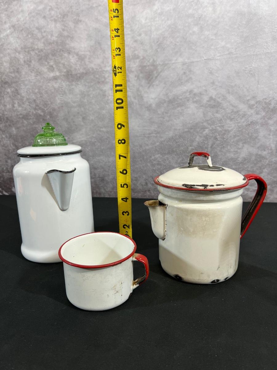 One Enamelware Coffee Pitcher Pot Green Glass Top Percolator, One vintage pot with matching Mug