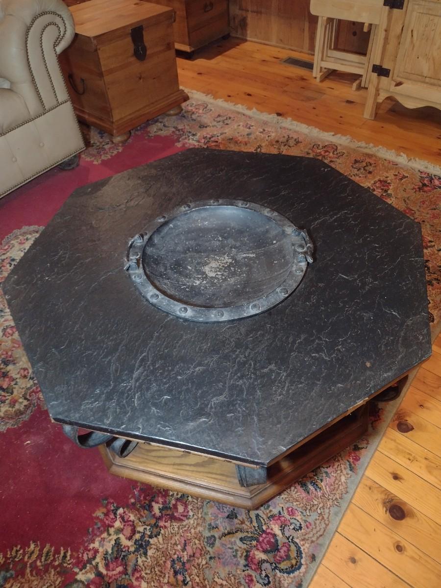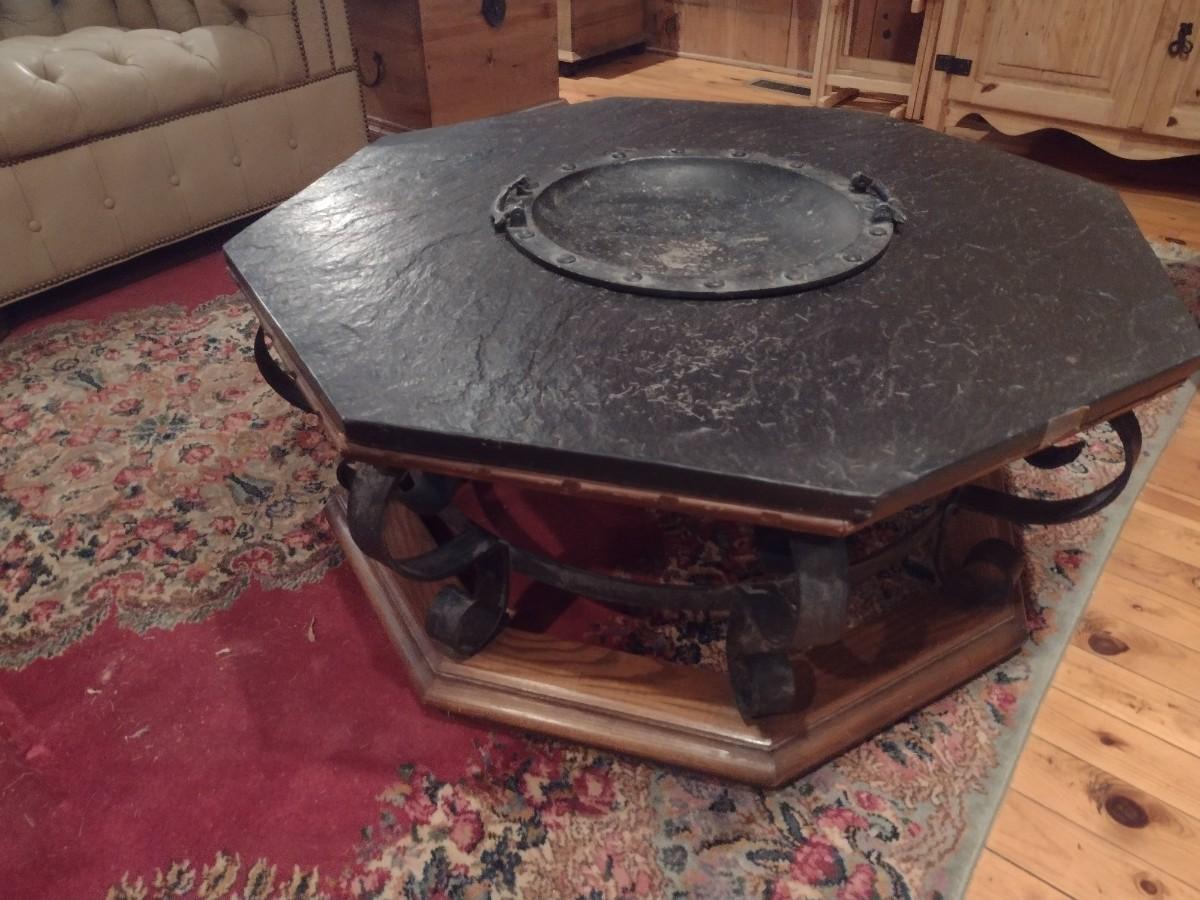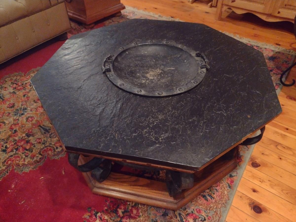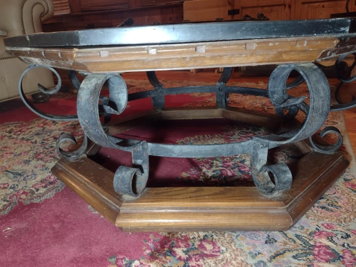 Vintage Coffee Table. Stone top with wood and cast metal frame. Metal bowl in middle is removable. PLEASE NOTE:. Due to no internet connection or wireless service, all invoices must be prepaid via PayPal, Stripe, or Zelle prior to arrival at pick up. Exact change cash onsite is acceptable but absolutely no debit or credit cards at time of pick up.