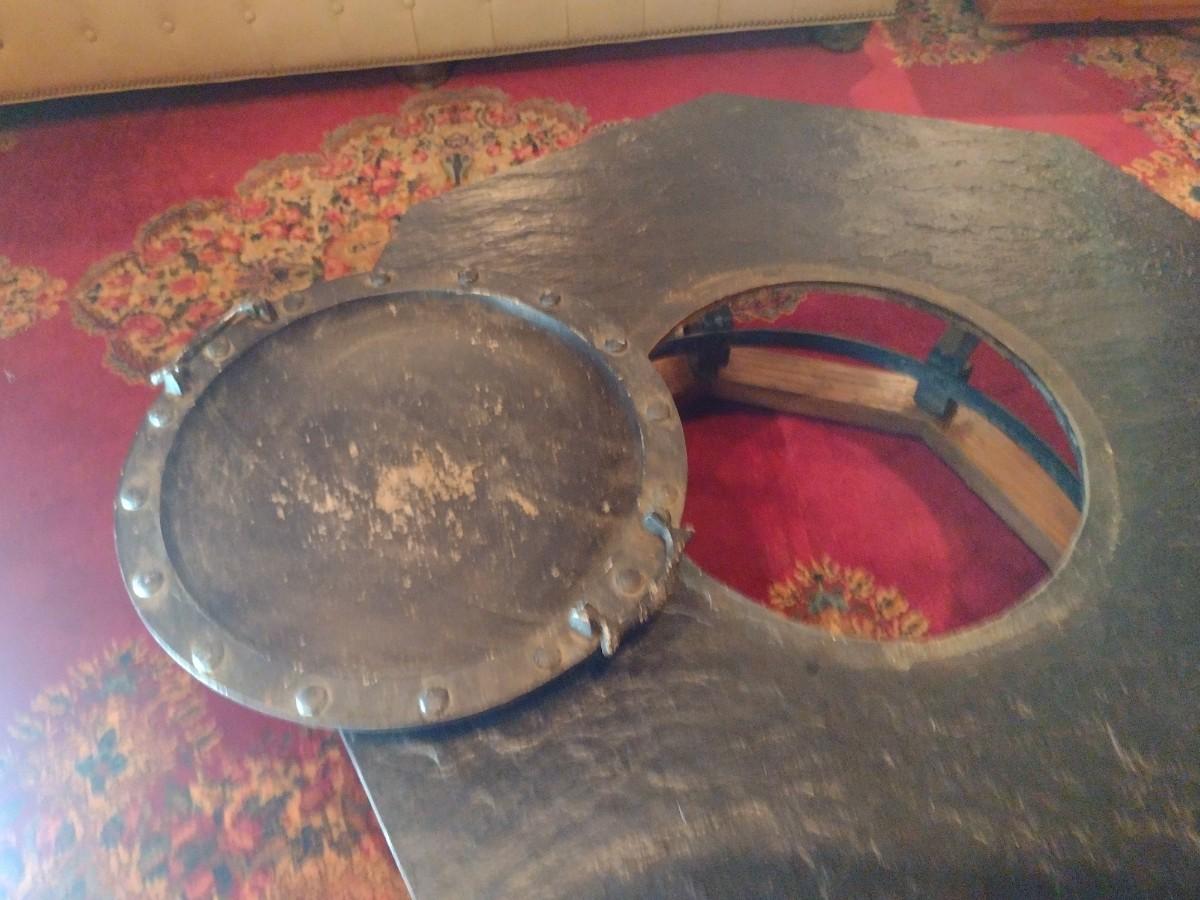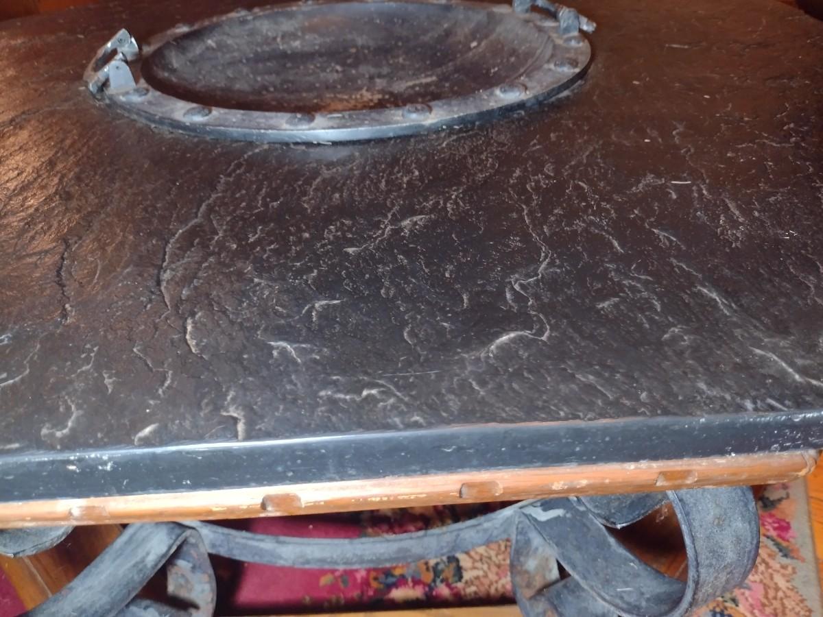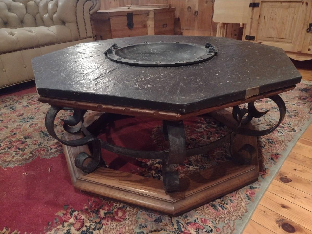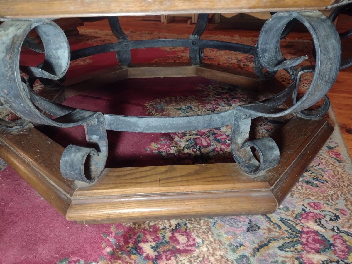 Vintage Coffee Table. Stone top with wood and cast metal frame. Metal bowl in middle is removable. PLEASE NOTE:. Due to no internet connection or wireless service, all invoices must be prepaid via PayPal, Stripe, or Zelle prior to arrival at pick up. Exact change cash onsite is acceptable but absolutely no debit or credit cards at time of pick up.