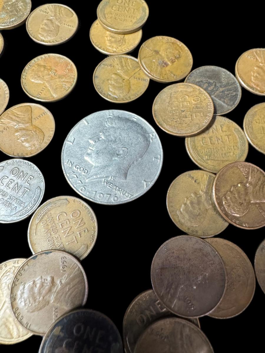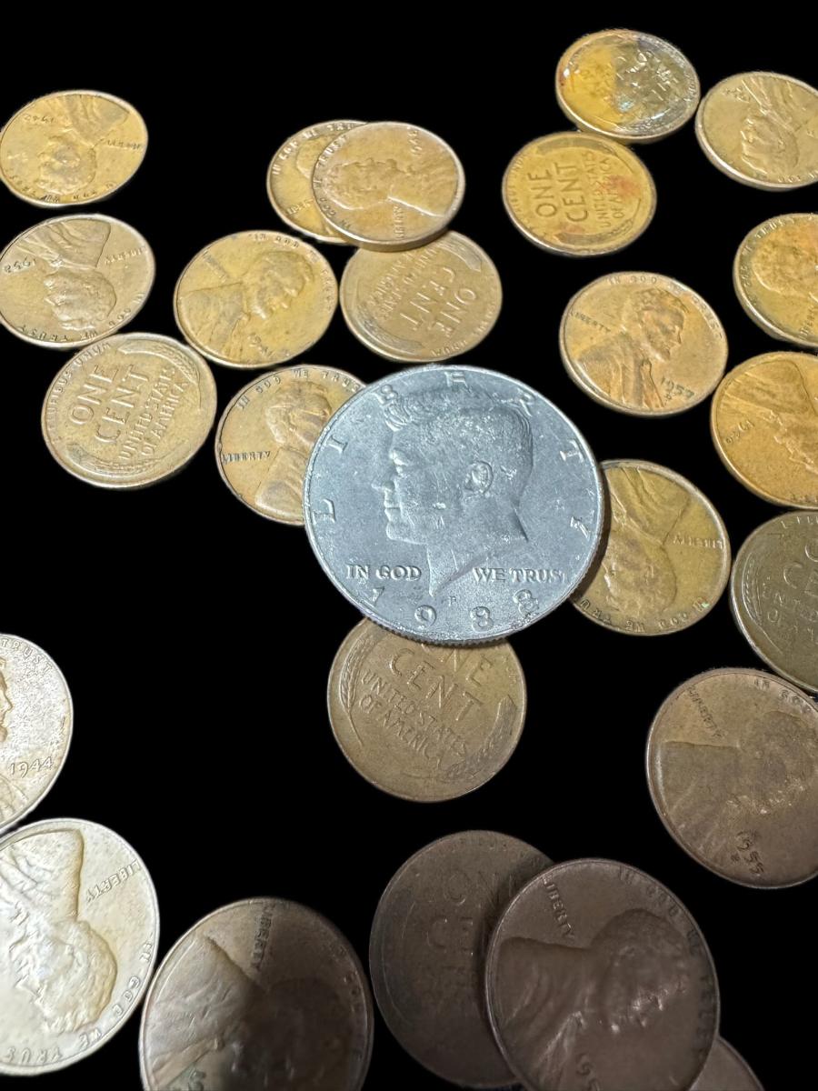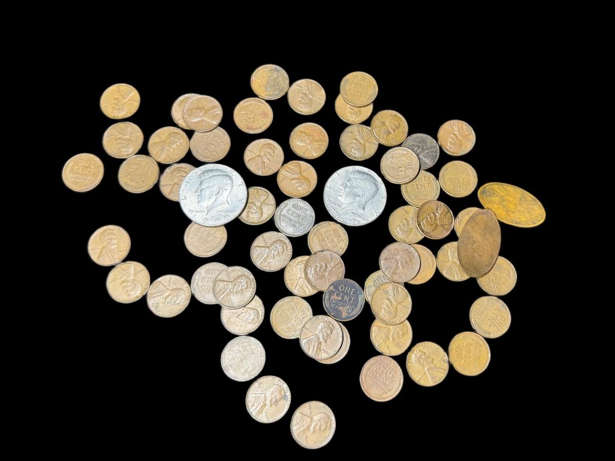 Includes 58 Lincoln cents from the 1920s to the 1950s, two Kennedy half dollars, and two flattened (souvenir) pennies. Total of 62 pieces. [RM]