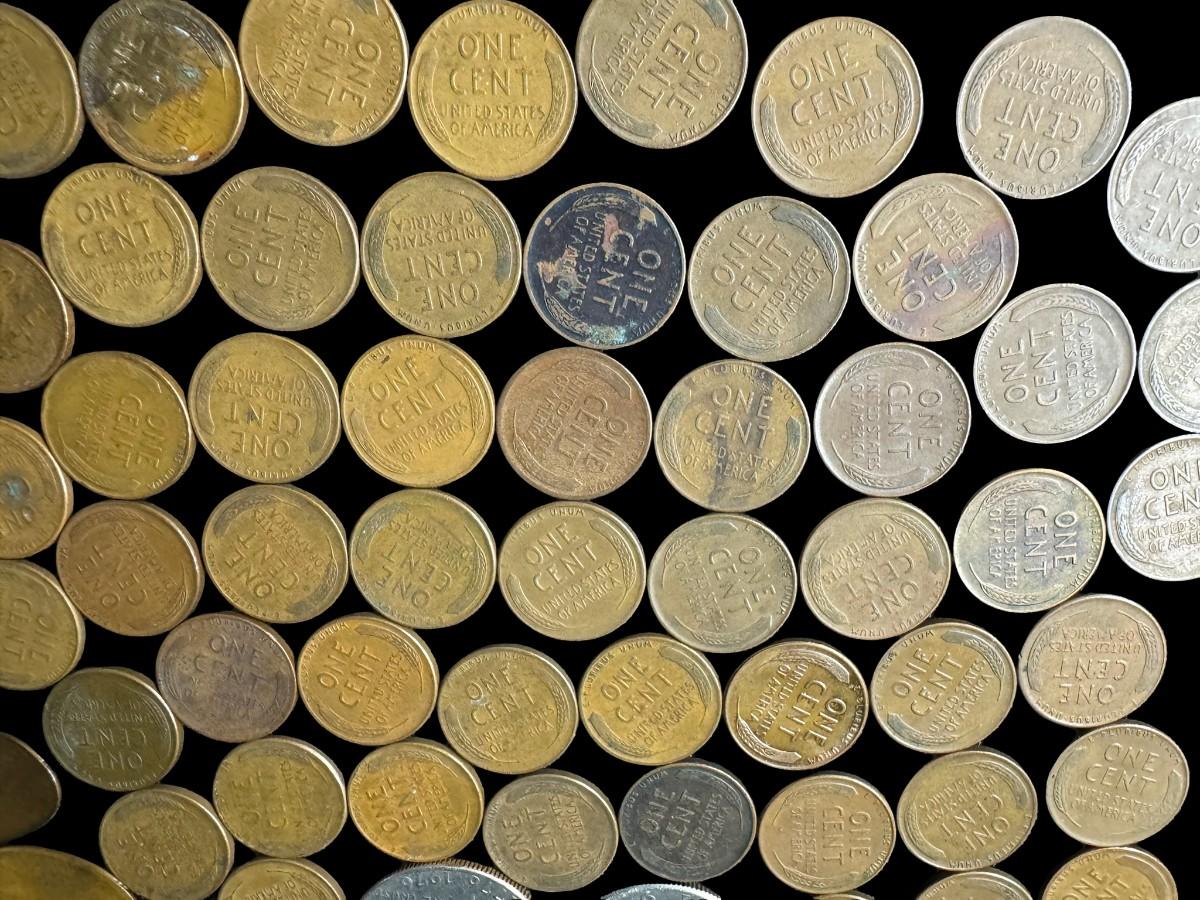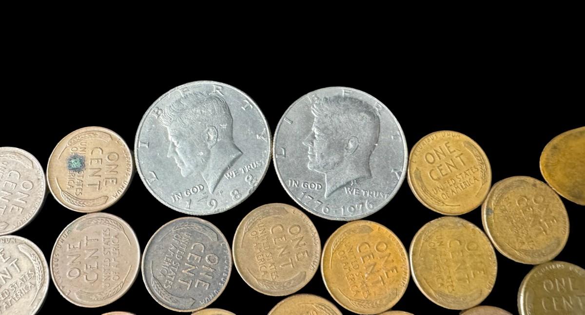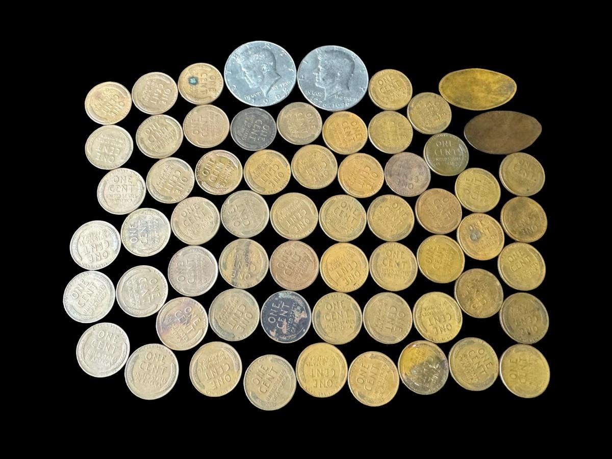 Includes two Kennedy half dollars, 58 Lincoln cents from the 1920s to the 1950s, and two flattened (souvenir) pennies. Total of 62 pieces. [RS]