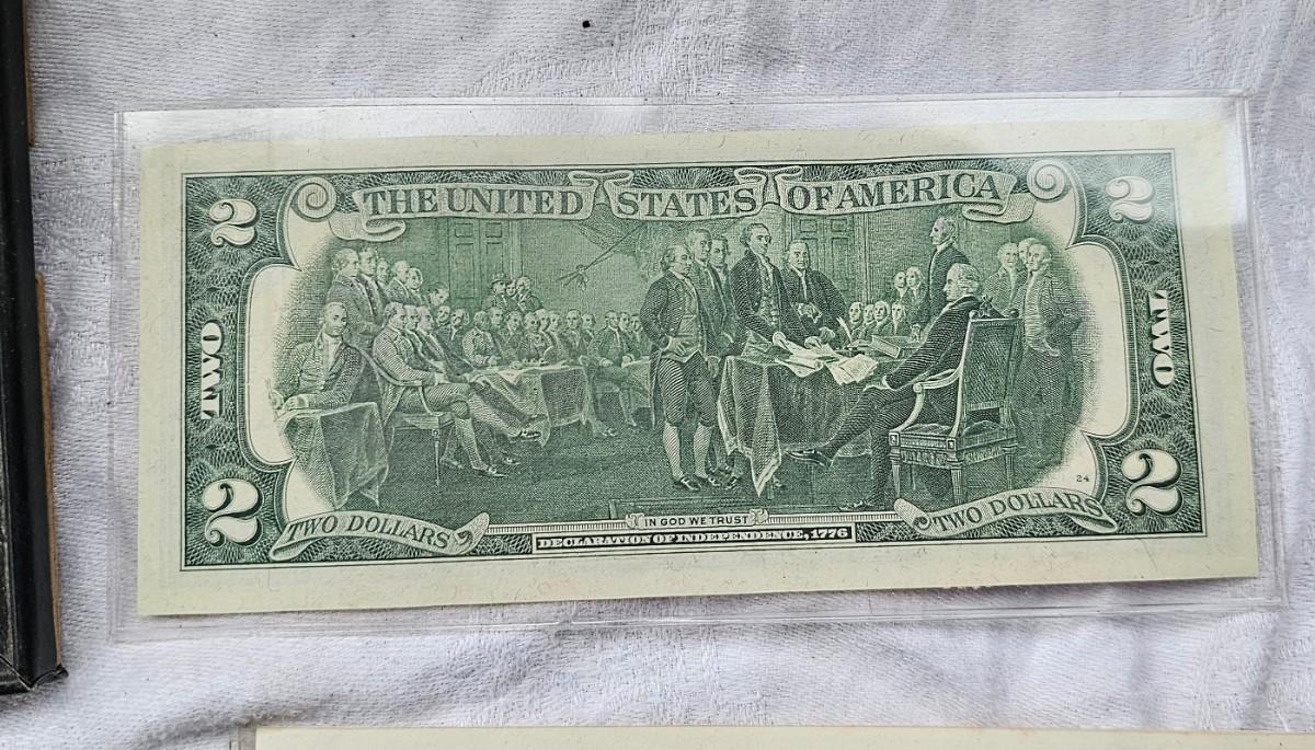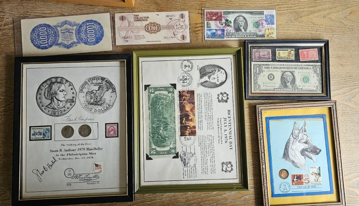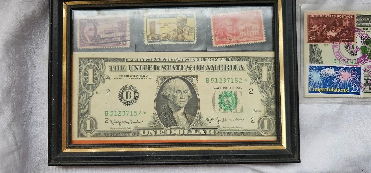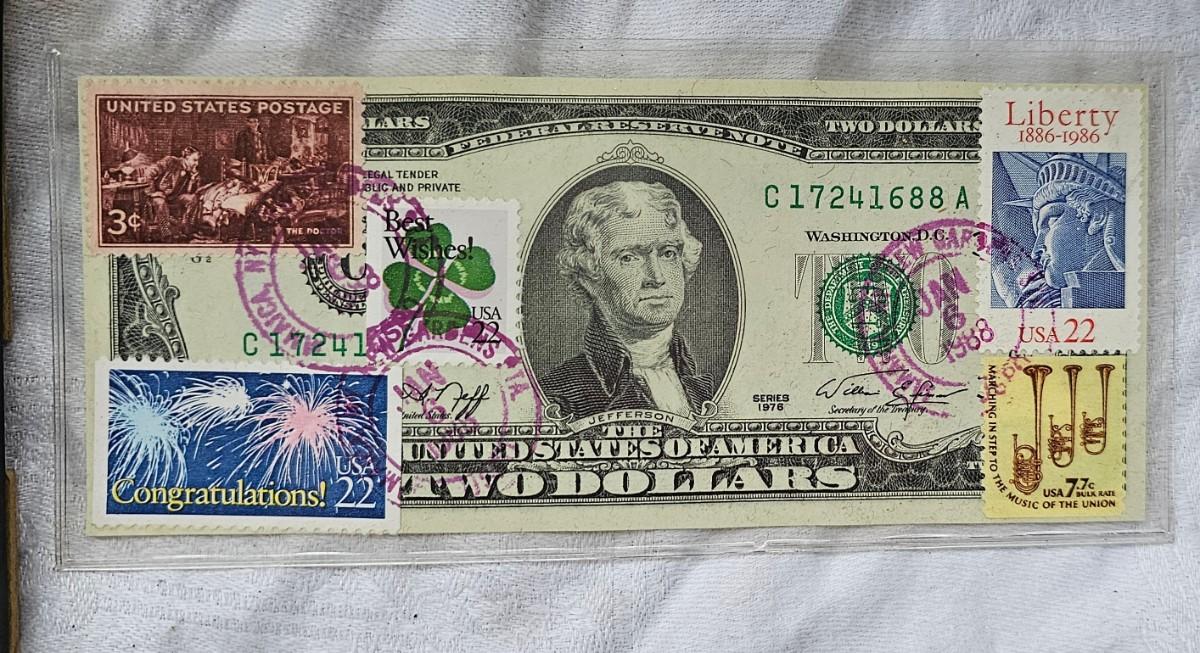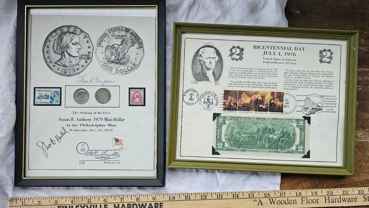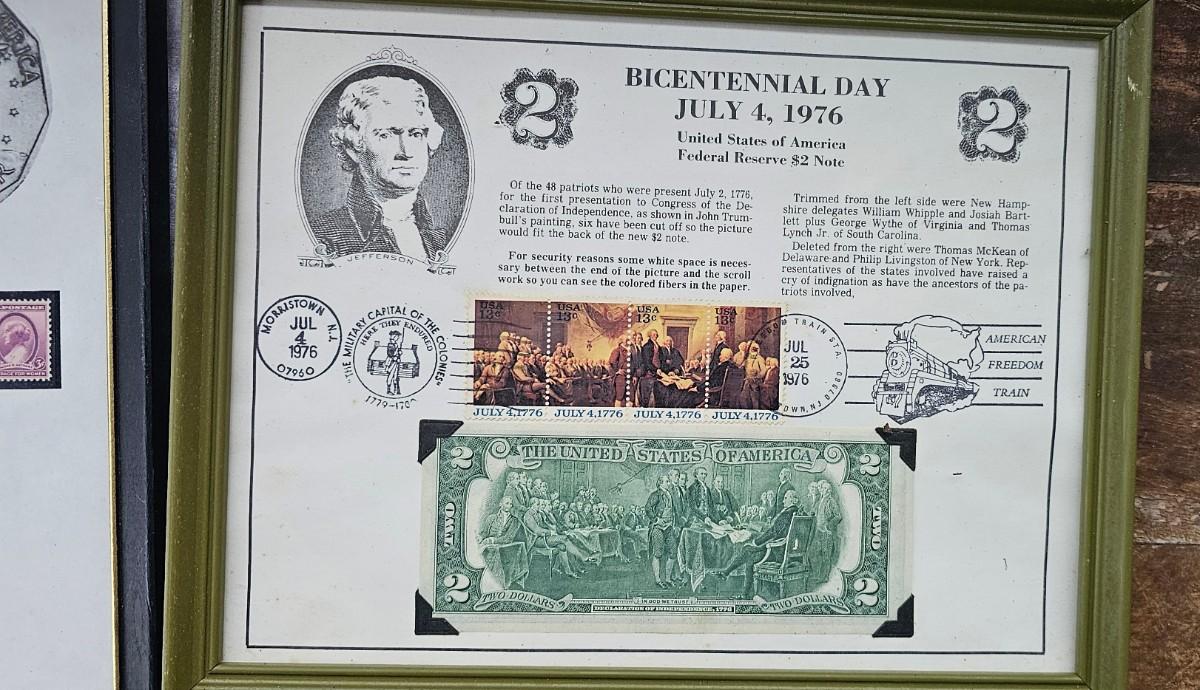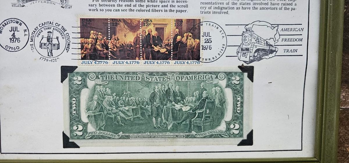 7) Framed Two Dollar Bill with stamps canceled July 4, 1976 for the Bicentennial!