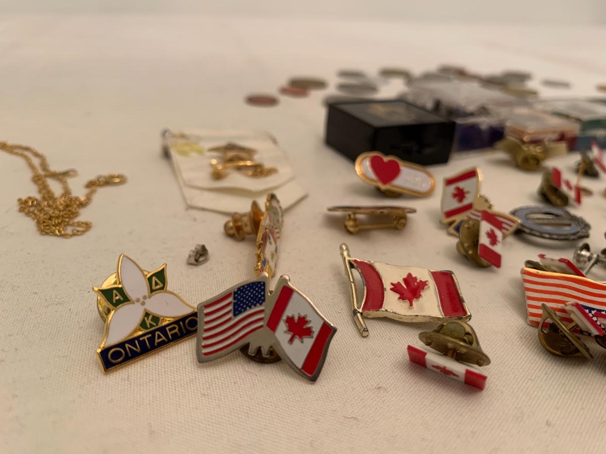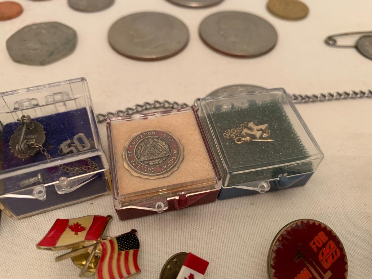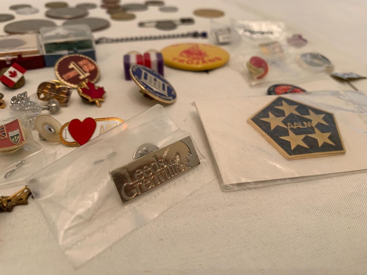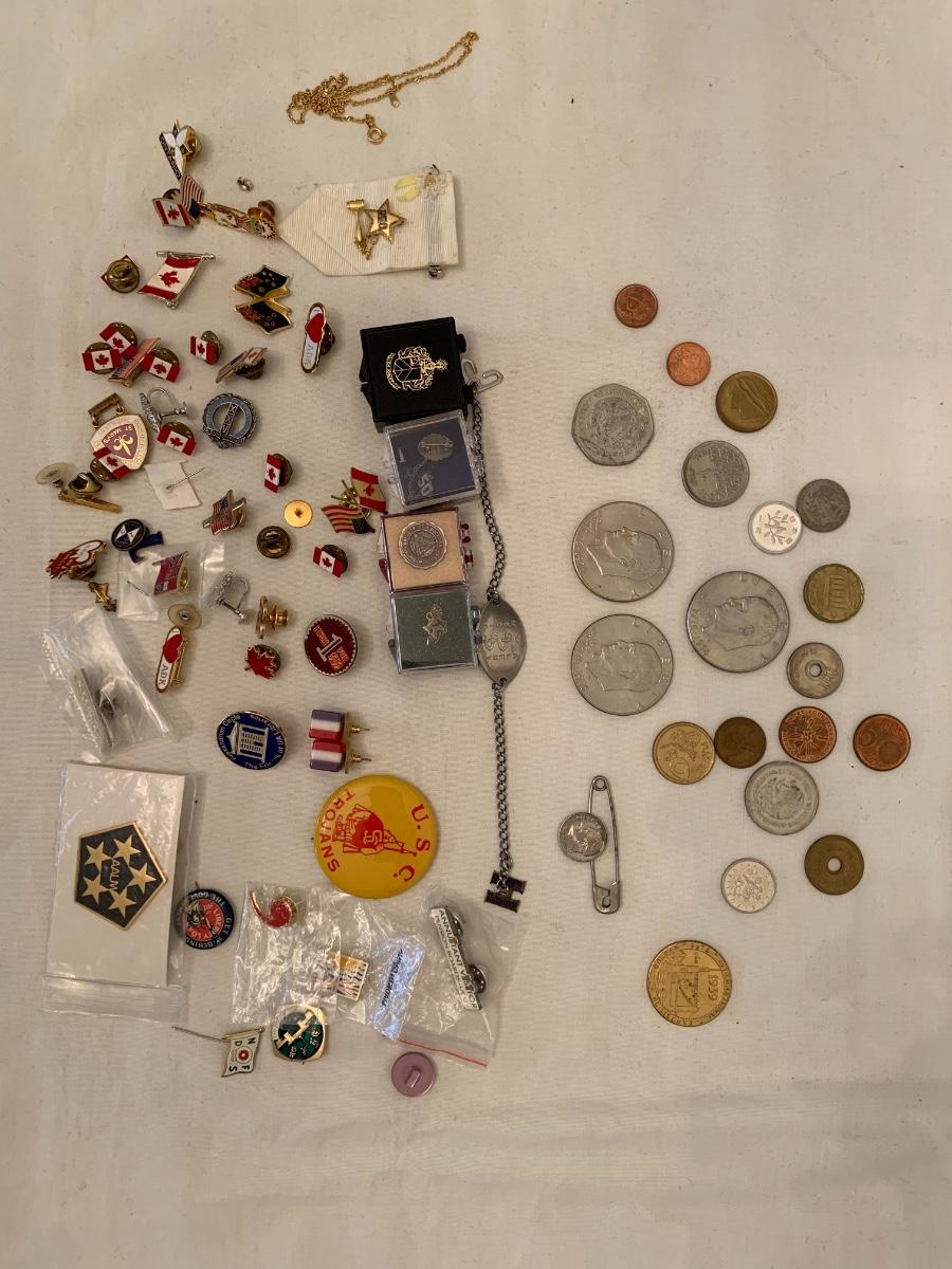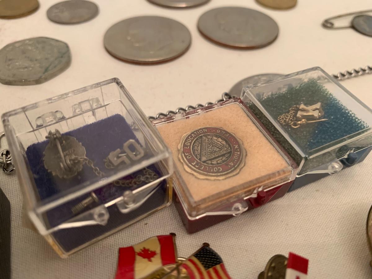 Collection of vintage coins and pins vary. A lot of American / Canadian related pins. Coins are from different countries.