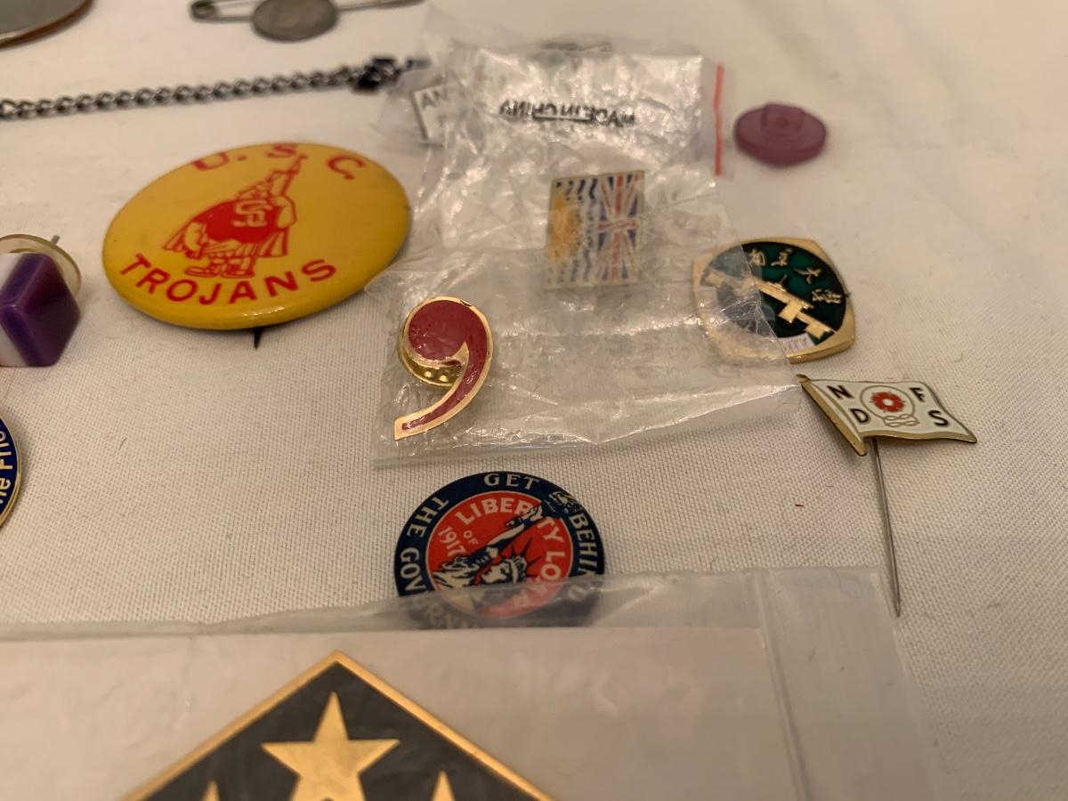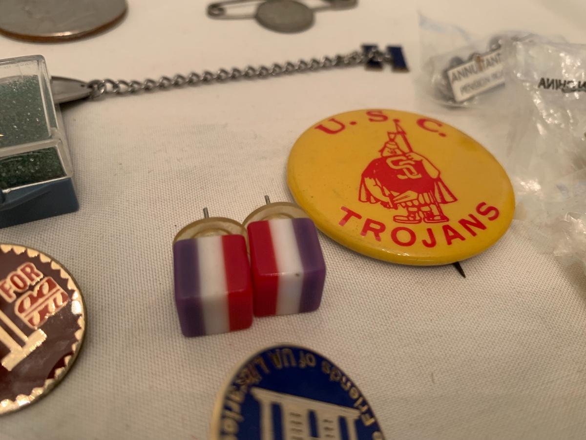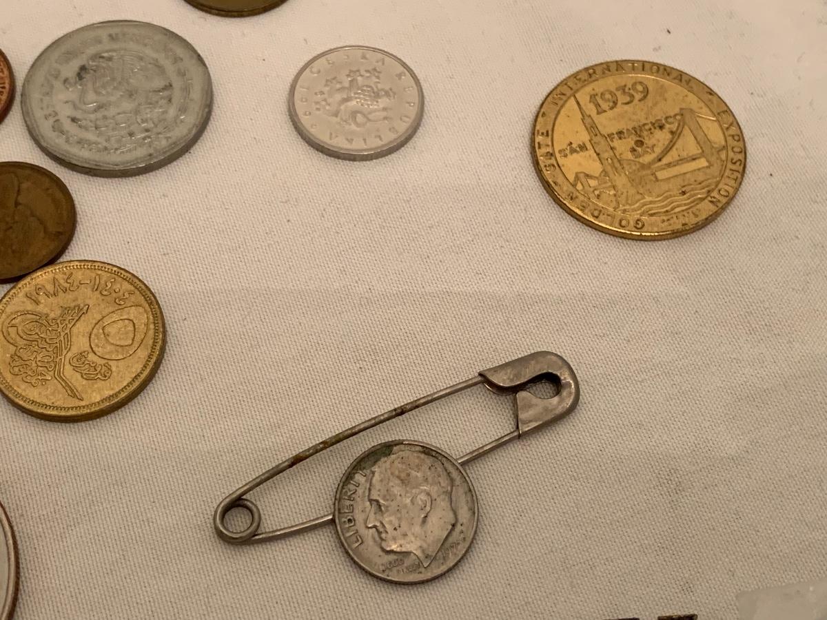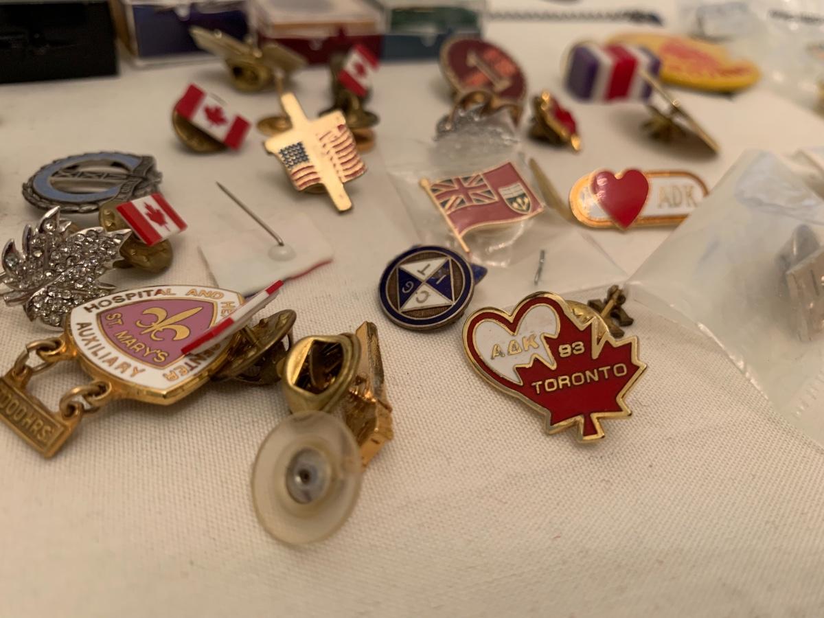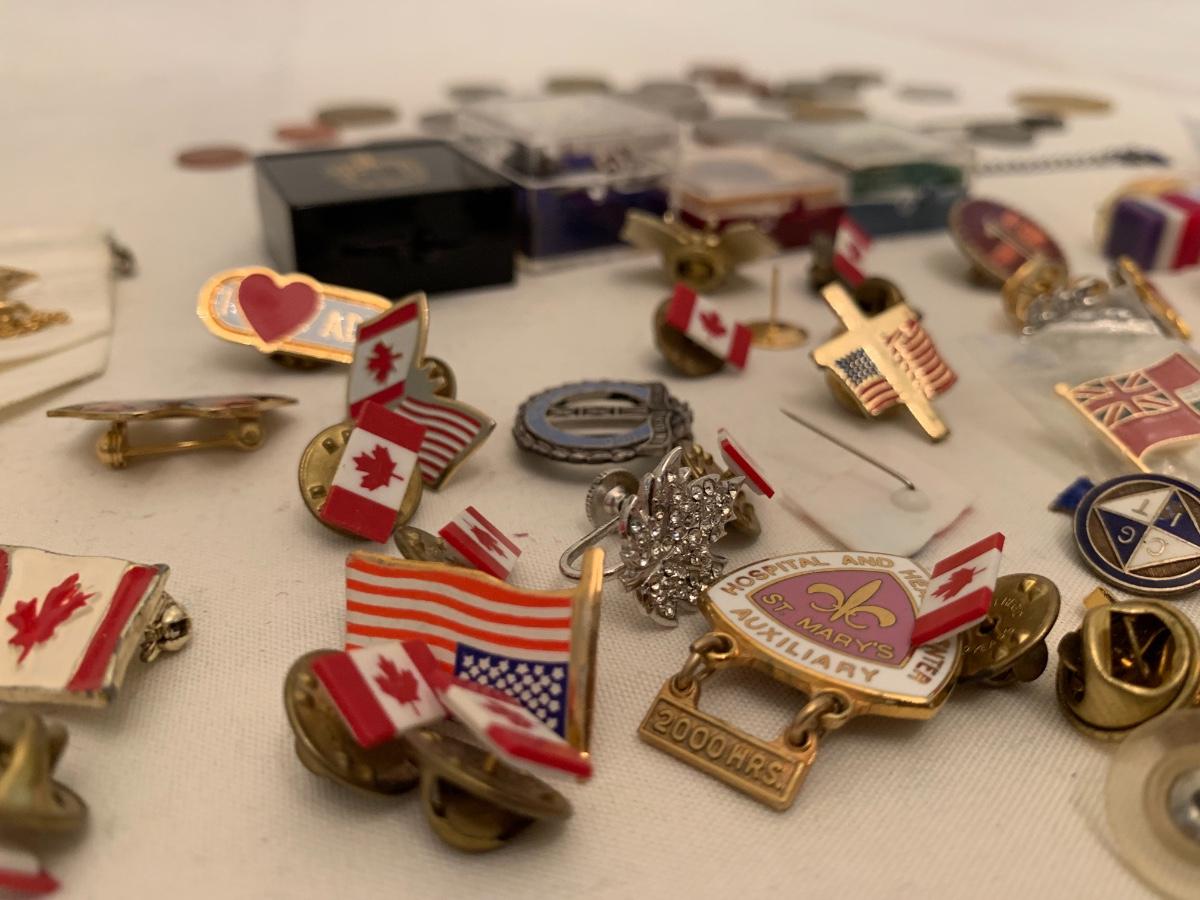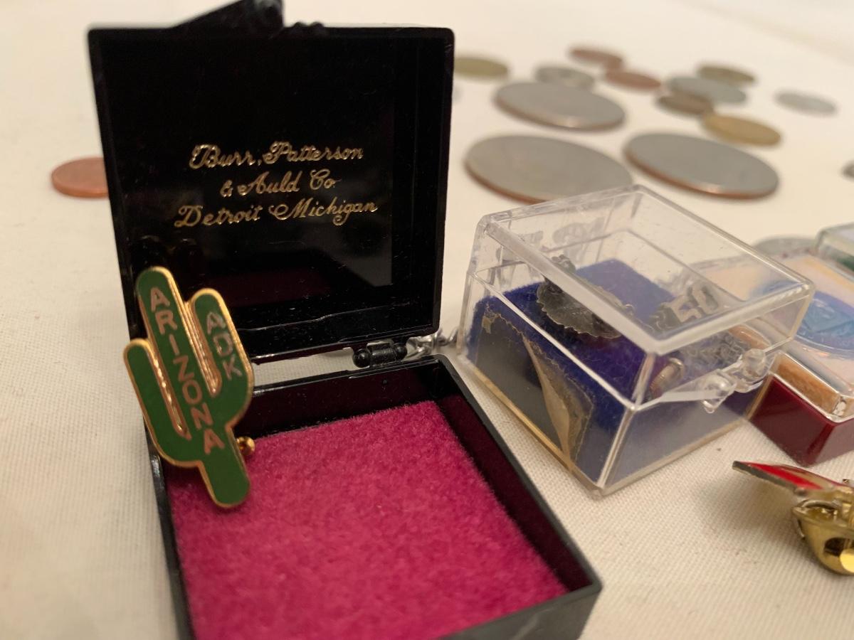 Collection of vintage coins and pins vary. A lot of American / Canadian related pins. Coins are from different countries.