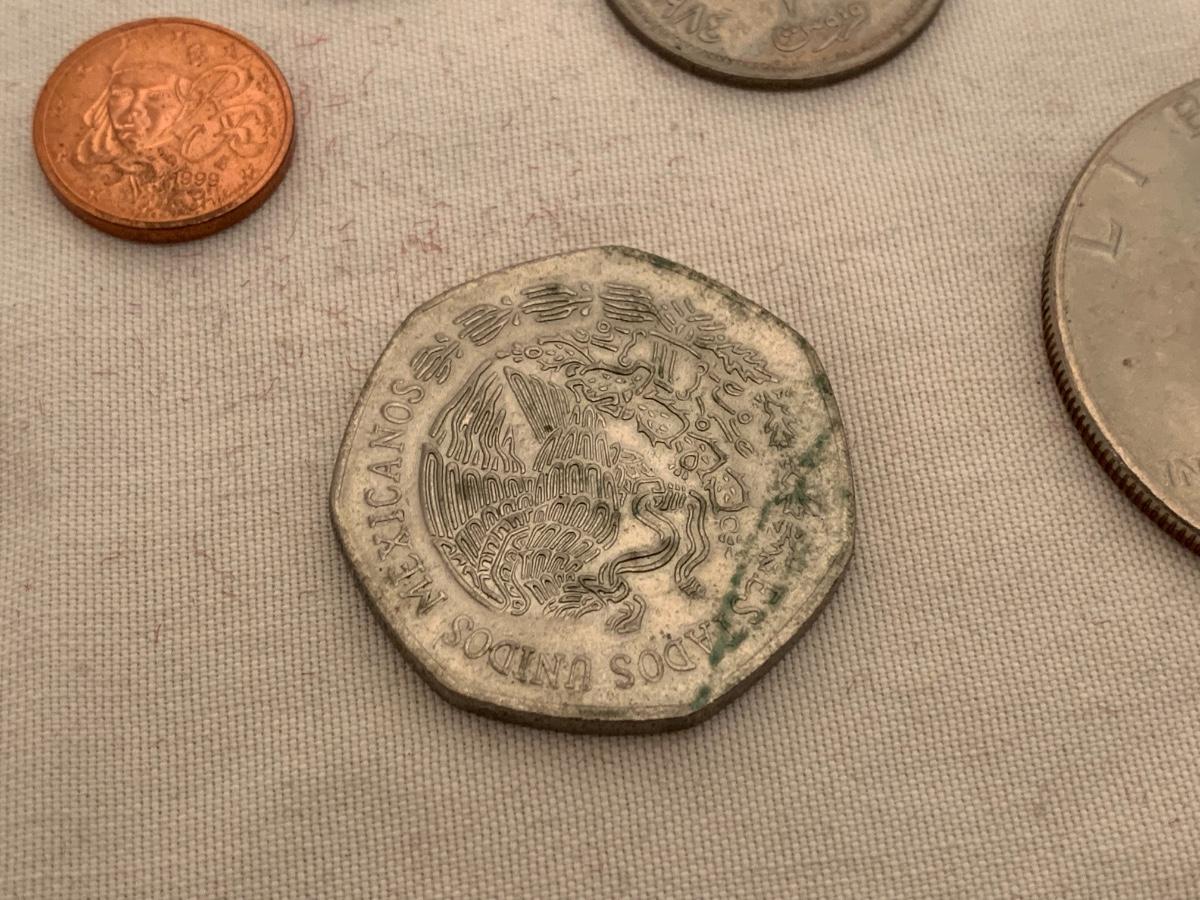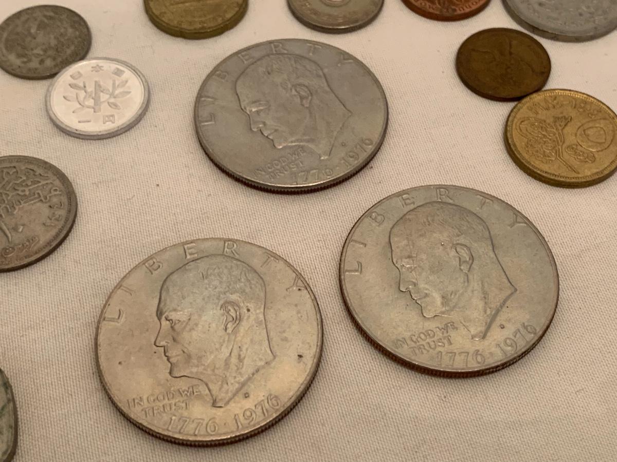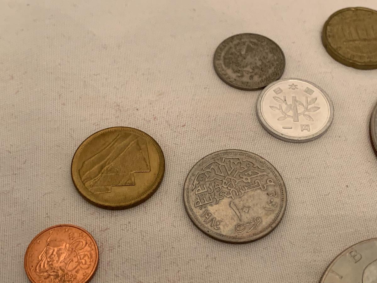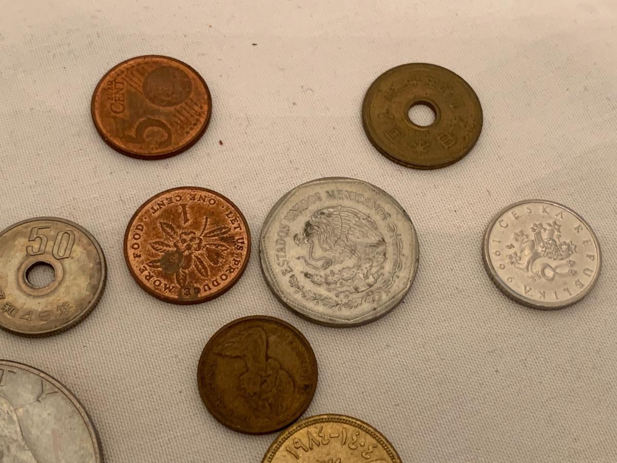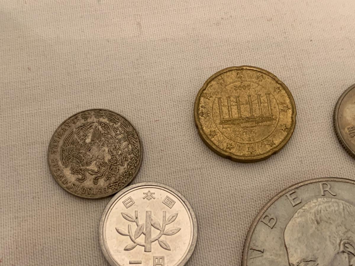 Collection of vintage coins and pins vary. A lot of American / Canadian related pins. Coins are from different countries.