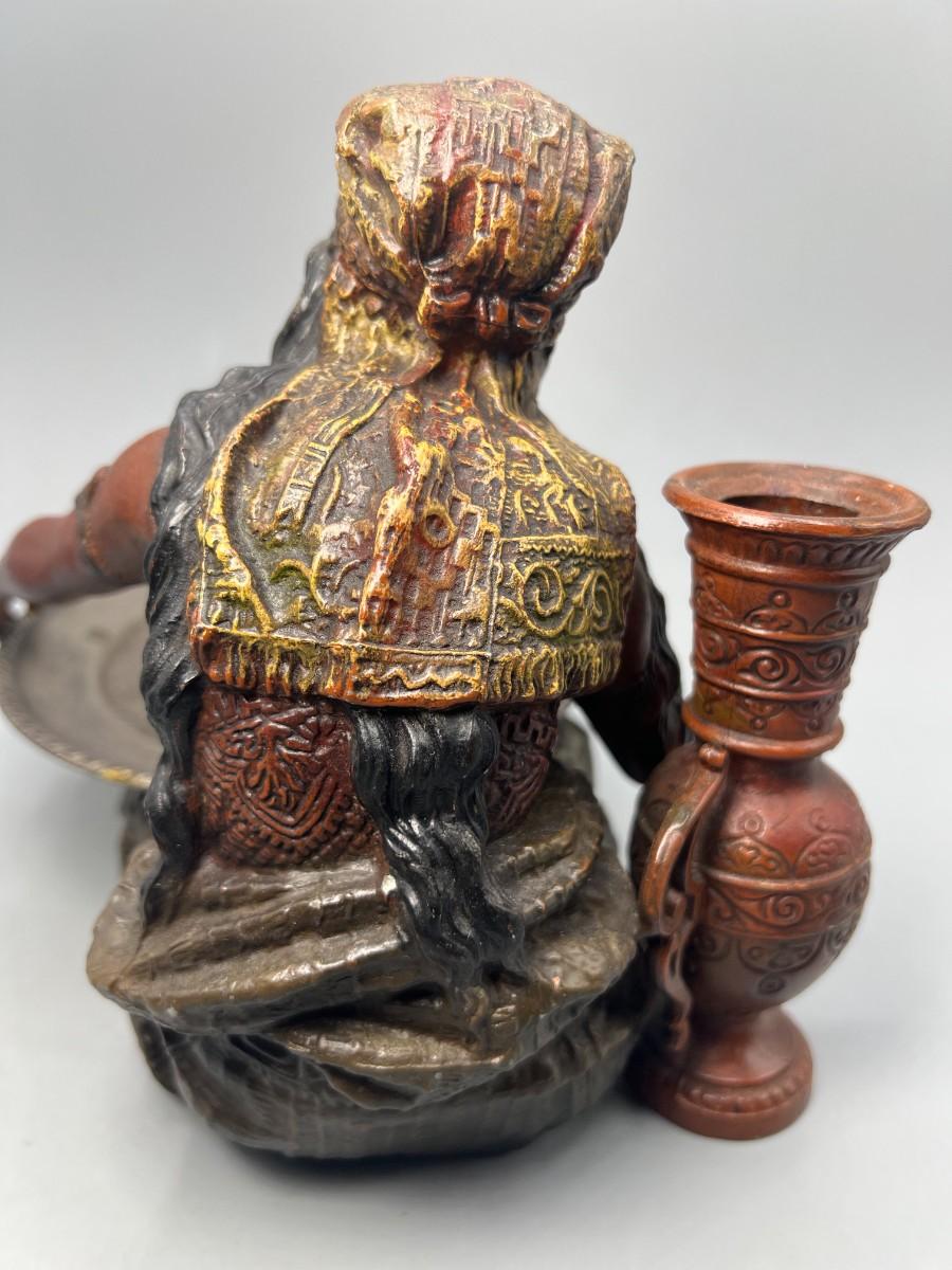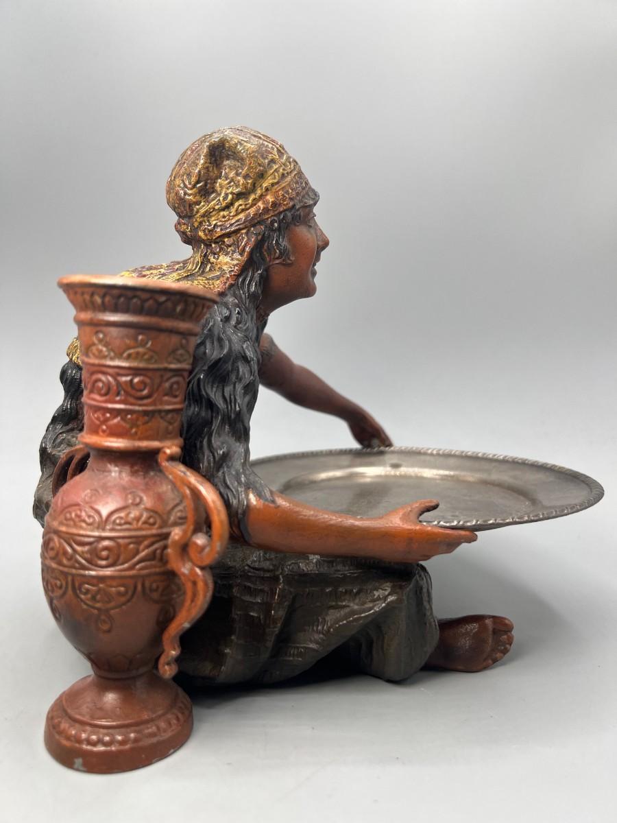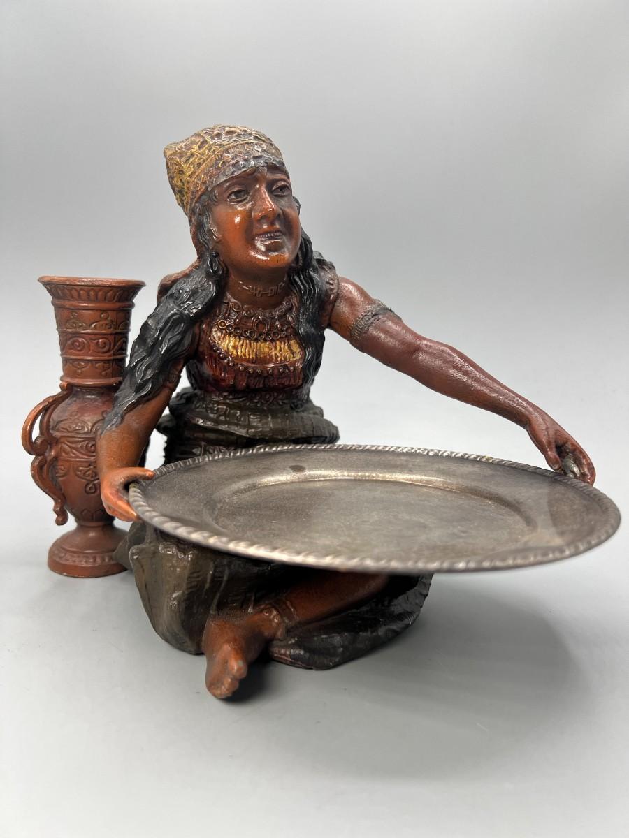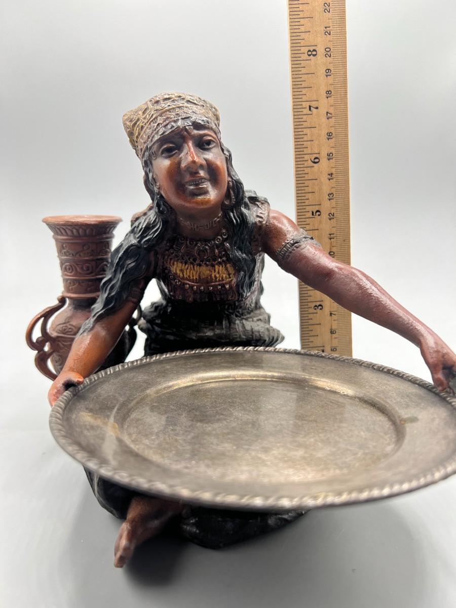 Vintage Cold Painted Arabian Woman Metalware Bronze Art Deco Spelter Statue with Saucer Plate